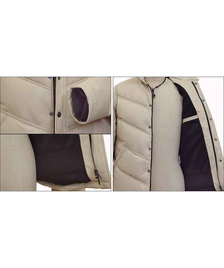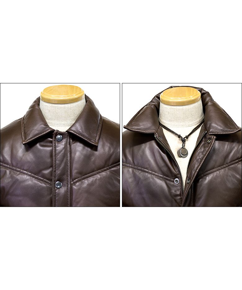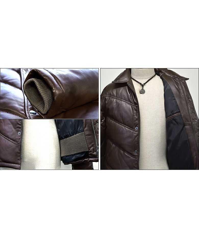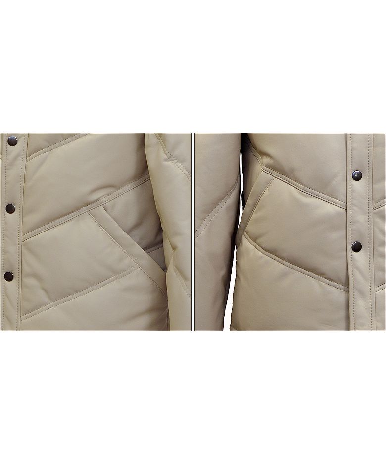 This stylish genuine leather down coat features diagonally designed stitching that eliminates the bulky feel typical of down jackets. Not only is it warm, but it also emphasizes coolness. The luxurious sheen of the elegant genuine lamb leather is also attractive...