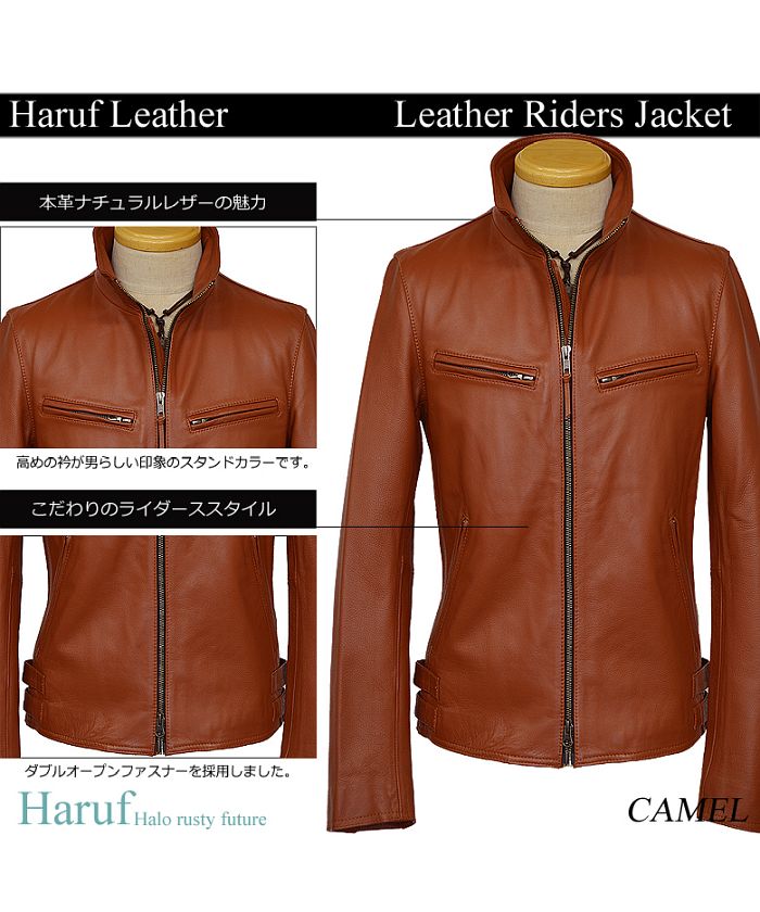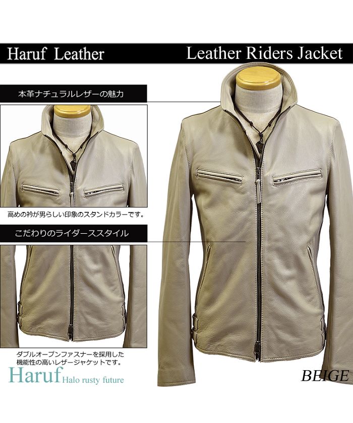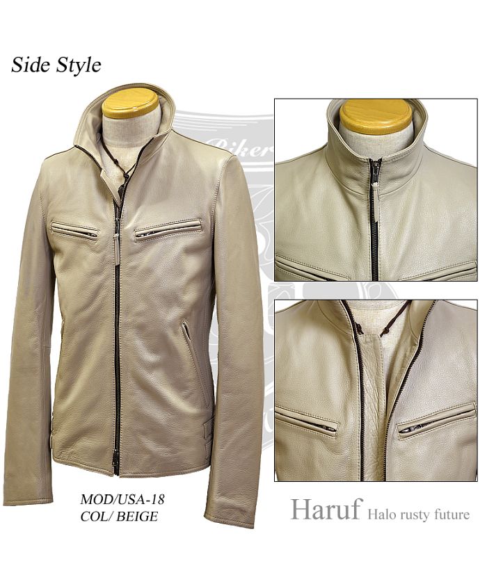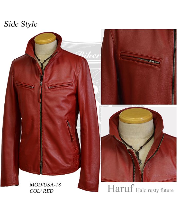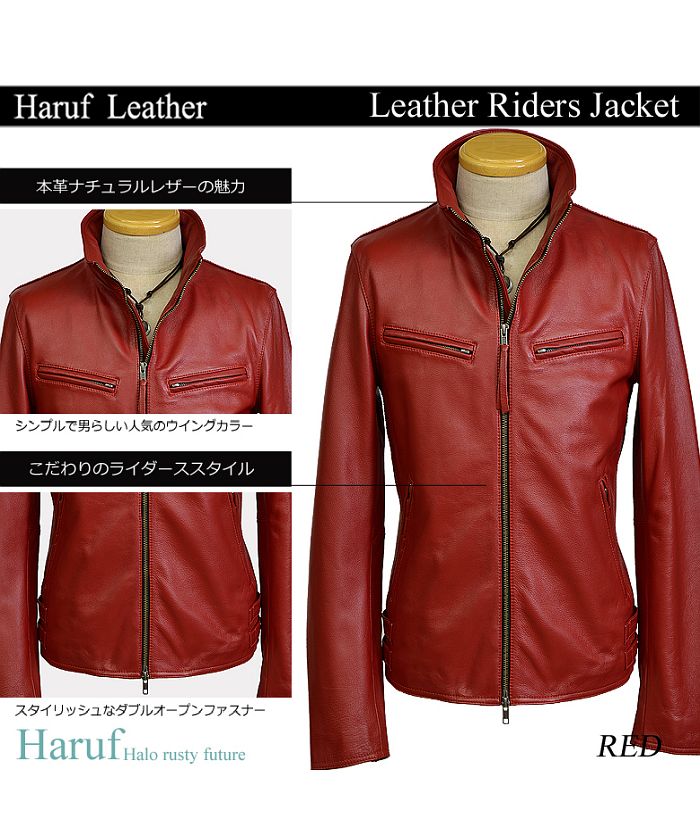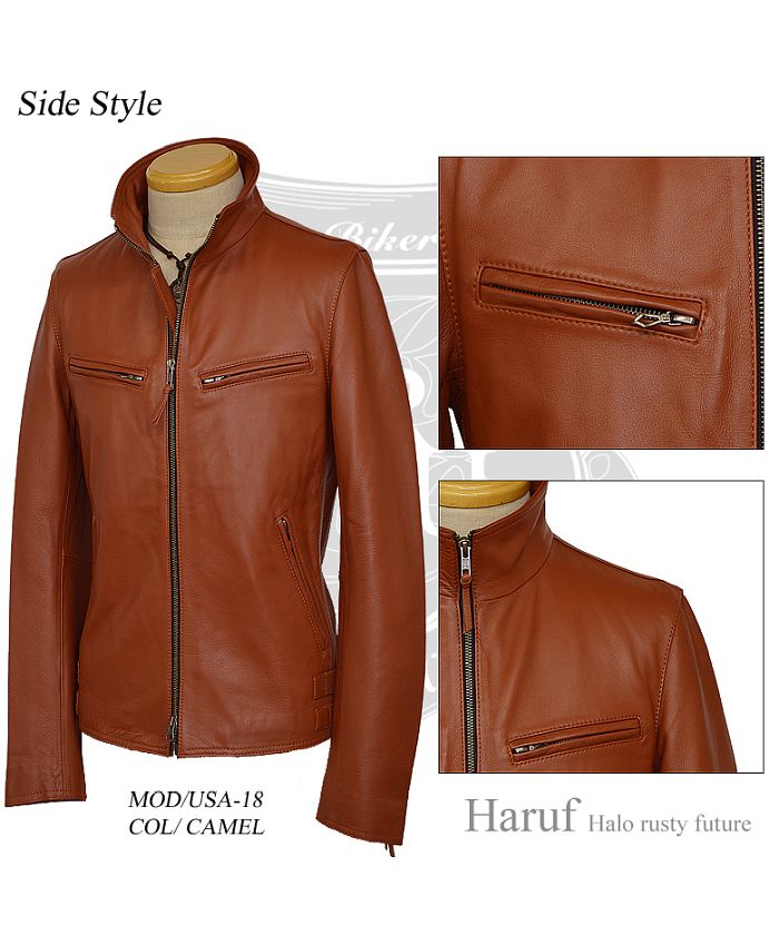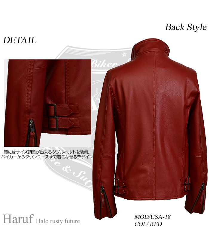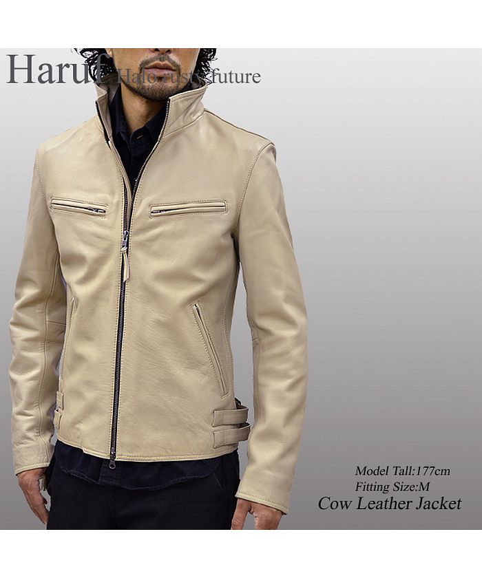 Half Original Genuine Leather Wing Collar Single Riders Jacket! This is a masterpiece that has evolved the Euro-style leather jacket. The high collar is masculine... Pursuing a beautiful silhouette, this leather jacket has undergone numerous trials and errors to always be the star of your outfit. Despite its simple design, it is equipped with essential rider details such as double chest pockets, waist zipper pockets, zipper cuffs, a size-adjustable double belt at the waist, and a wind flap under the front zipper. This single riders jacket is perfect for both bikers and town use. Additionally, the front zipper is a double-opening type, allowing you to alleviate any bulkiness around the abdomen when sitting by opening the lower zipper.