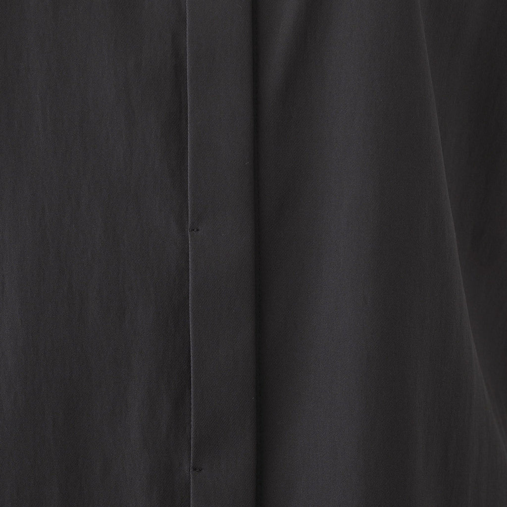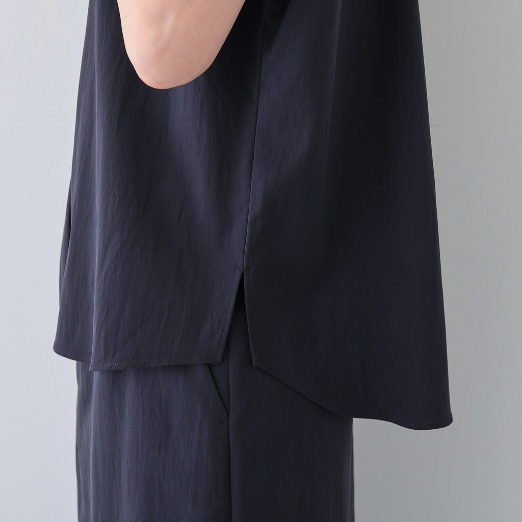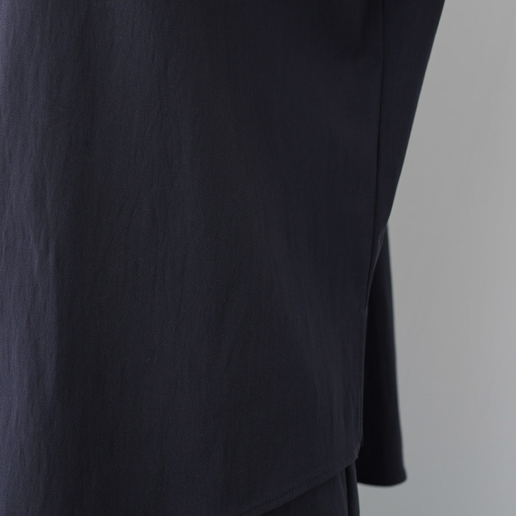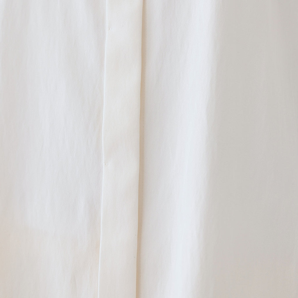 When pairing it with a skirt made of the same material, it is currently recommended to style it by only unbuttoning the bottom button of the blouse and tucking in just the front.