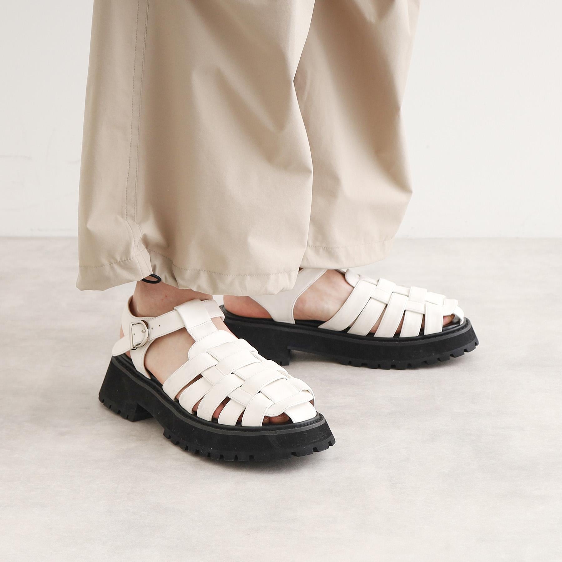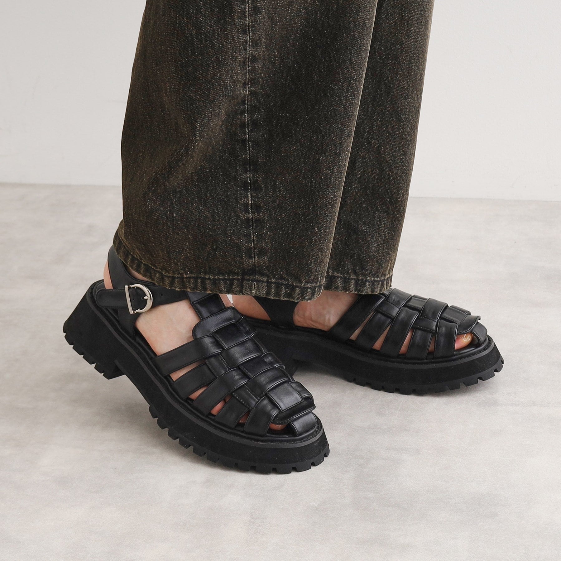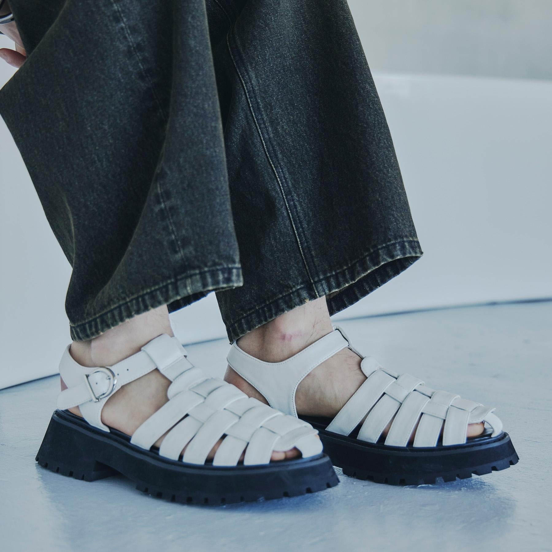 Gurke sandals featuring a voluminous chunky sole and a design with a complex crisscrossed upper.