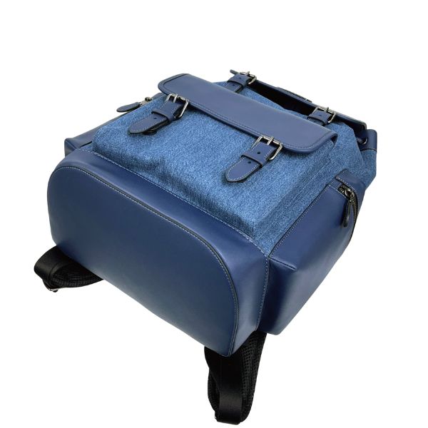 This backpack features eco-friendly denim material and a sophisticated design, making it stylish.
