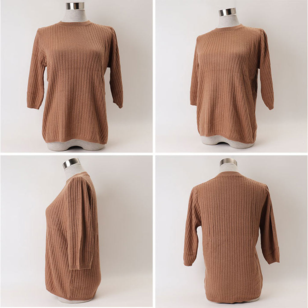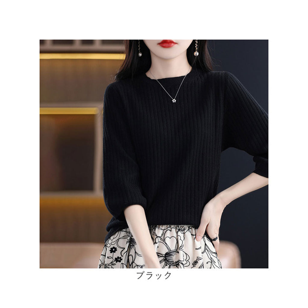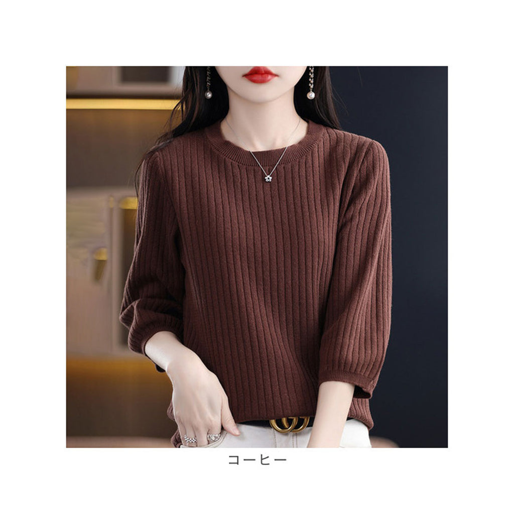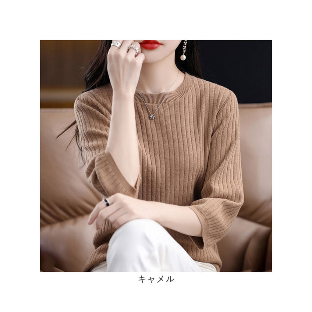 ・ワンカラーで様々なコーデに使える♪シンプルな七分袖のリブ編みTシャツ。