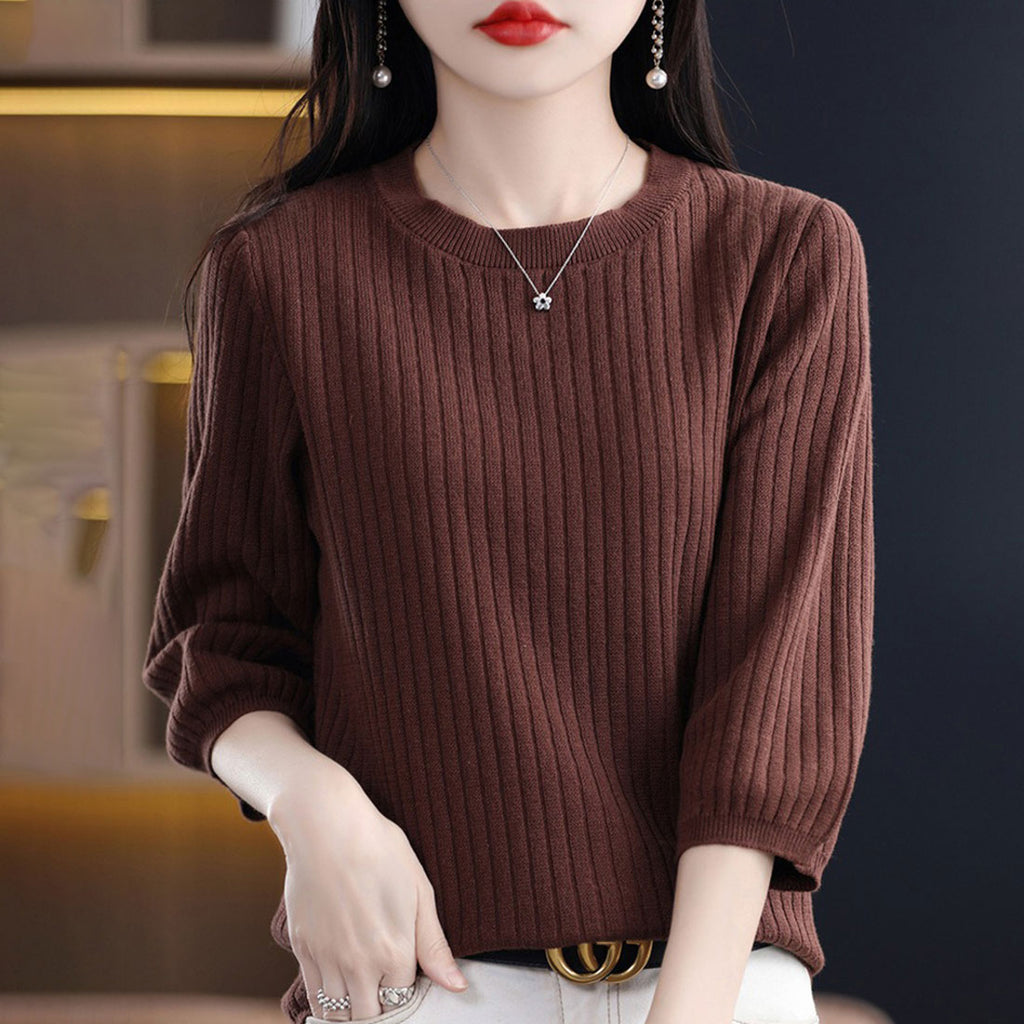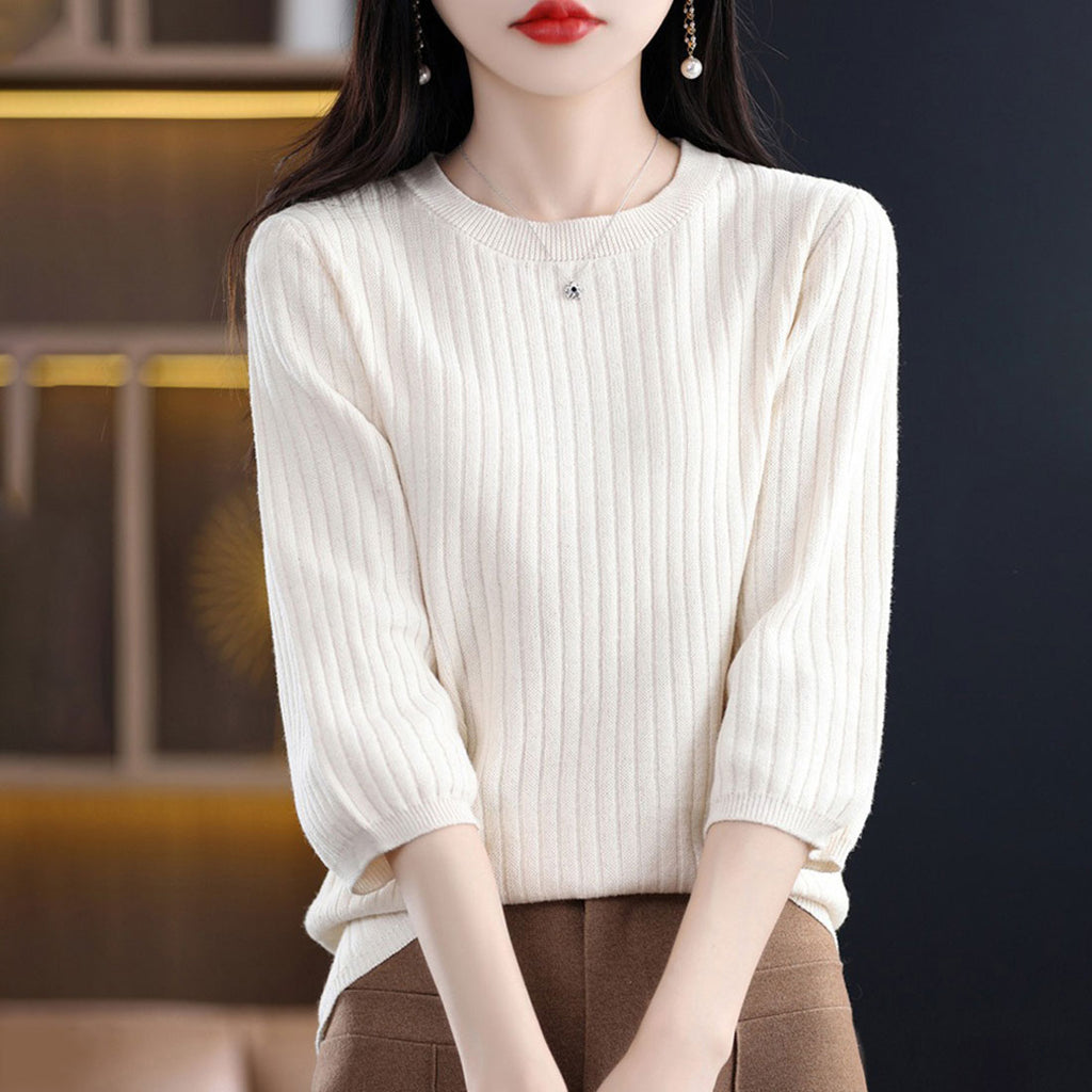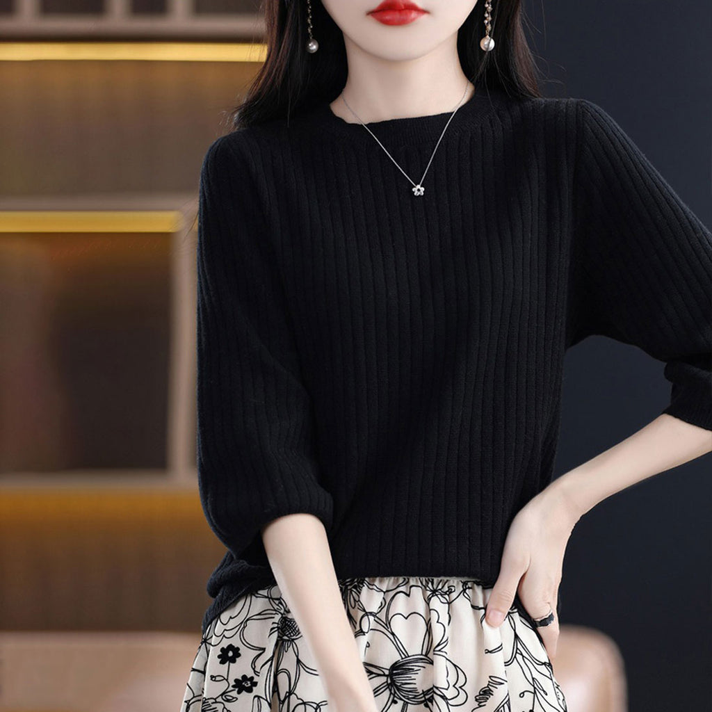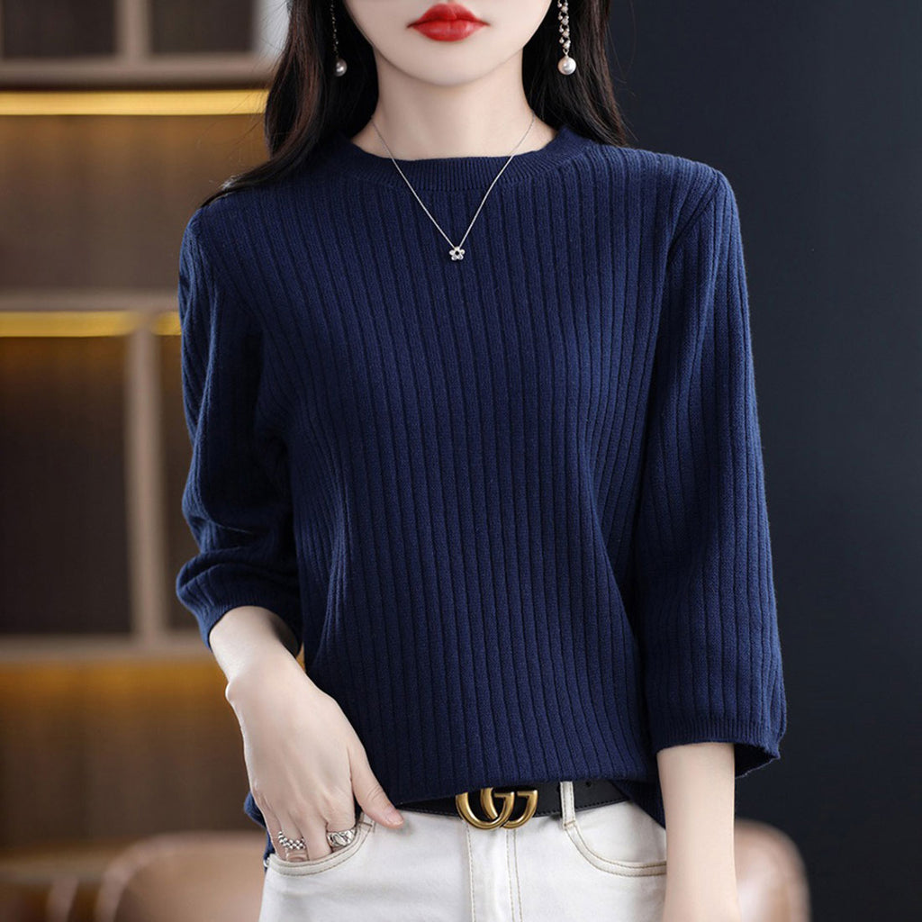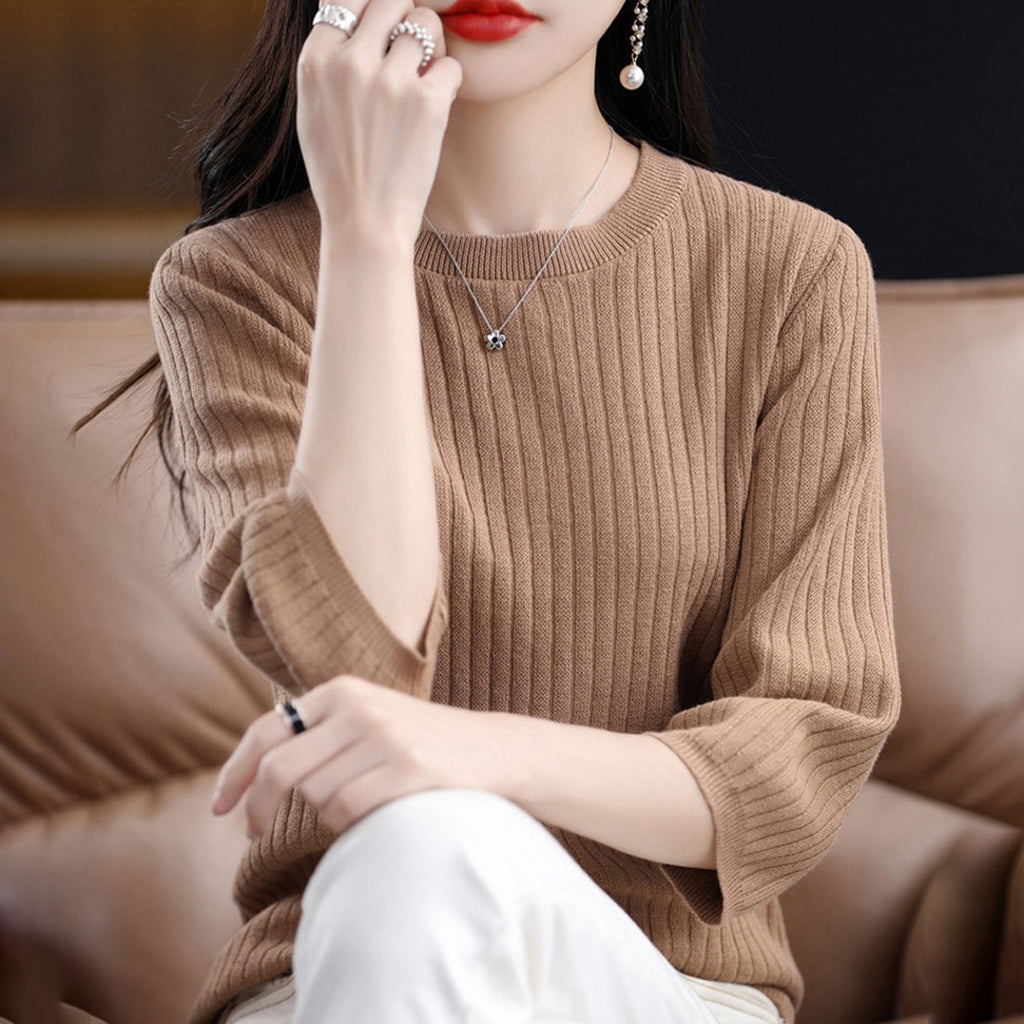 ・ワンカラーで様々なコーデに使える♪シンプルな七分袖のリブ編みTシャツ。