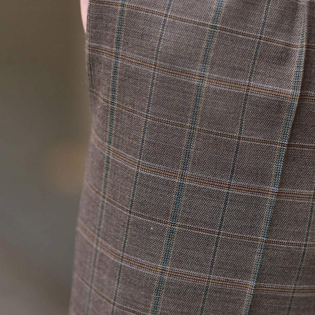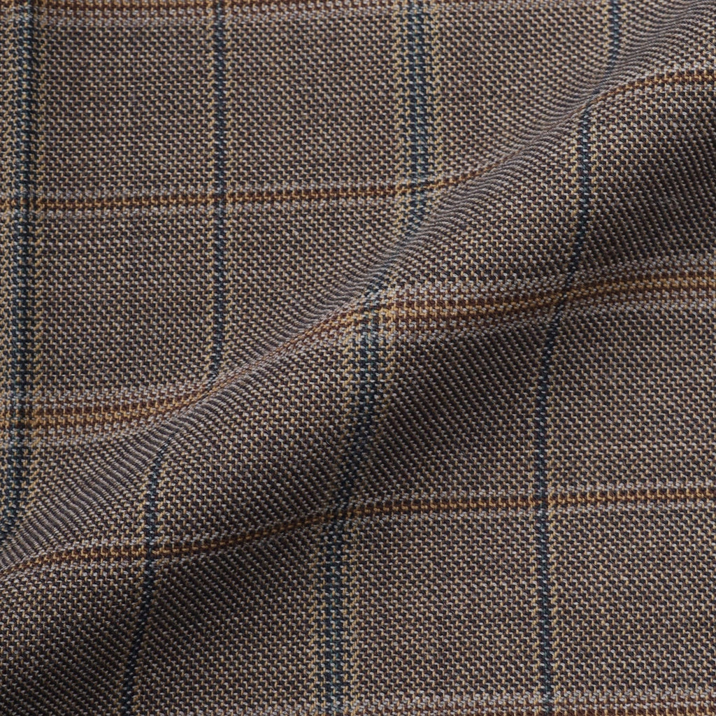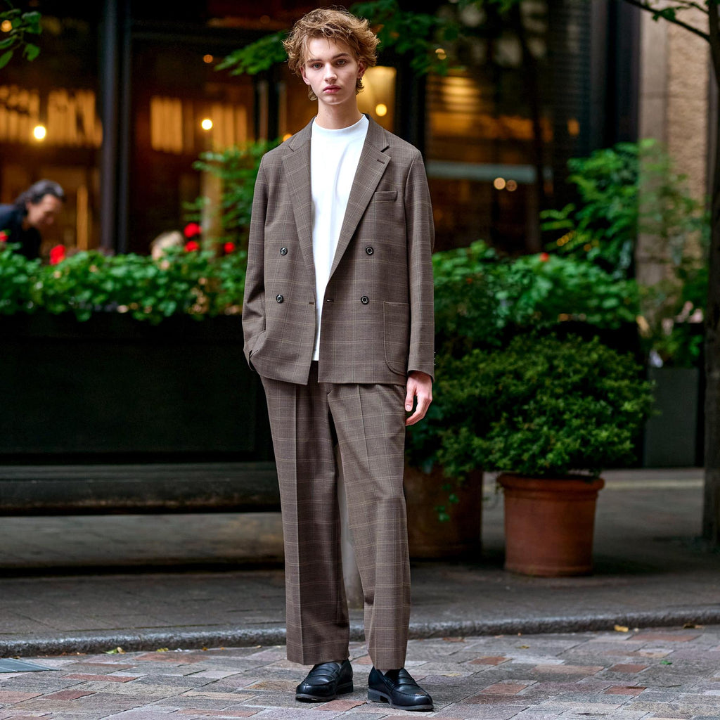 The brown check pattern is woven by combining five dyed yarn colors, adding a modern nuance to a classic atmosphere.