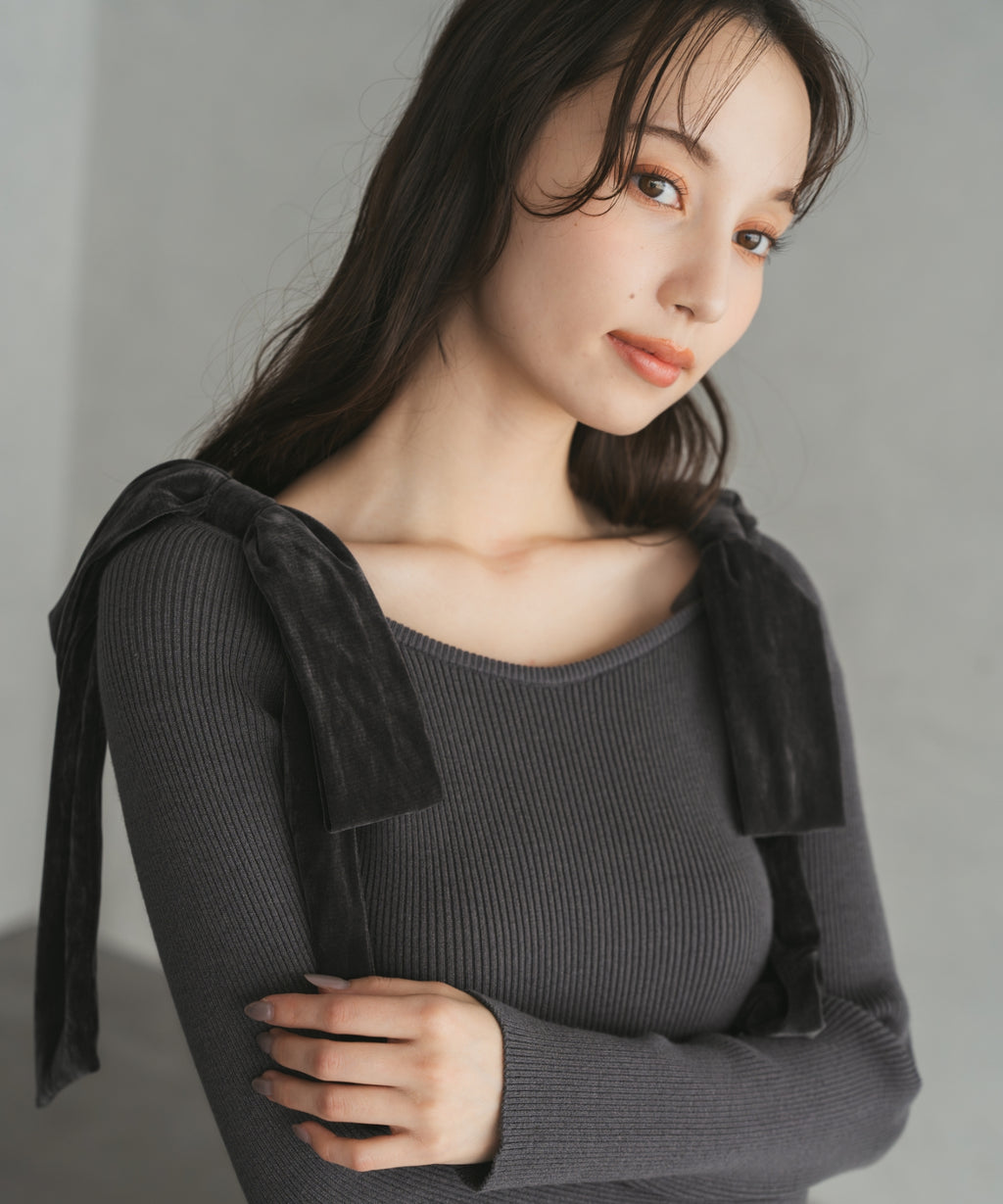 A velour ribbon with a brushed texture adds a cute accent to the knit.