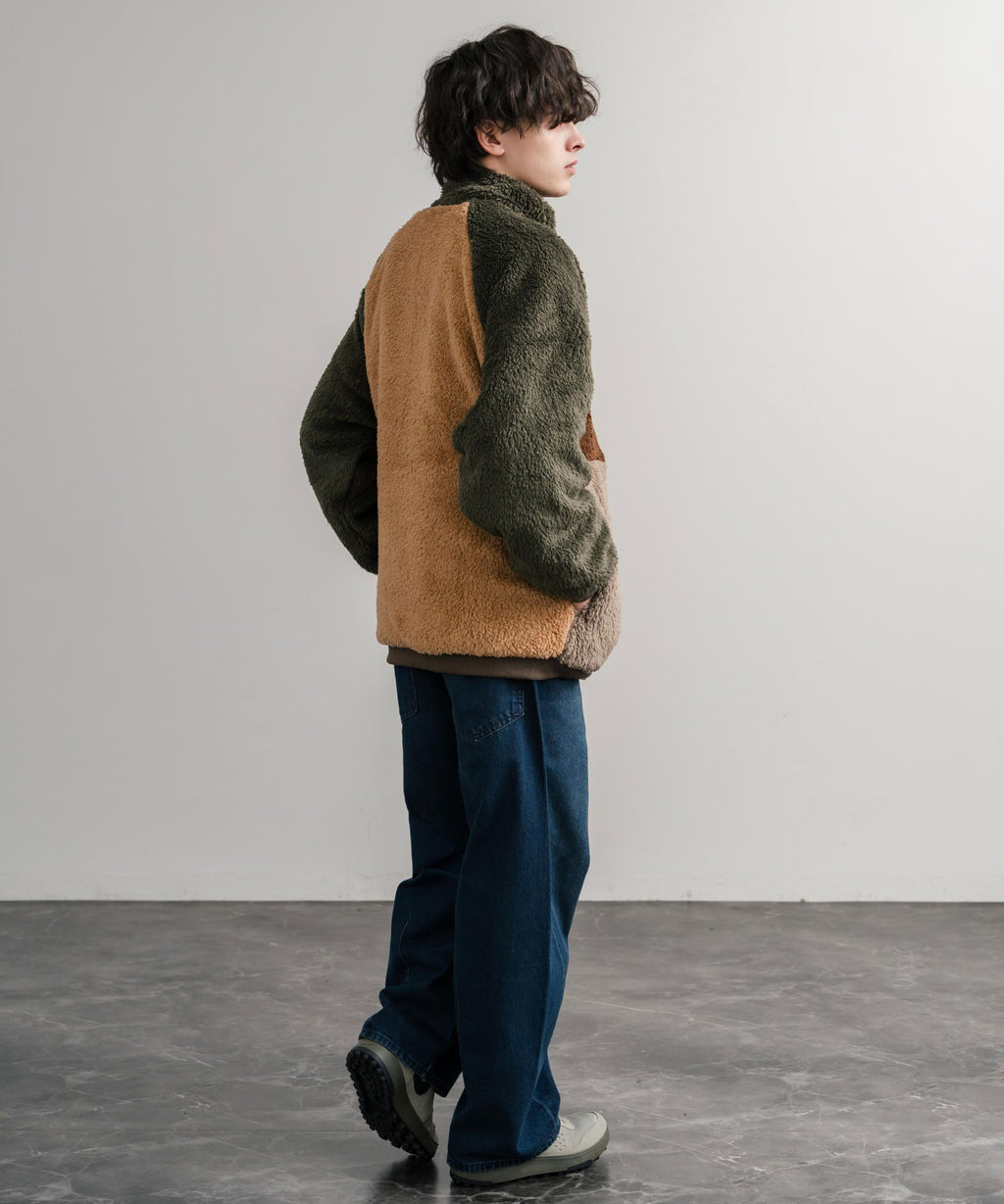 The shiny side with a logo embroidery on the chest serves as an accent, and the other side features a boa fleece with a zipper pocket made of different materials on the chest.