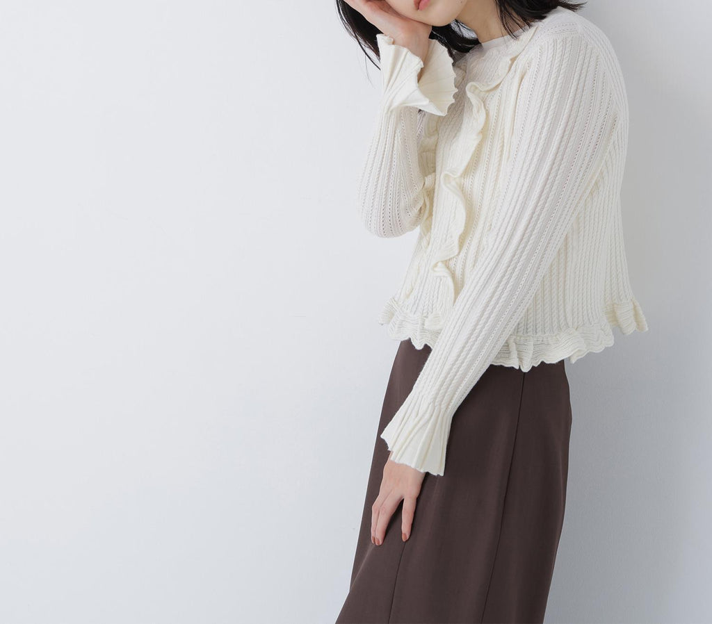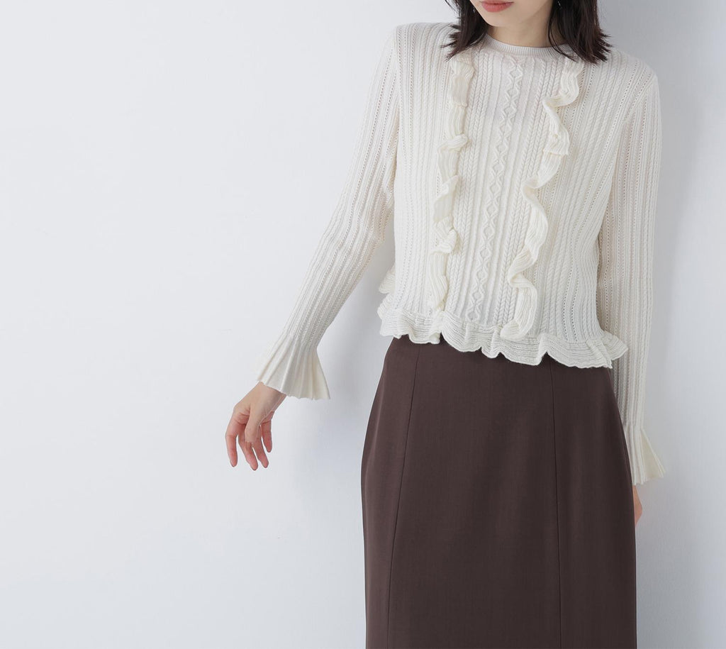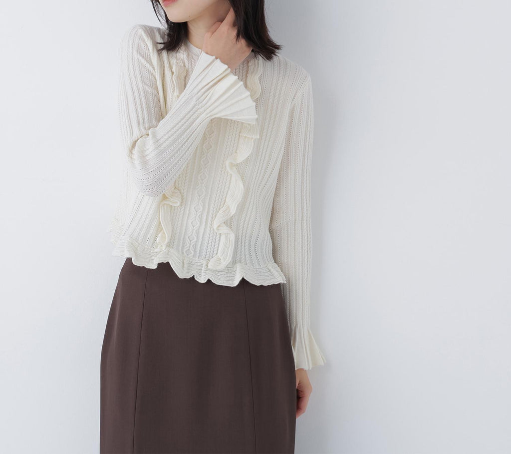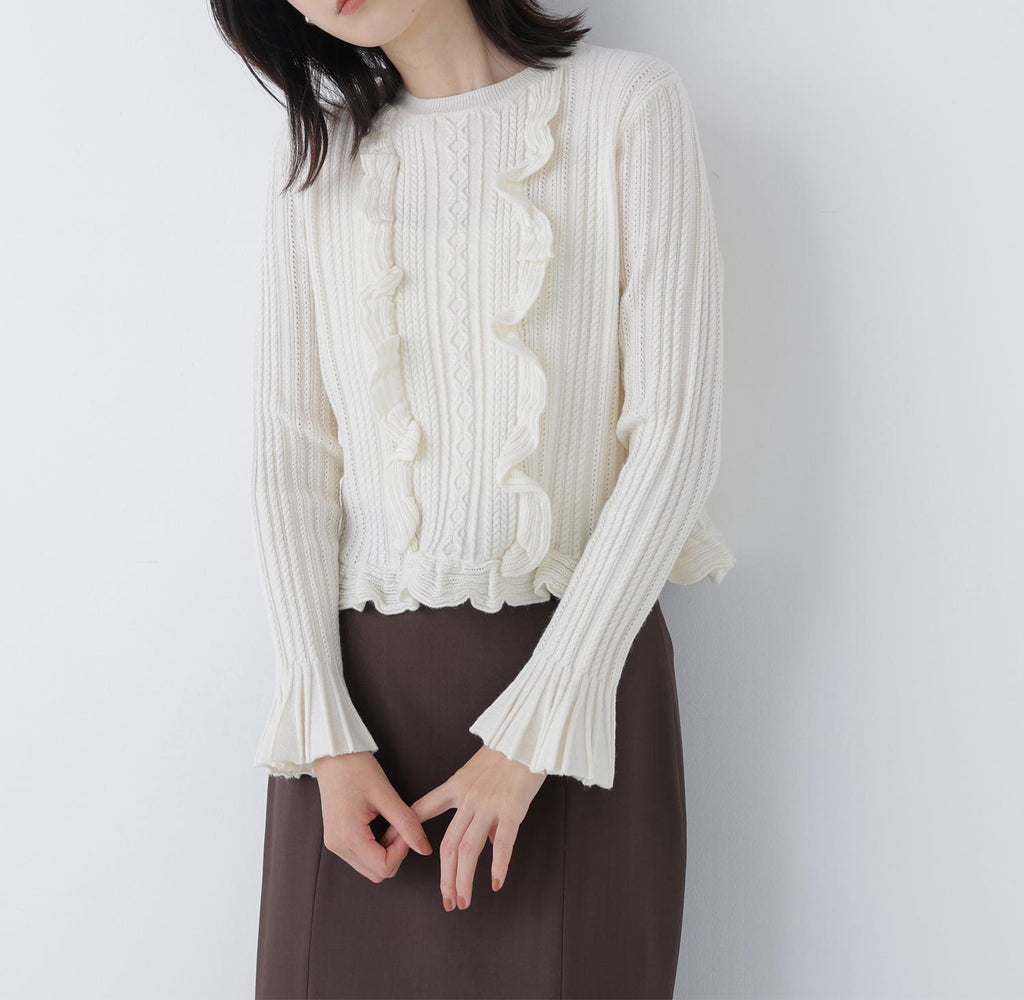 The delicate cable pattern is an elegant knit. It has a length that looks good even without tucking it into the Waist. The frills on the sleeves and hem are an accent. The open neckline gives a clean impression. This item allows you to incorporate a spring-like Color a bit earlier.
