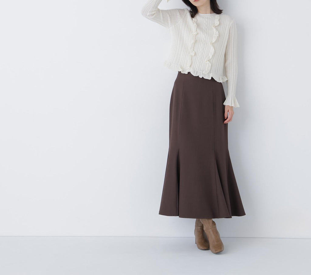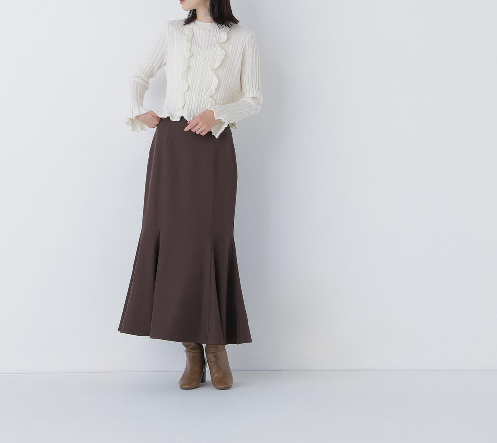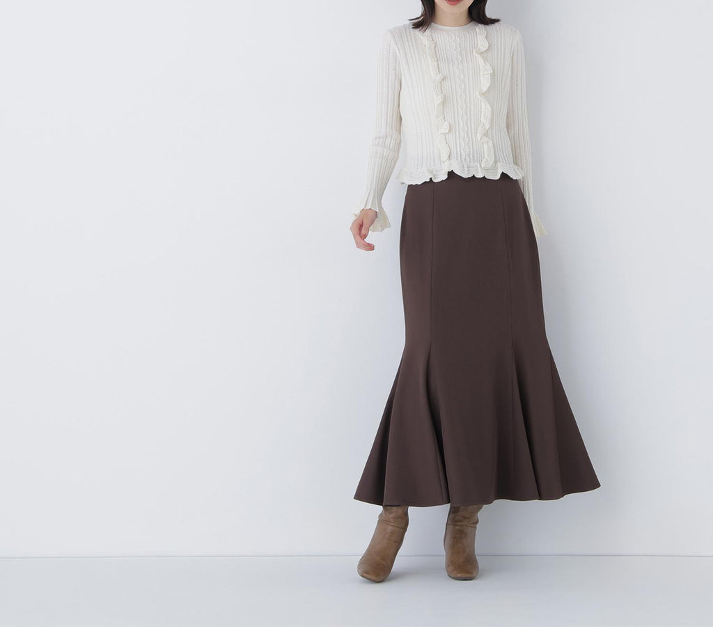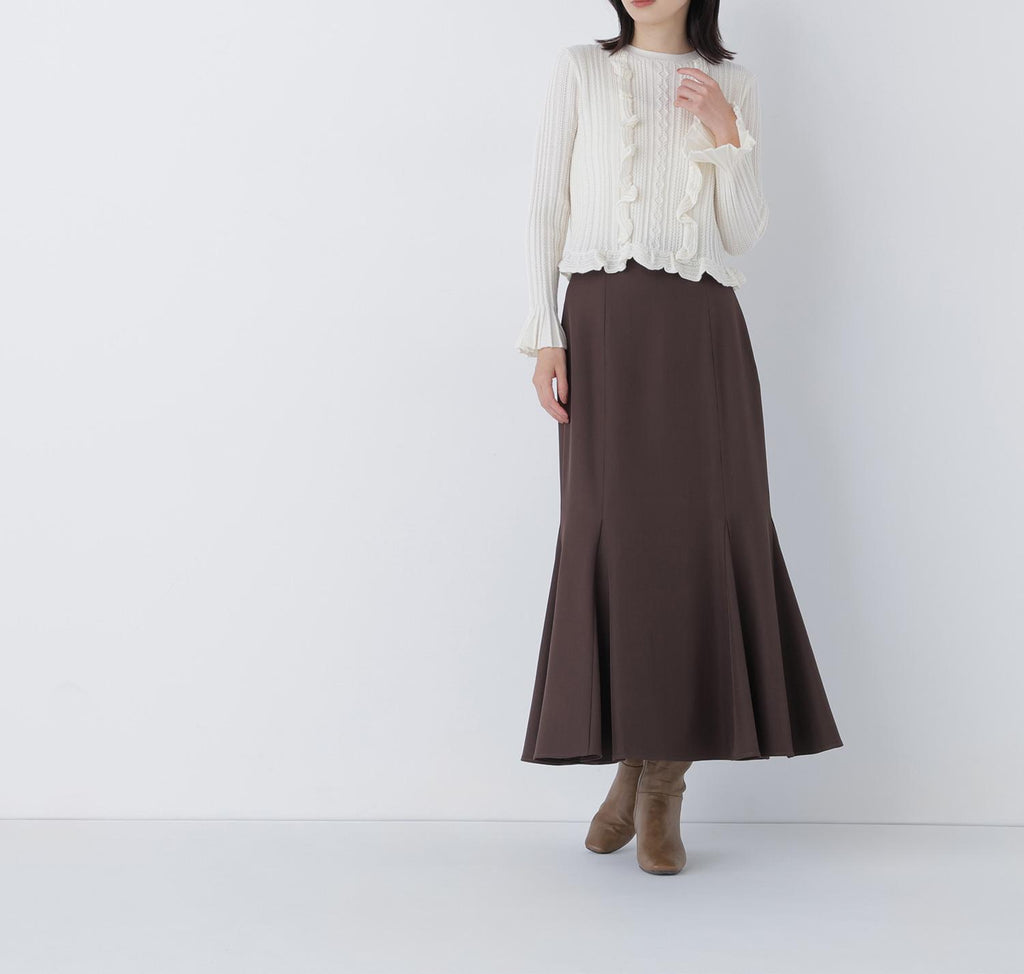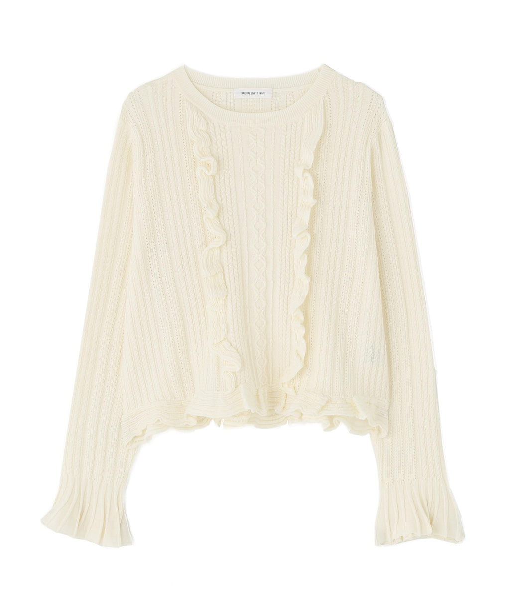The delicate cable pattern is an elegant knit. It has a length that looks good even without tucking it into the Waist. The frills on the sleeves and hem are an accent. The open neckline gives a clean impression. This item allows you to incorporate a spring-like Color a bit earlier.