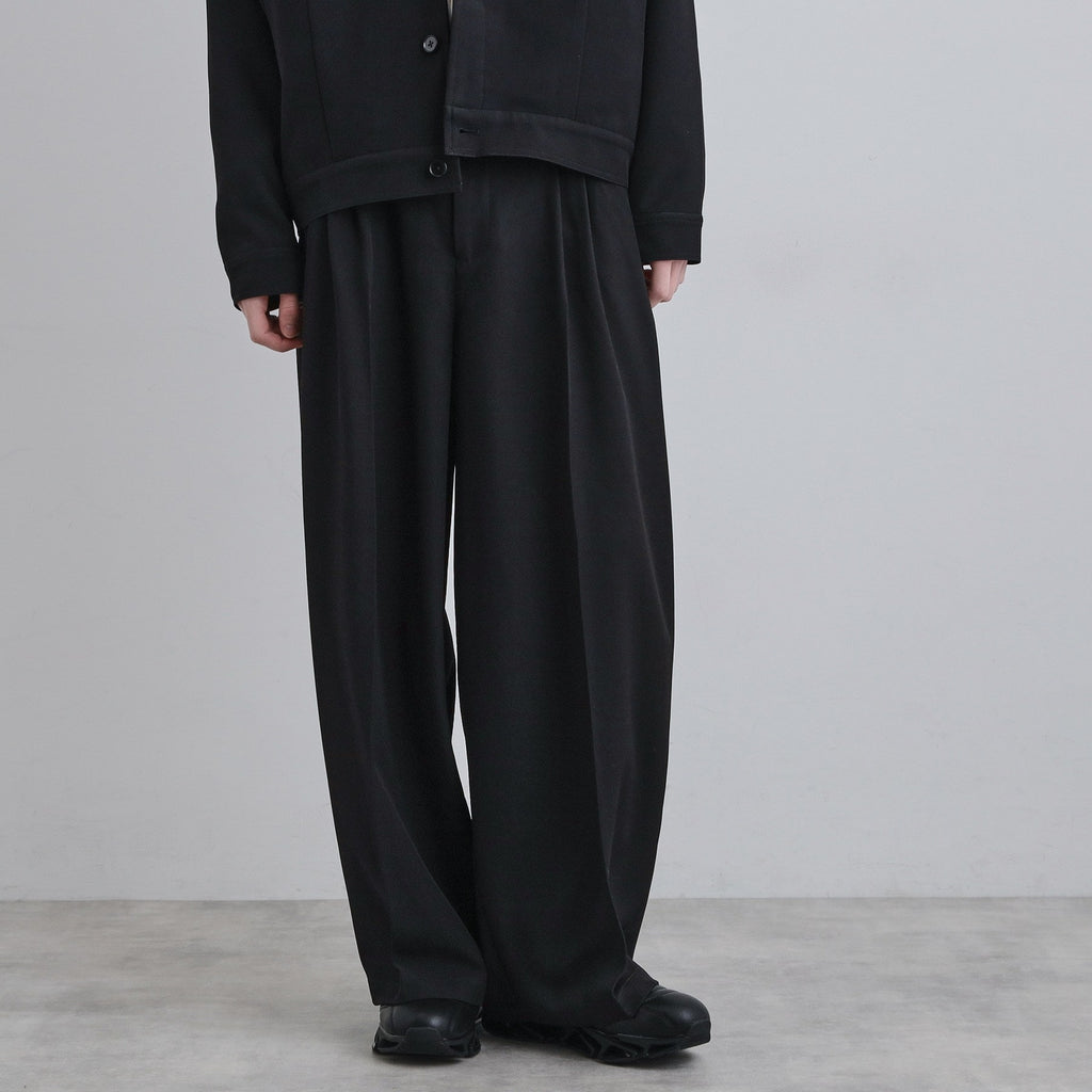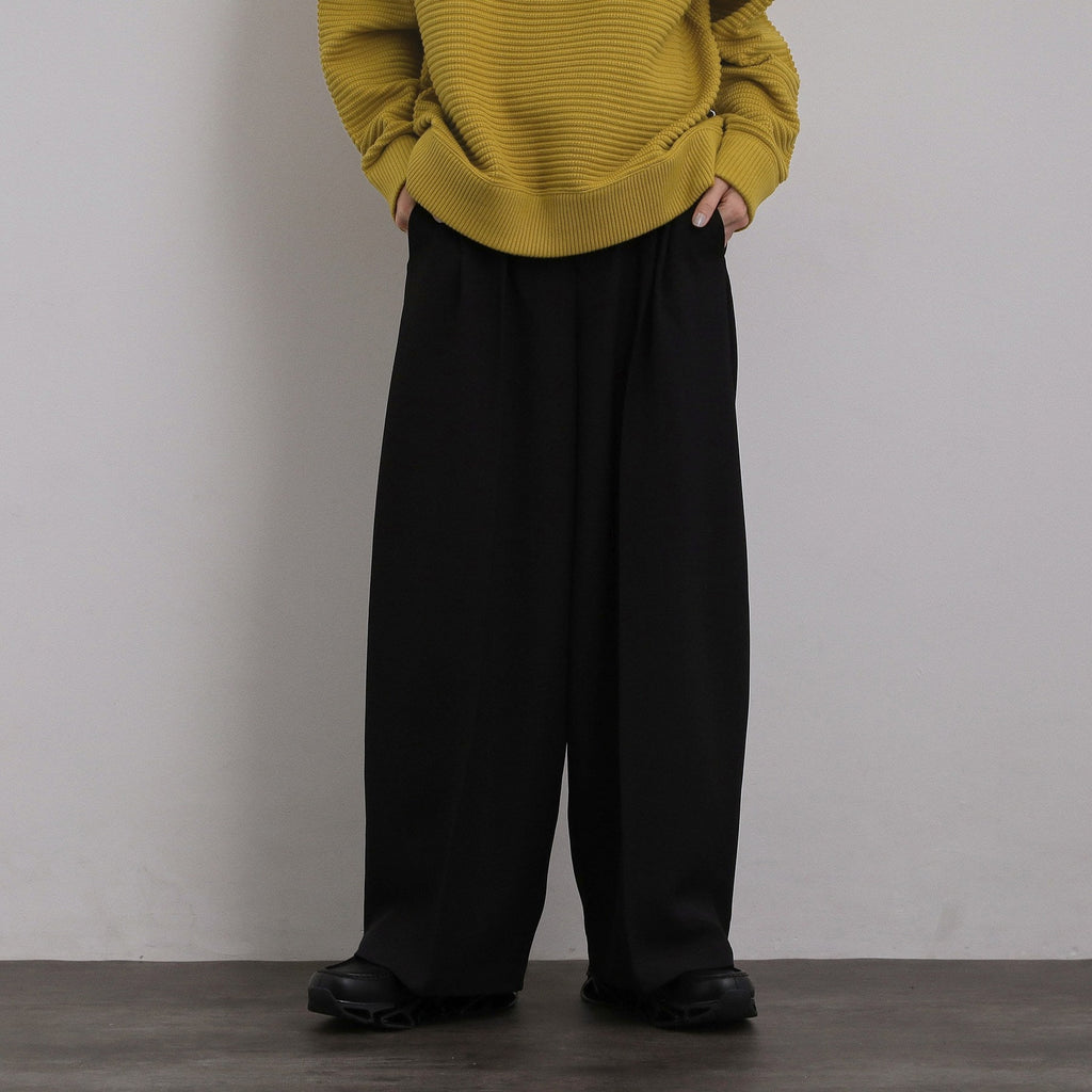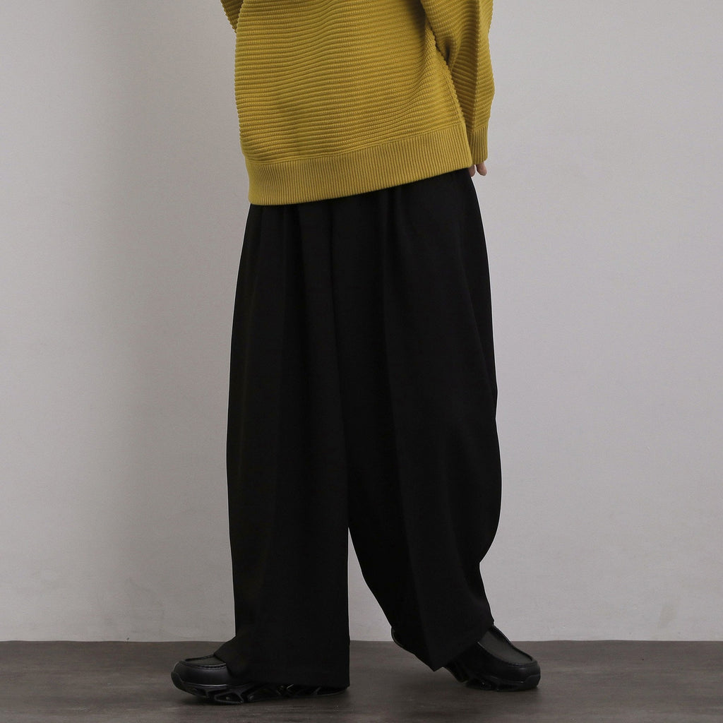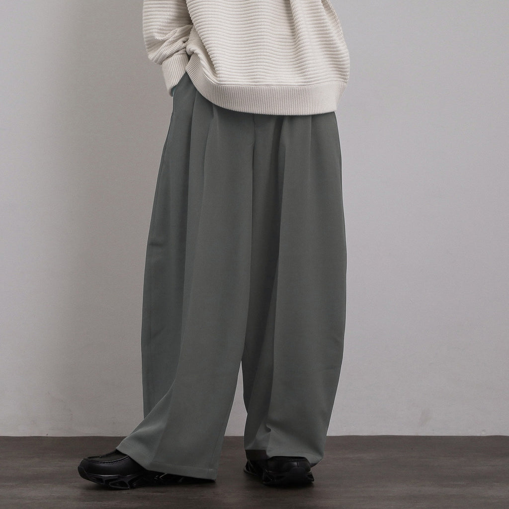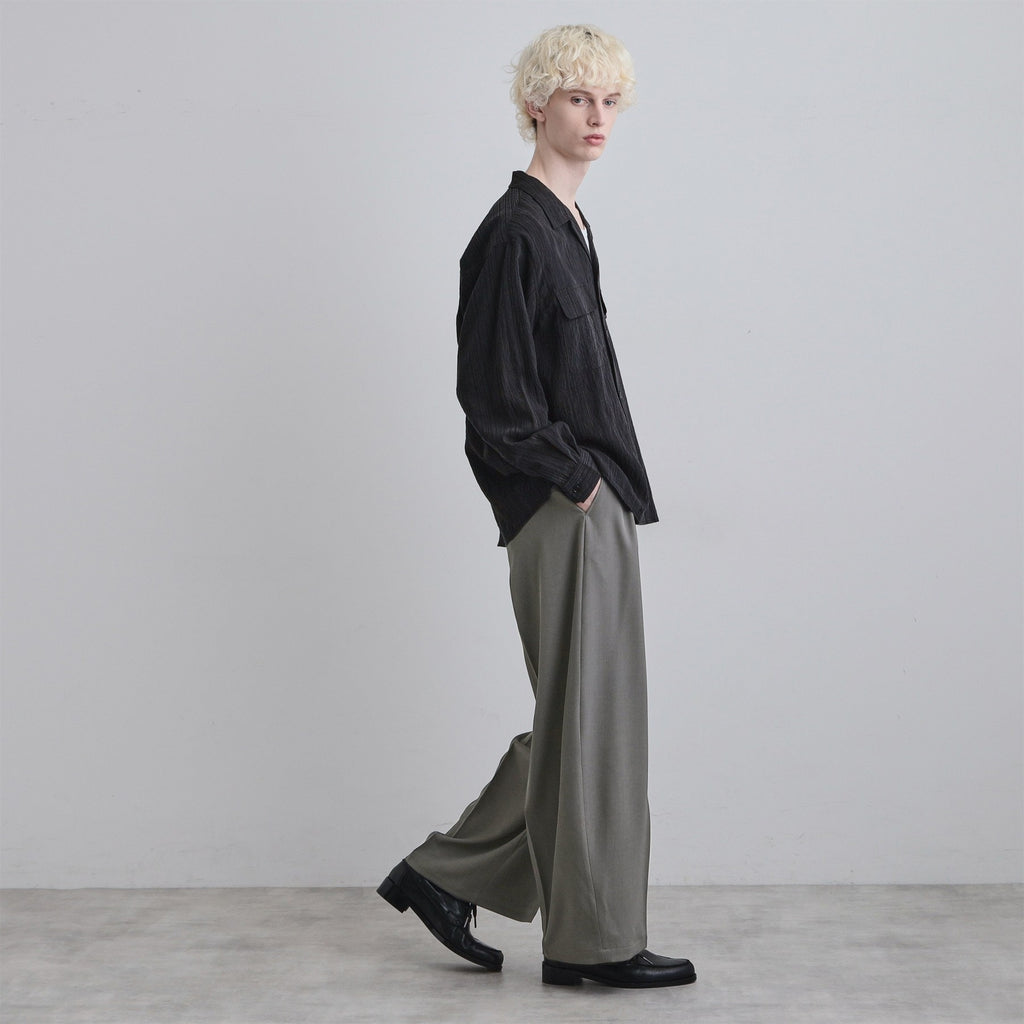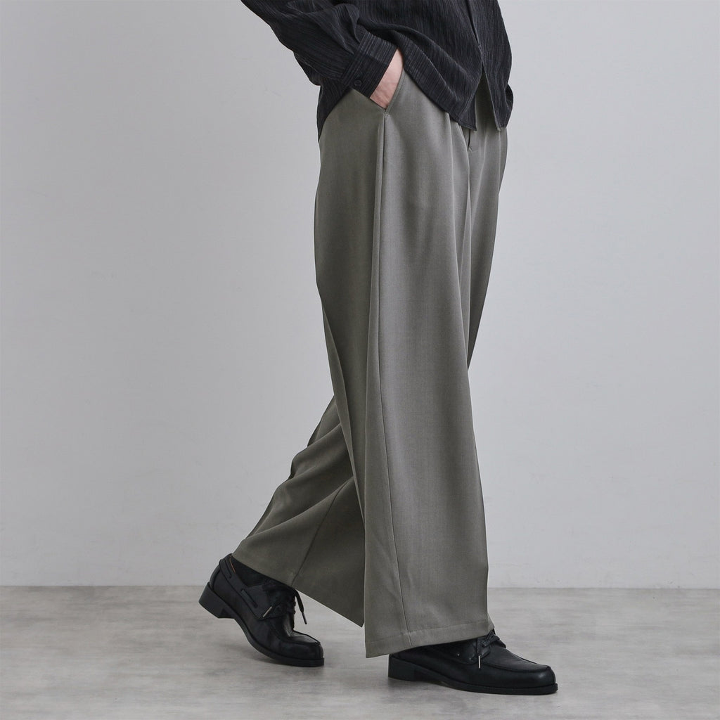 By applying a center press, the vertical line is emphasized, resulting in a clean and sophisticated impression despite the wide silhouette.