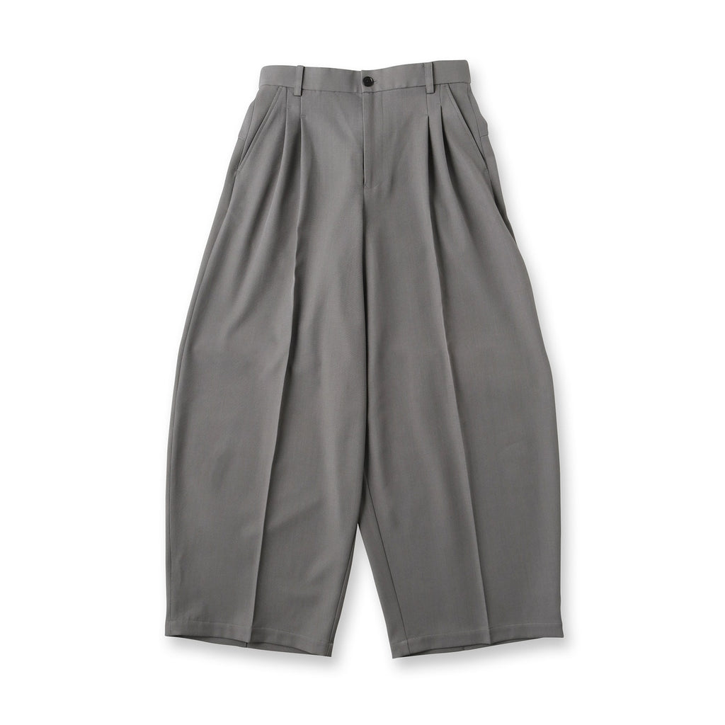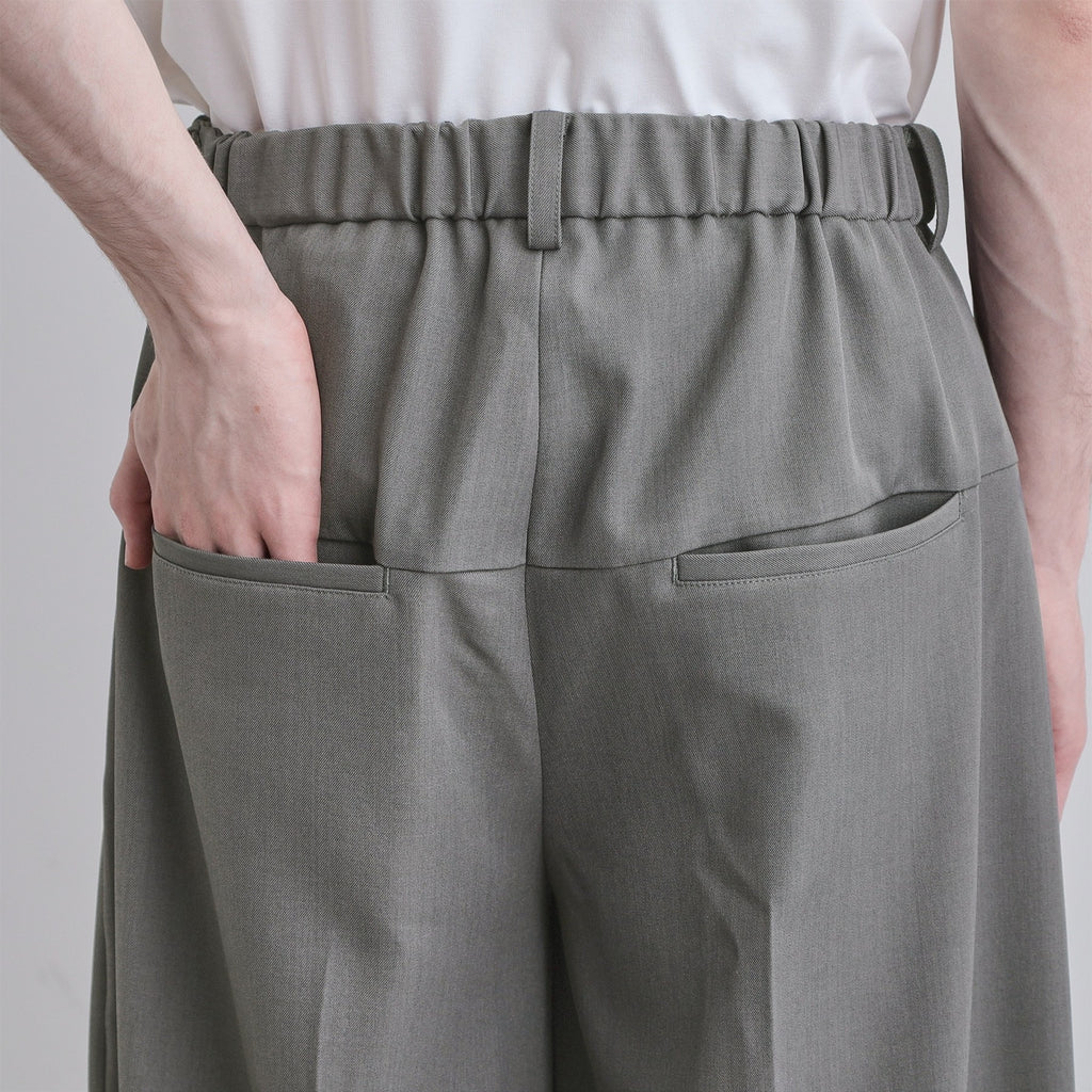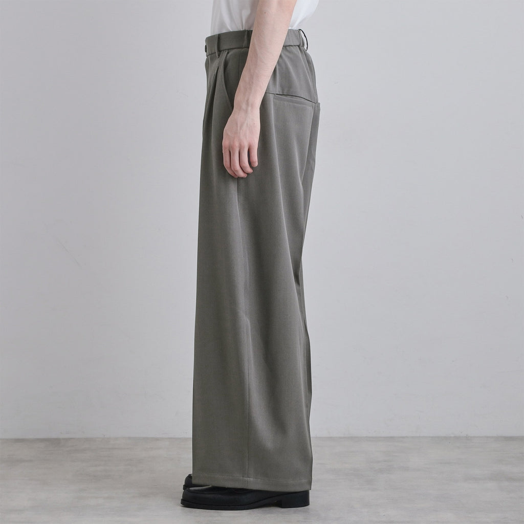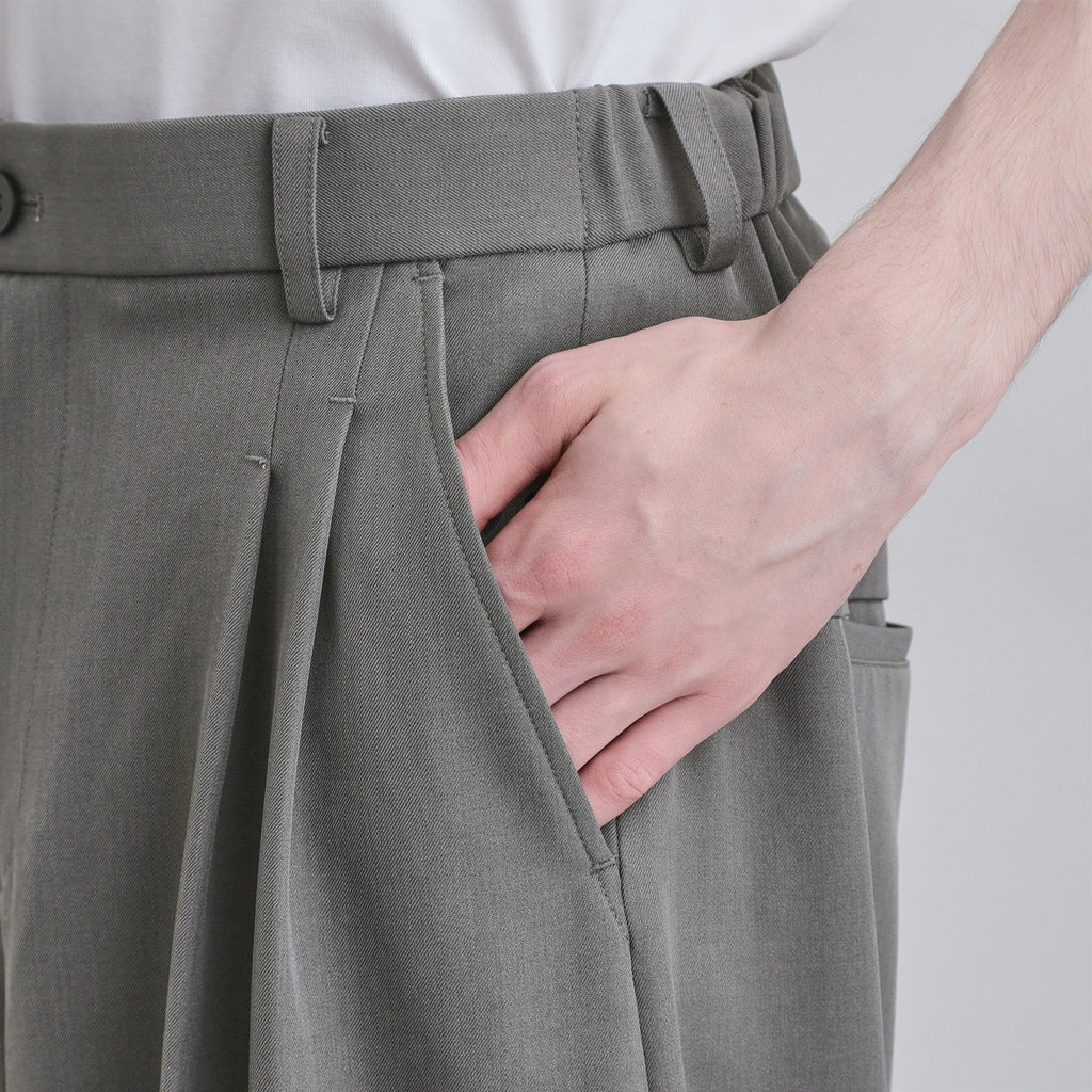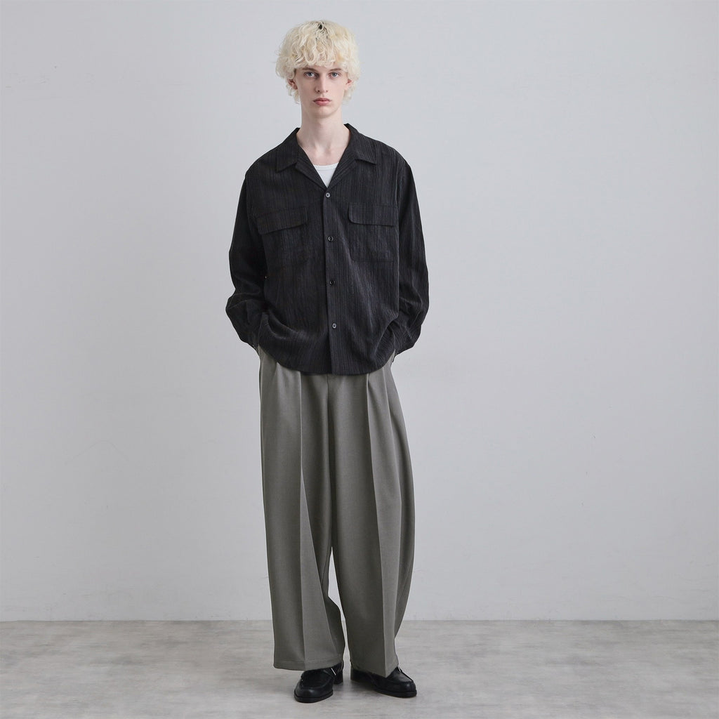 By applying a center press, the vertical line is emphasized, resulting in a clean and sophisticated impression despite the wide silhouette.