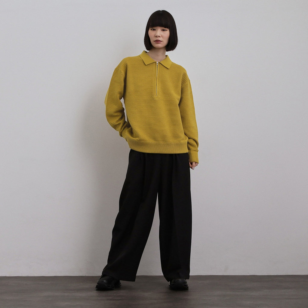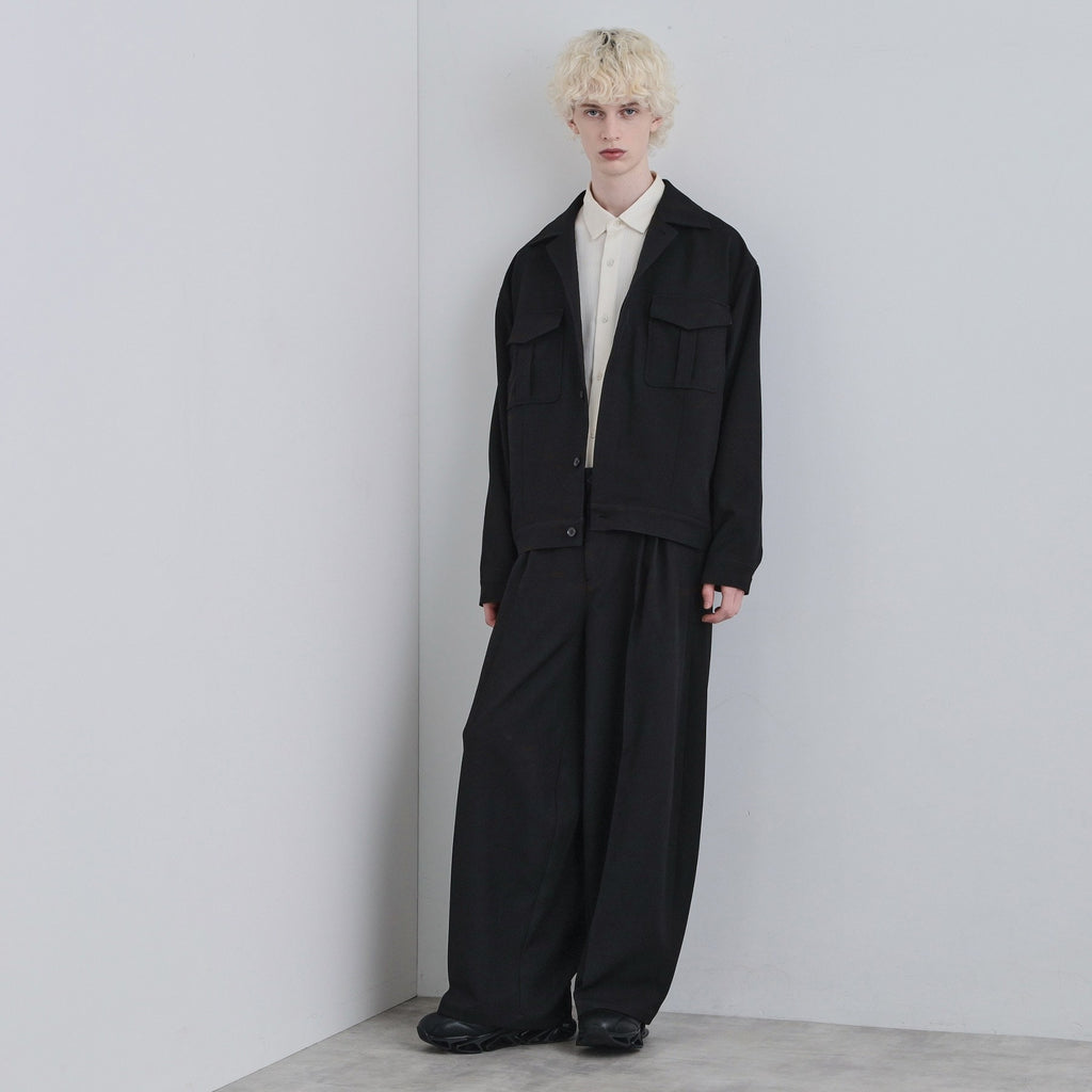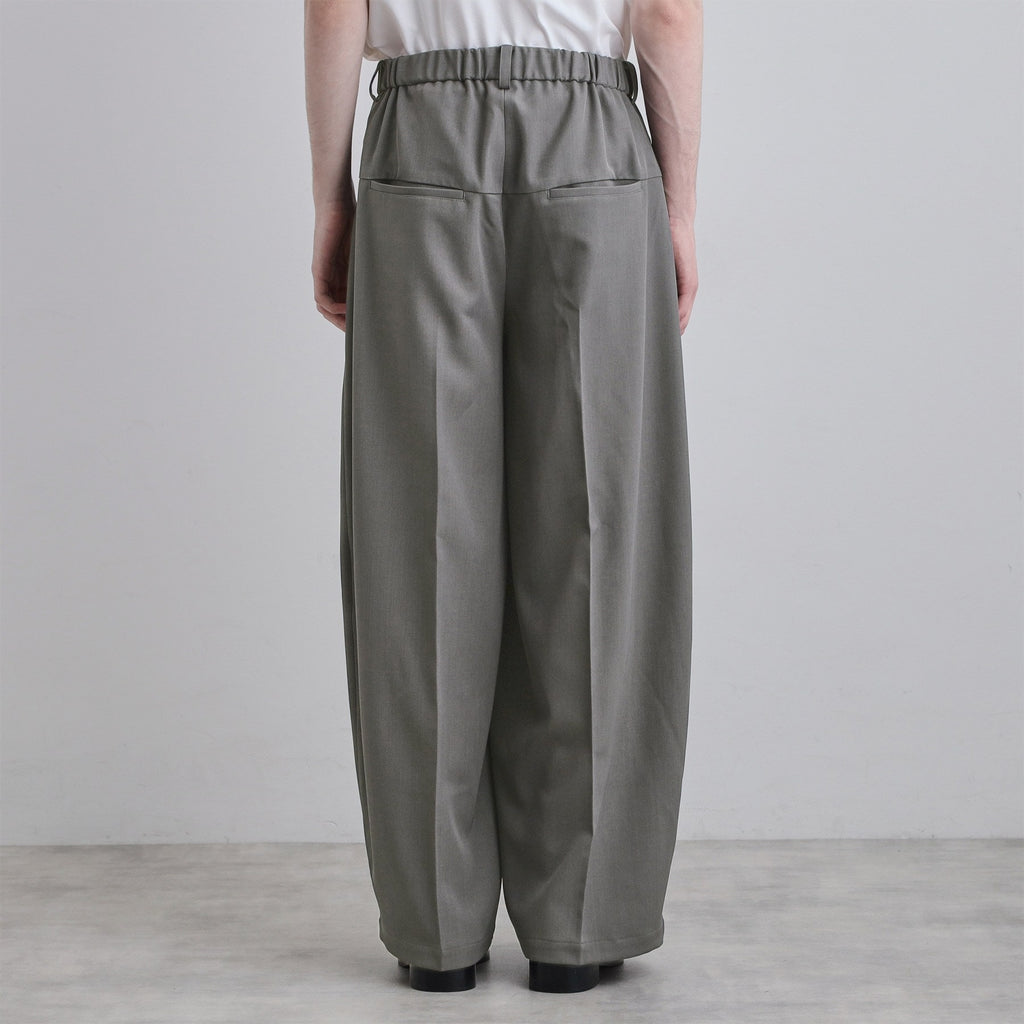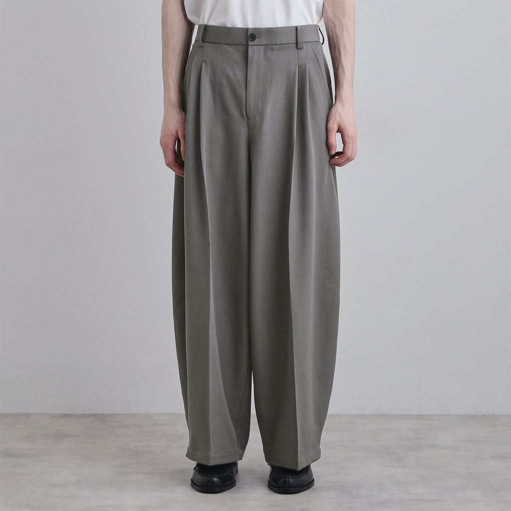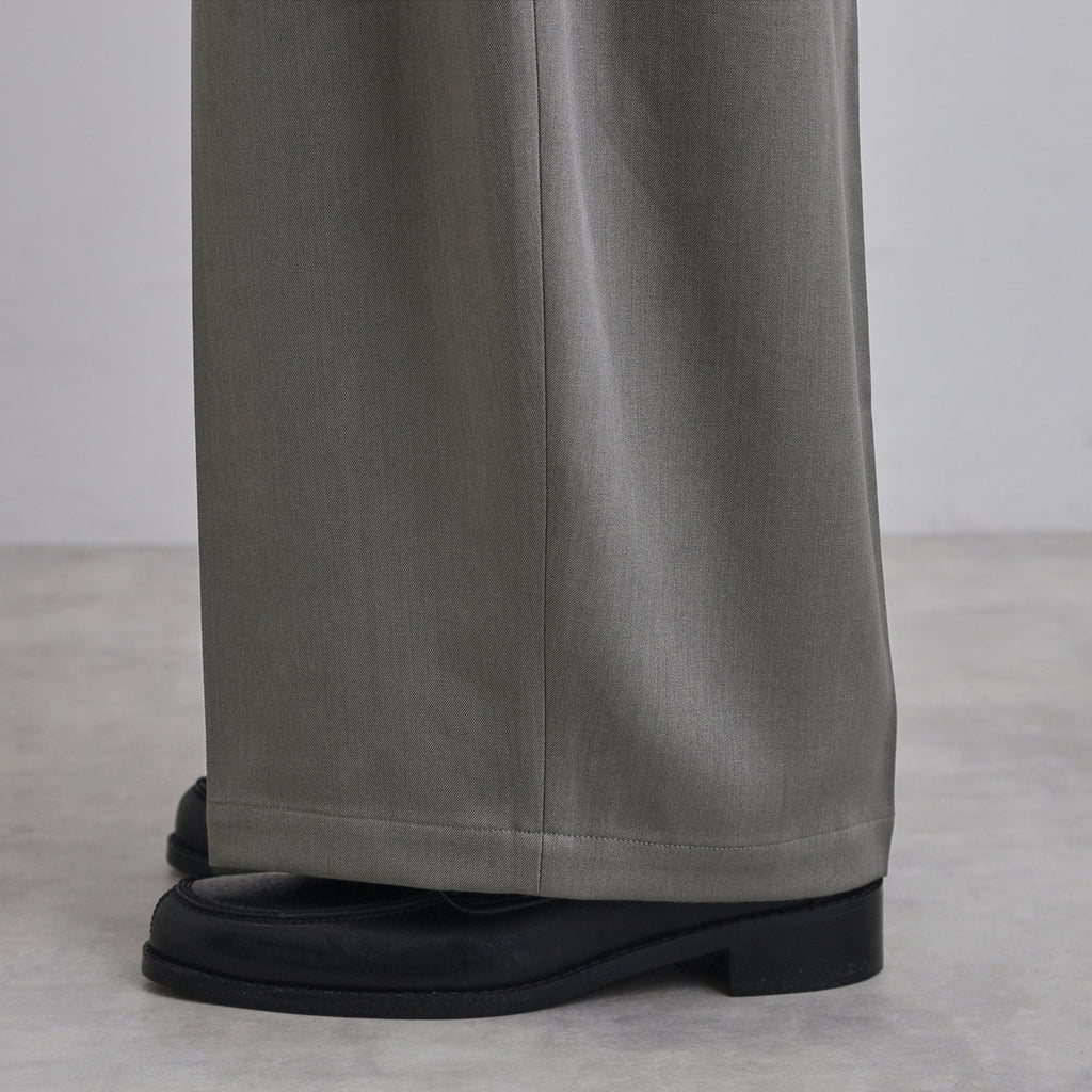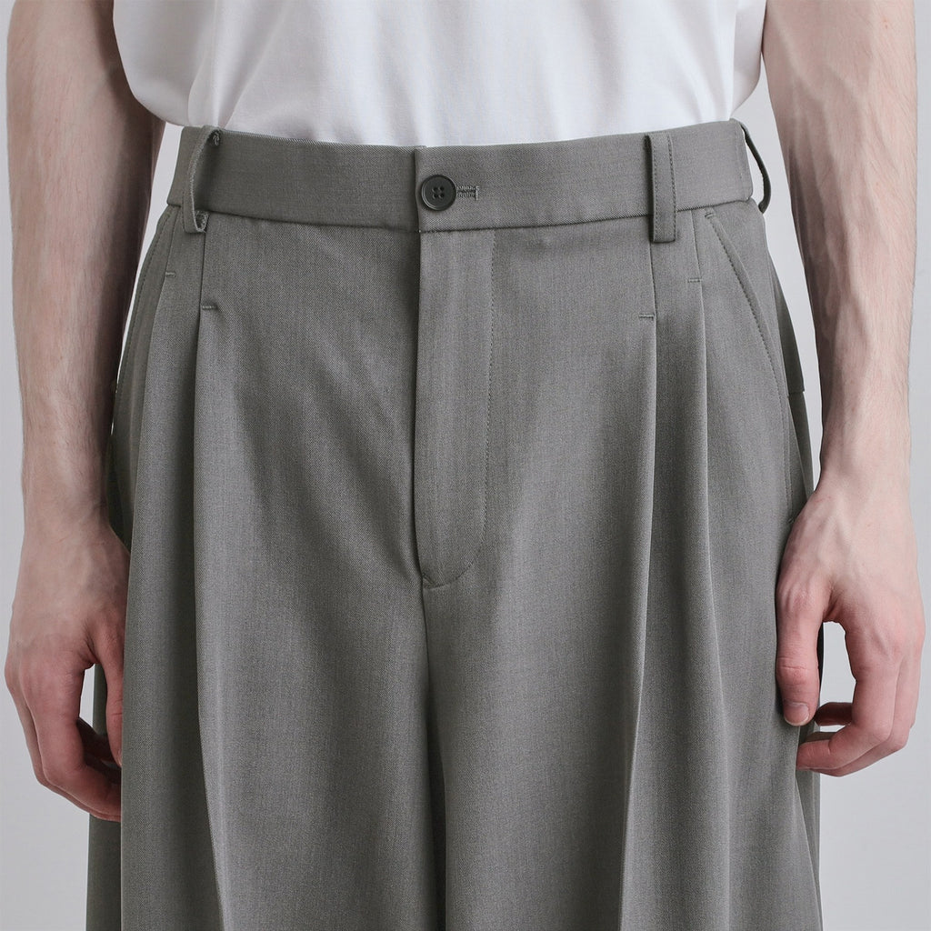 By applying a center press, the vertical line is emphasized, resulting in a clean and sophisticated impression despite the wide silhouette.