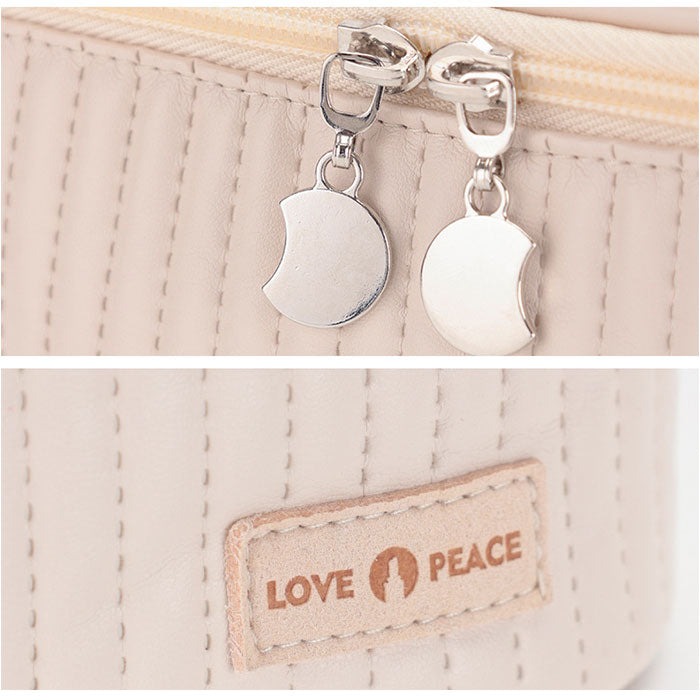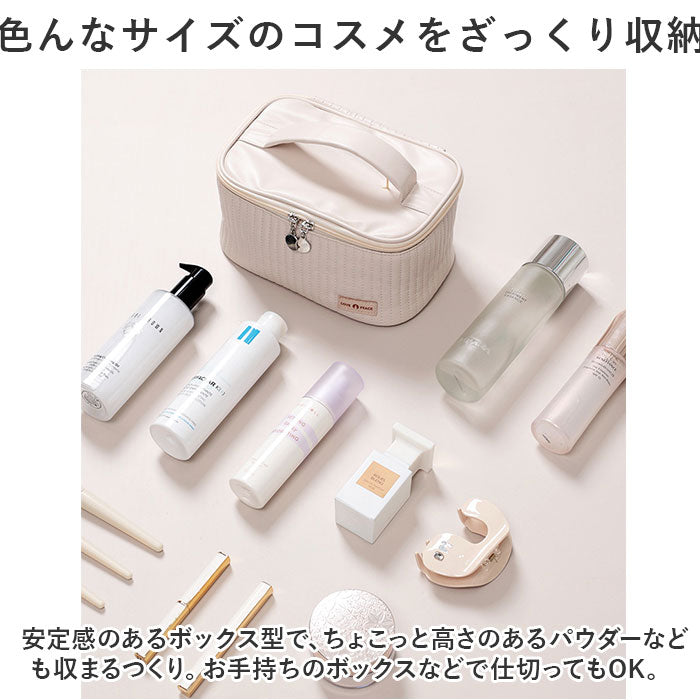 "A travel pouch that can securely store your everyday cosmetics! The convenient "Travel Pouch" is now available. 【Leave your first-choice cosmetics to this pouch☆】 The size allows you to neatly store the cosmetics you use every day. When traveling or on business trips, you can take it out as is, saving you preparation time. It has a handle on top. 【Opens wide for smooth access】 With a double zipper, it opens 180 degrees from either side! You can see the items you want to use at a glance. 【Roughly store cosmetics of various sizes】 With a stable box shape, it can accommodate slightly taller powders and more. You can also use dividers with your own boxes. 【Neatly store tools like brushes】 The five pockets on the back of the lid are for storing brushes. It comes with a belt to prevent them from popping out. 【Added water-repellent feature】 The surface is treated with a water-repellent finish that repels dirt and water, so it can handle a little moisture. Cleaning is as simple as wiping it down. 【Soft and cute color options】 A lineup of gentle natural colors. Choose your favorite!