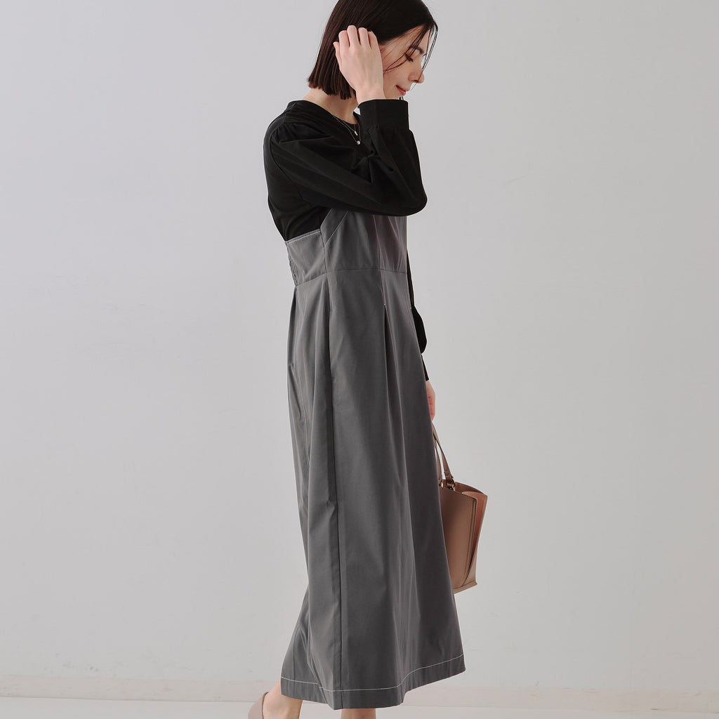 A dress featuring a design that looks like a layered bustier dress over a jersey fabric bodice.
