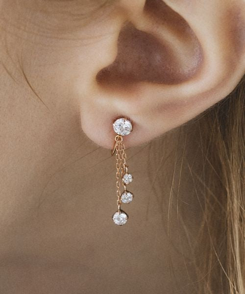 Earrings with a sophisticated impression, featuring cubic zirconia that gently sways at the ears. They sparkle beautifully with every movement, enhancing femininity. The gentle shine of rose gold is also attractive.