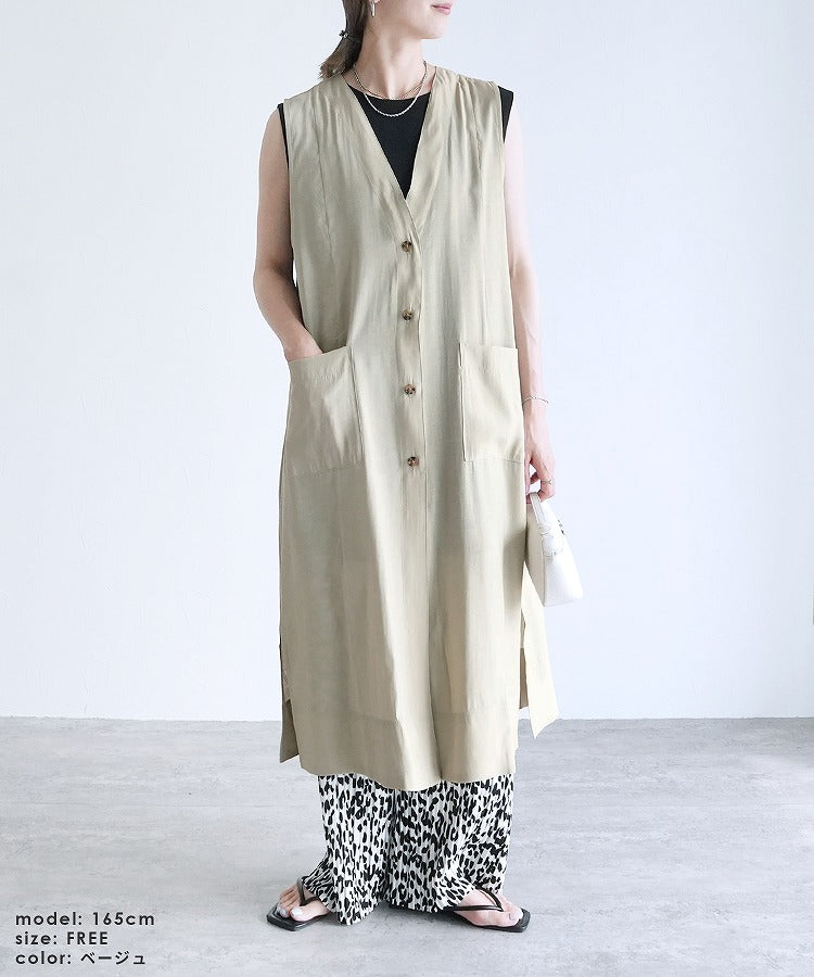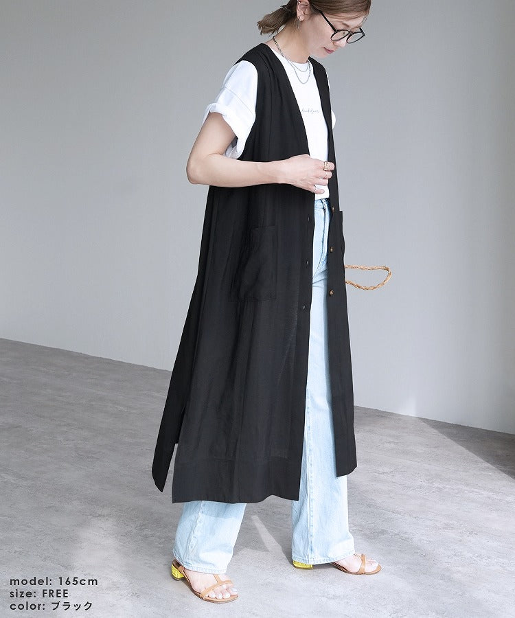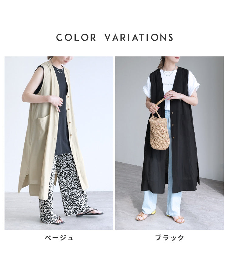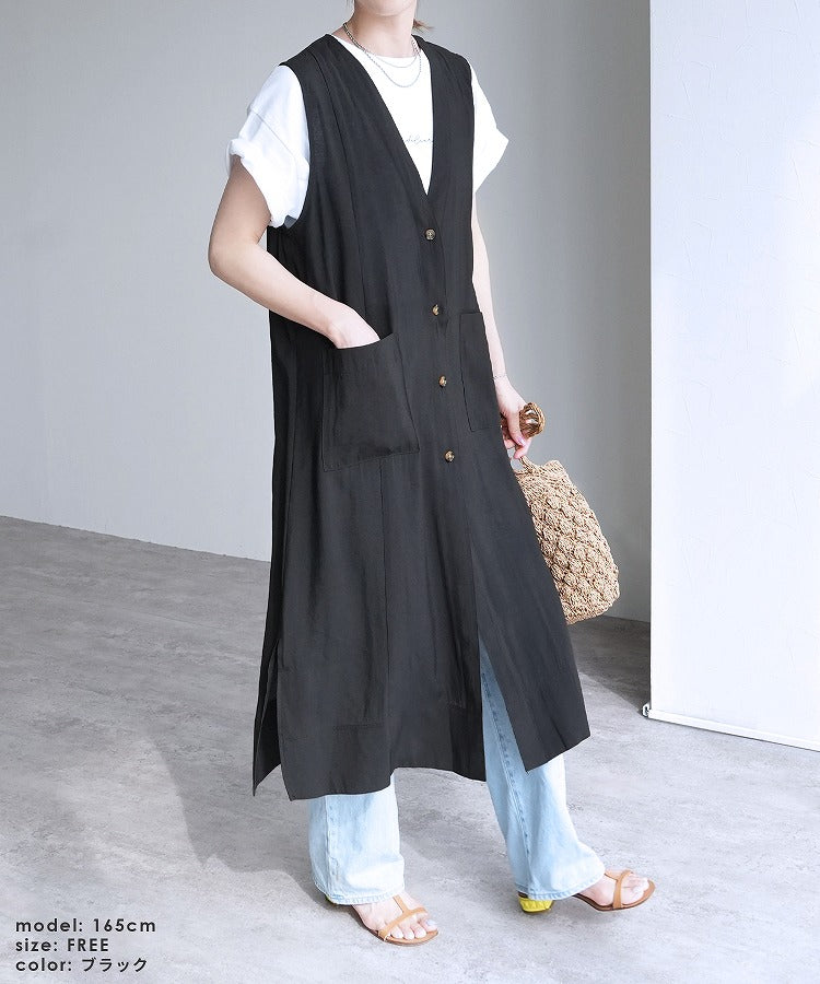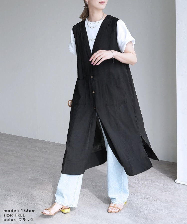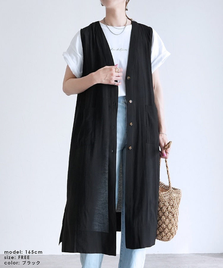 Ladies' tops outer long vest V-neck best comfortable stylish casual neat simple reca sheer with pockets spring summer sheer button front opening cardigan slit layered body coverage long length vest adult women's fashion 30s coordination body coverage beige black black