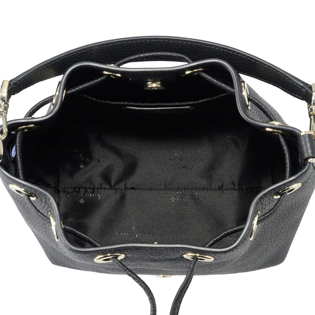 Plain metal logo, textured leather, bucket bag, drawstring closure, crossbody, shoulder, handbag, 2WAY, Kate Spade, feminine, elegant