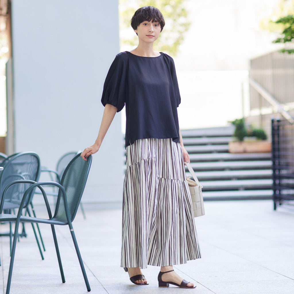 A sweet and spicy coordination paired with wide pants or a tighter skirt by tucking in the hem.
