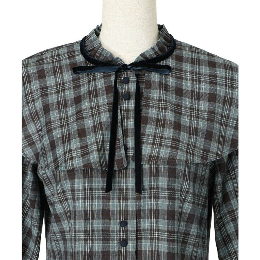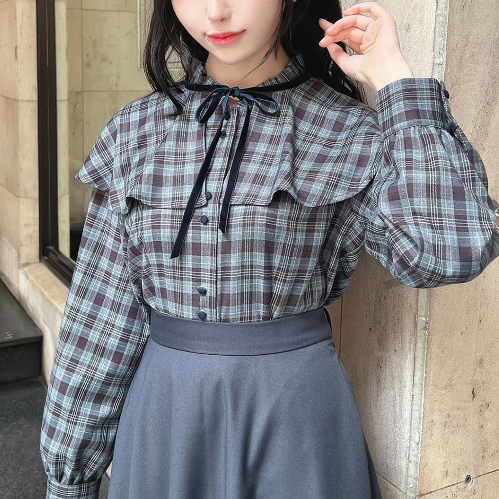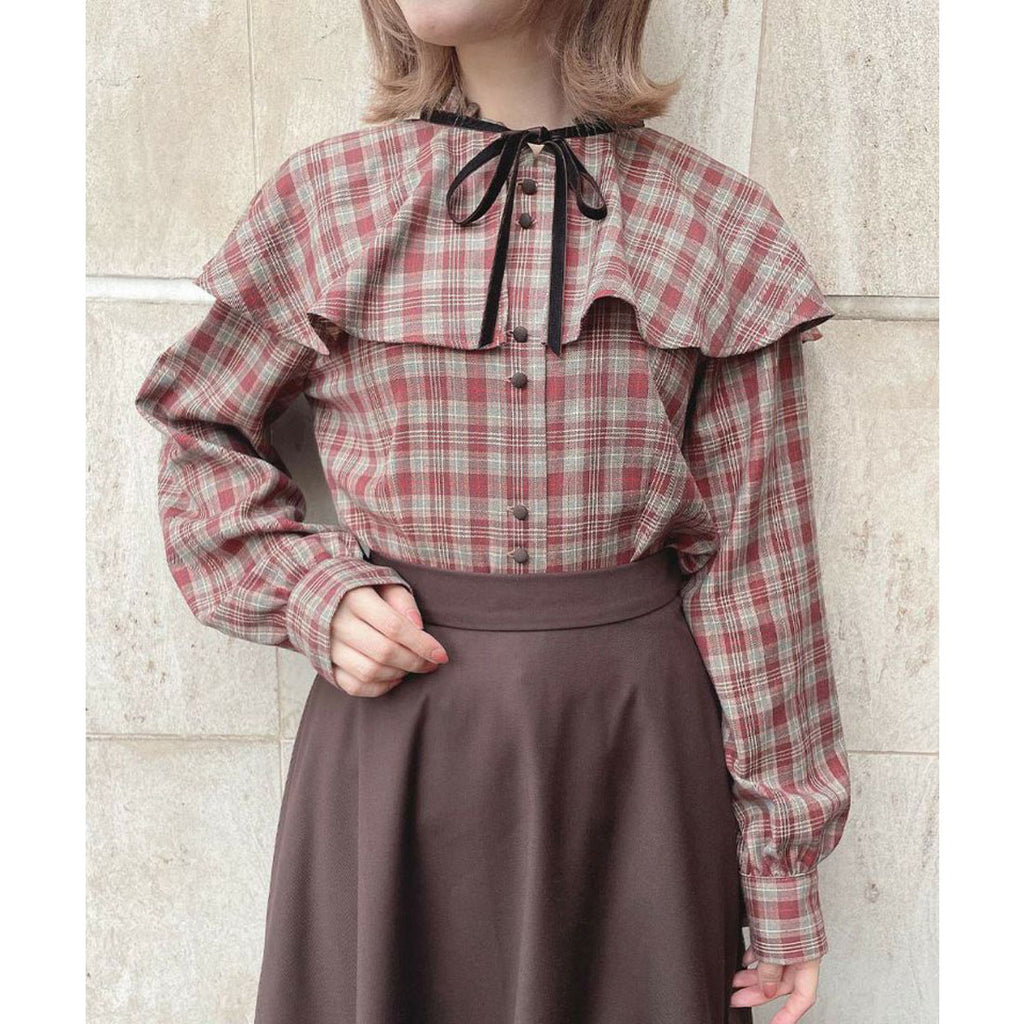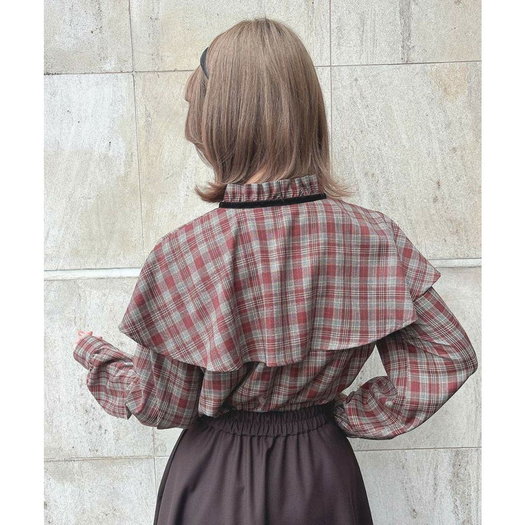 A cape-attached blouse with a vintage check fabric that creates an elegant look.