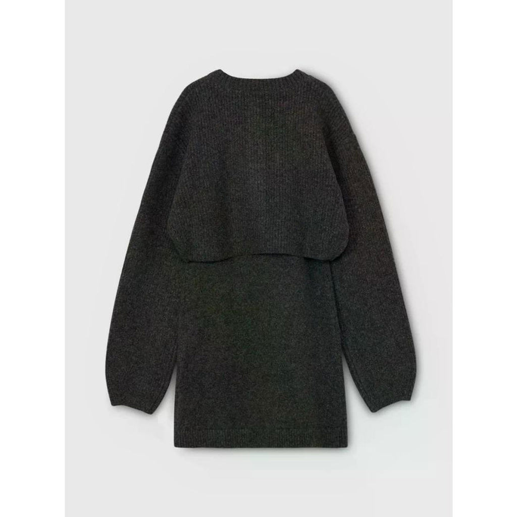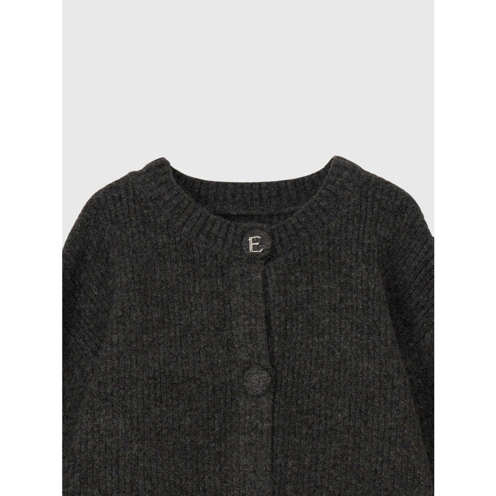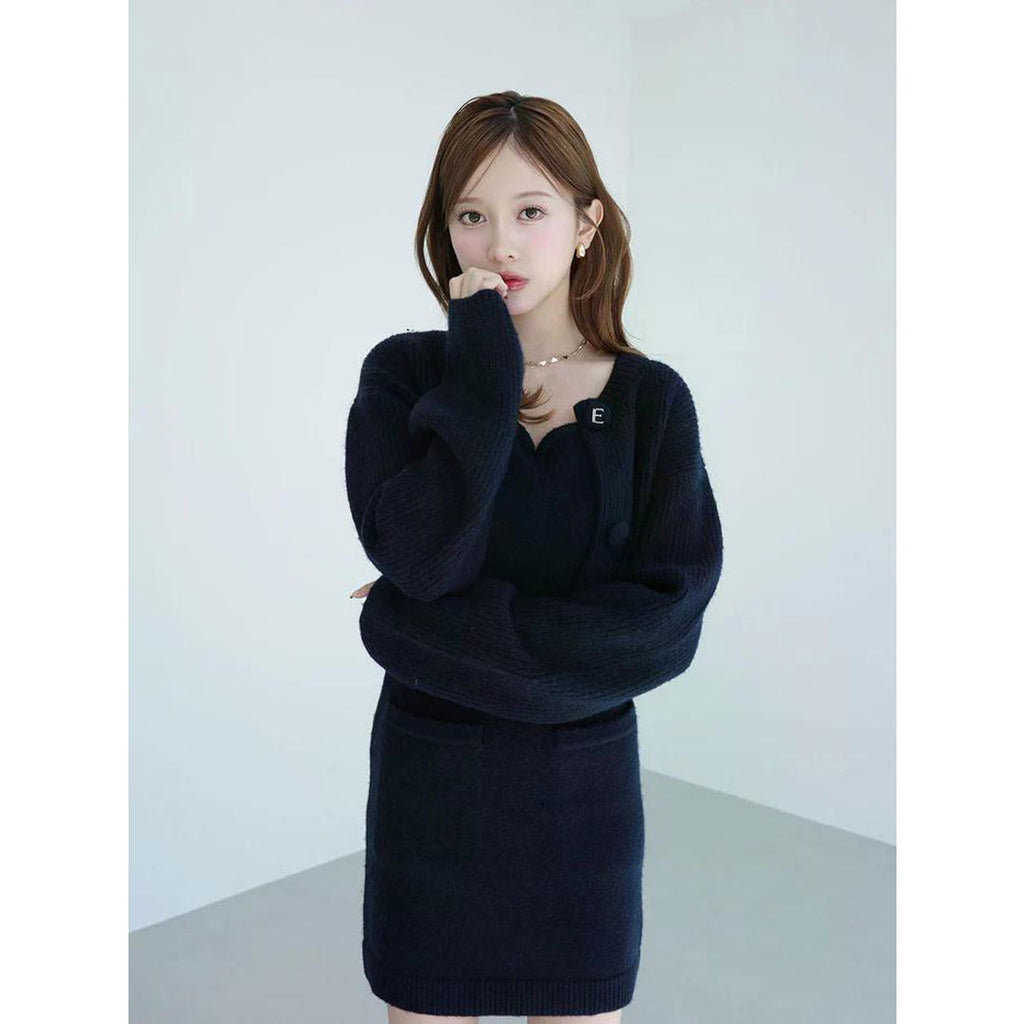 A set item combining a short cardigan with logo buttons as an accent and a knit one-piece made of the same material.