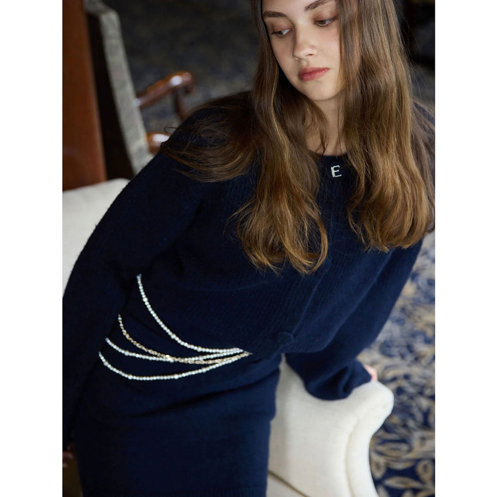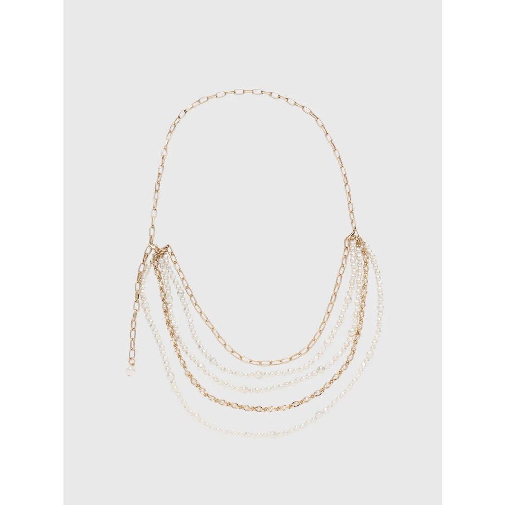 Features a delicate metal chain and pearls combined in a layered design that overlaps like drapes. The swinging layered lines create a glamorous effect, instantly elevating a simple style.