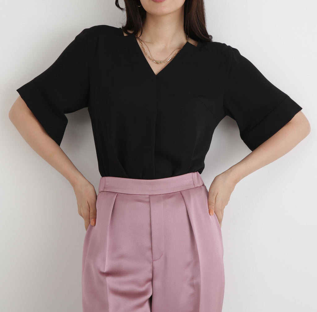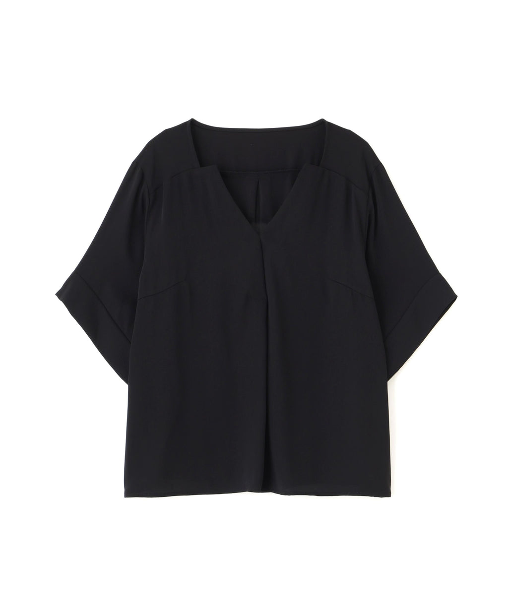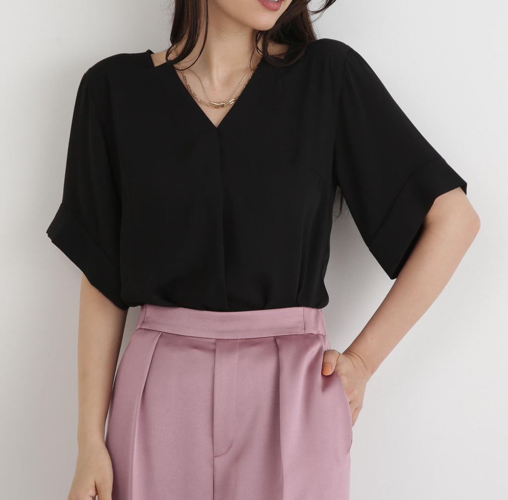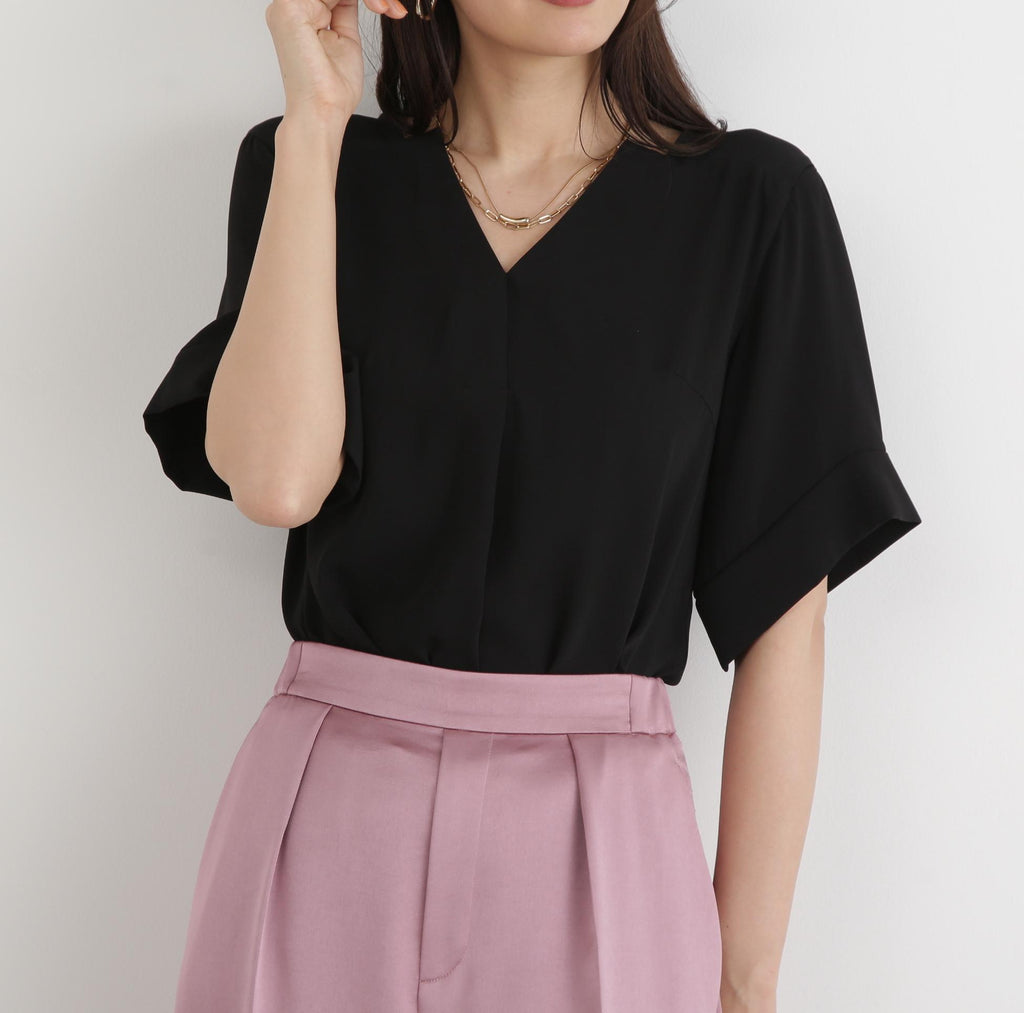 Sharp V-neck half-sleeve blouse. The design features a cut that beautifully highlights the collarbone line and tucks on the front, creating a simple yet feminine look. The half-sleeves fully cover the upper arms, with wide cuffs and loose, large sleeves that make the shoulders appear slender.