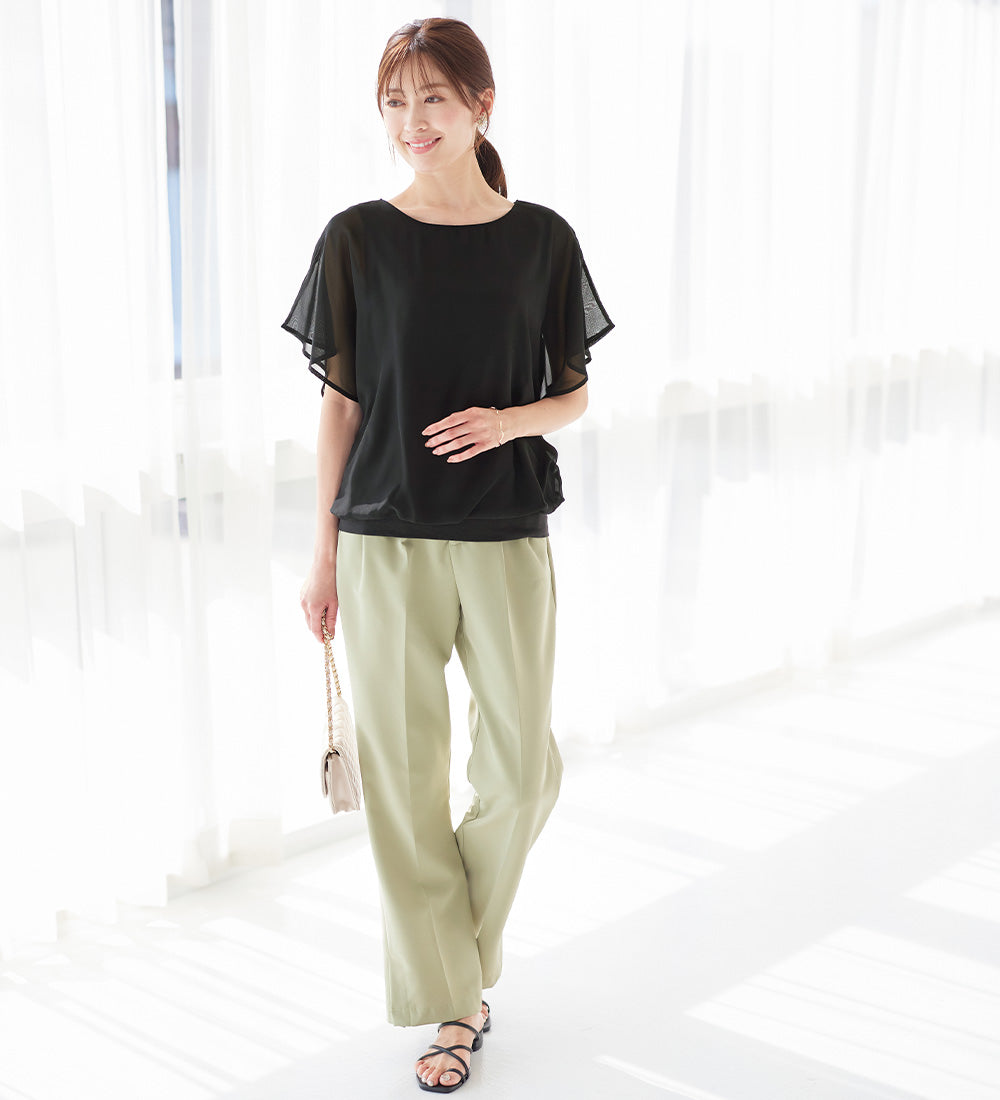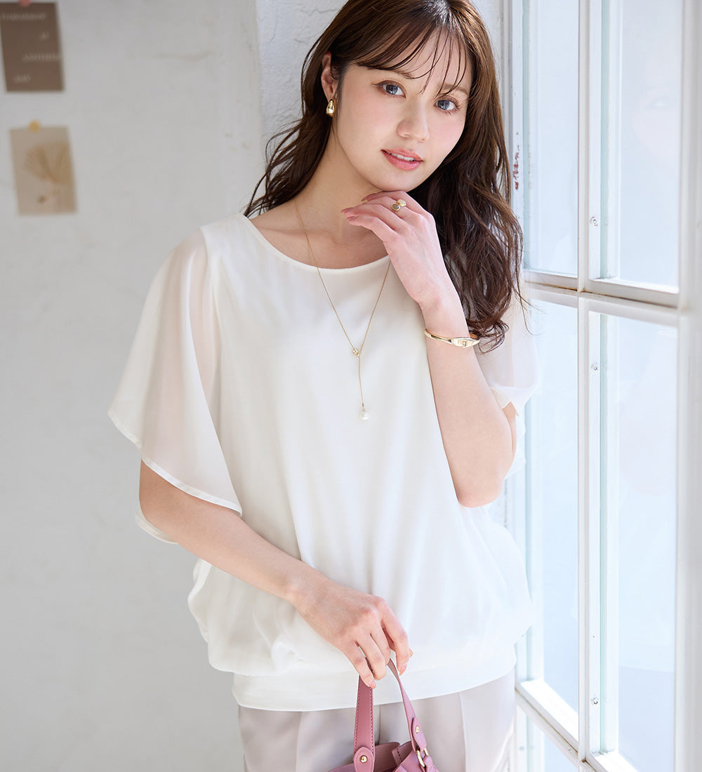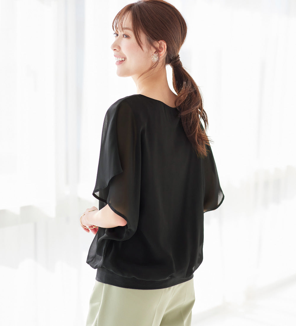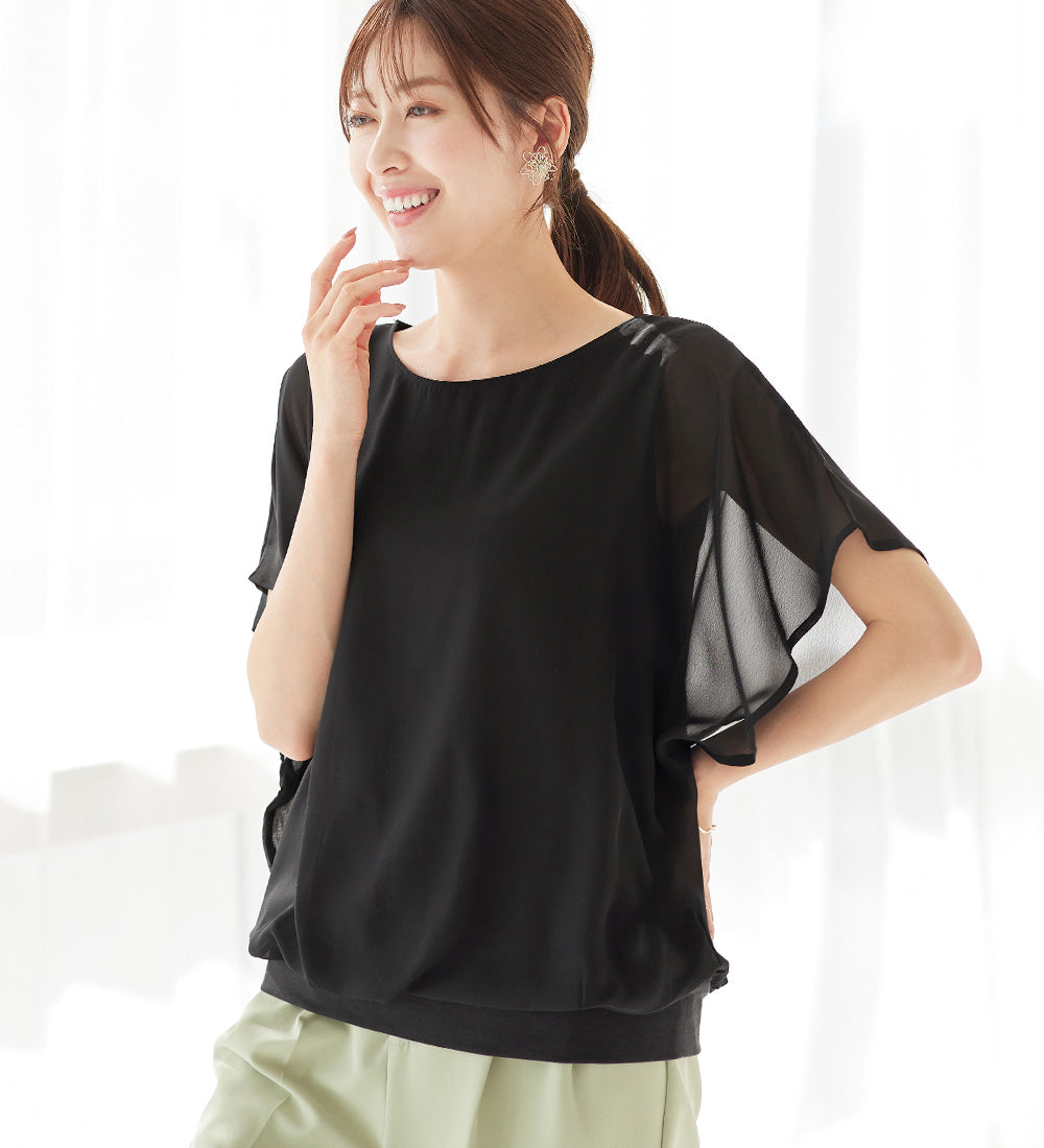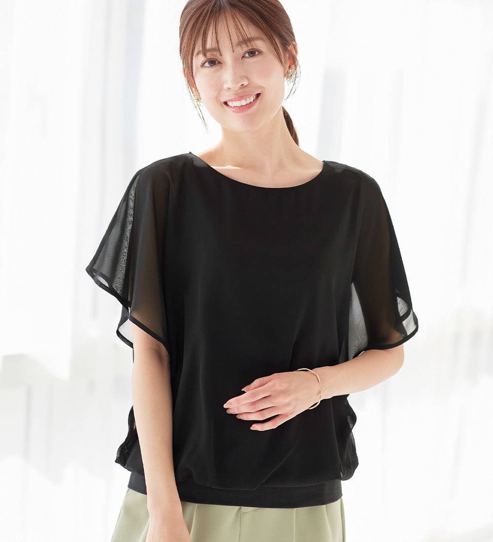 Frill sleeve design that naturally gives a soft impression and hides the upper arms.