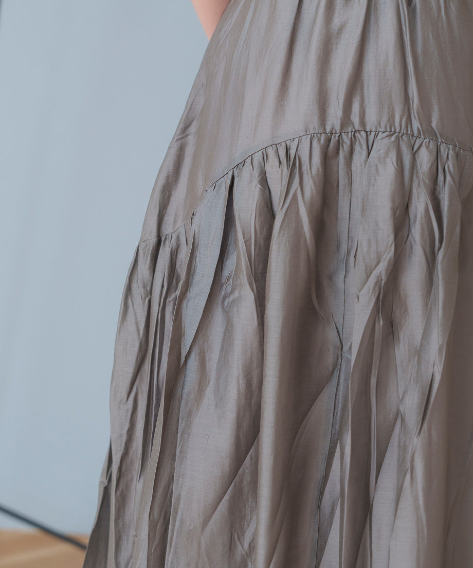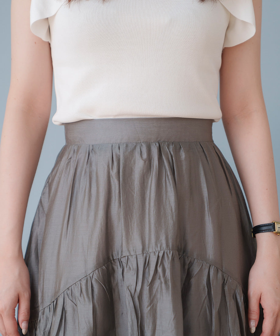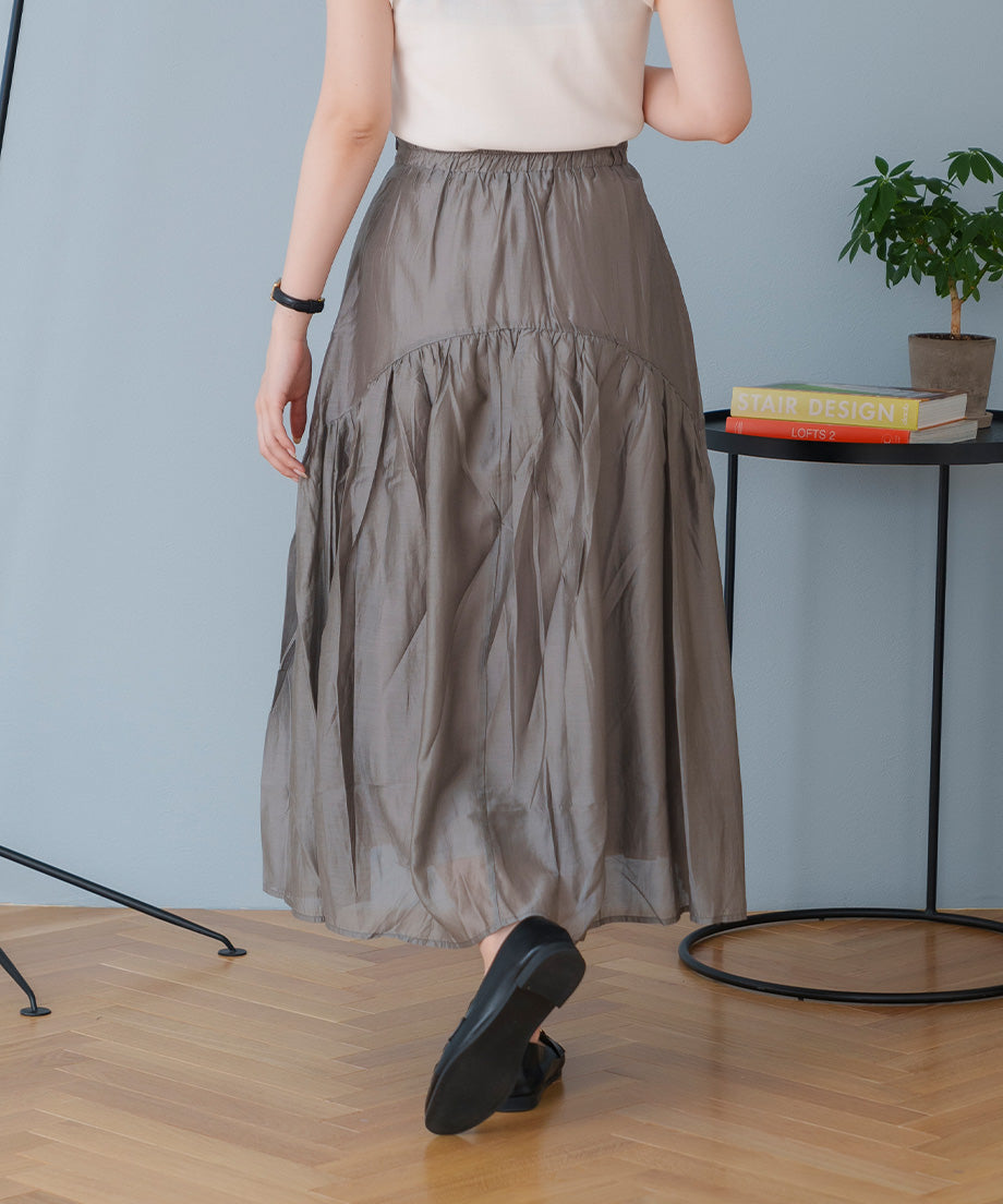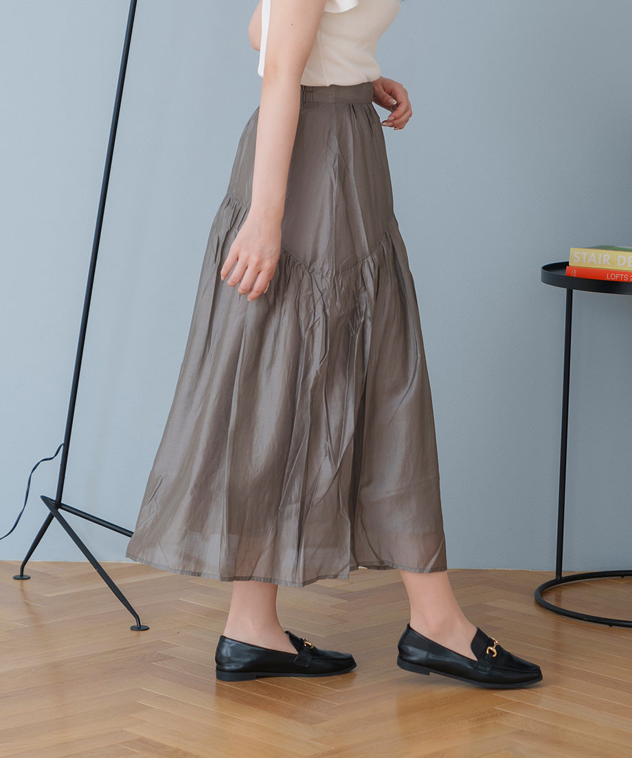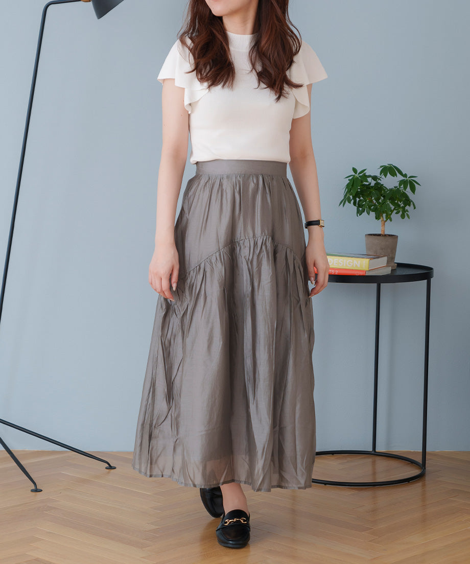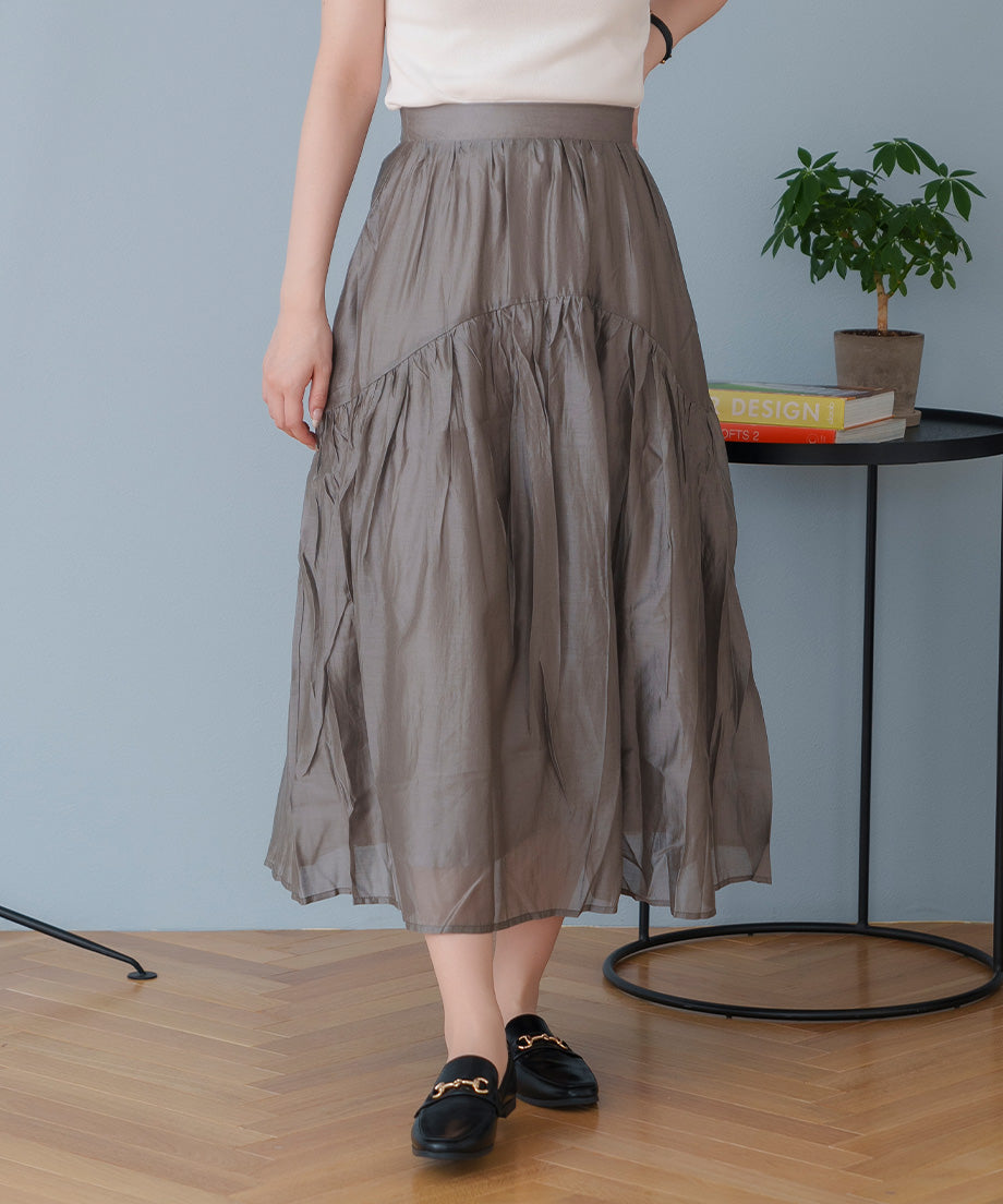 The sheer gathered skirt is a piece that charms with its light transparency and elegant design.