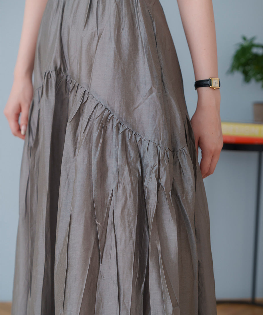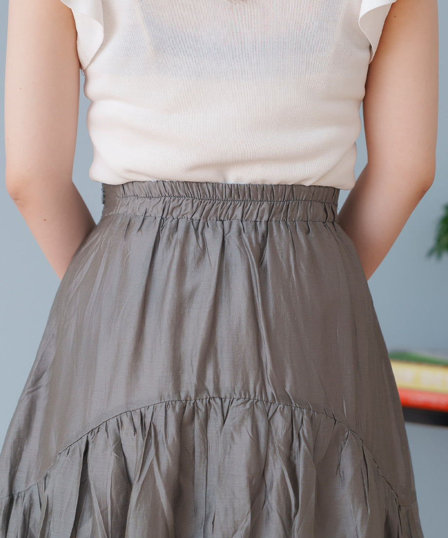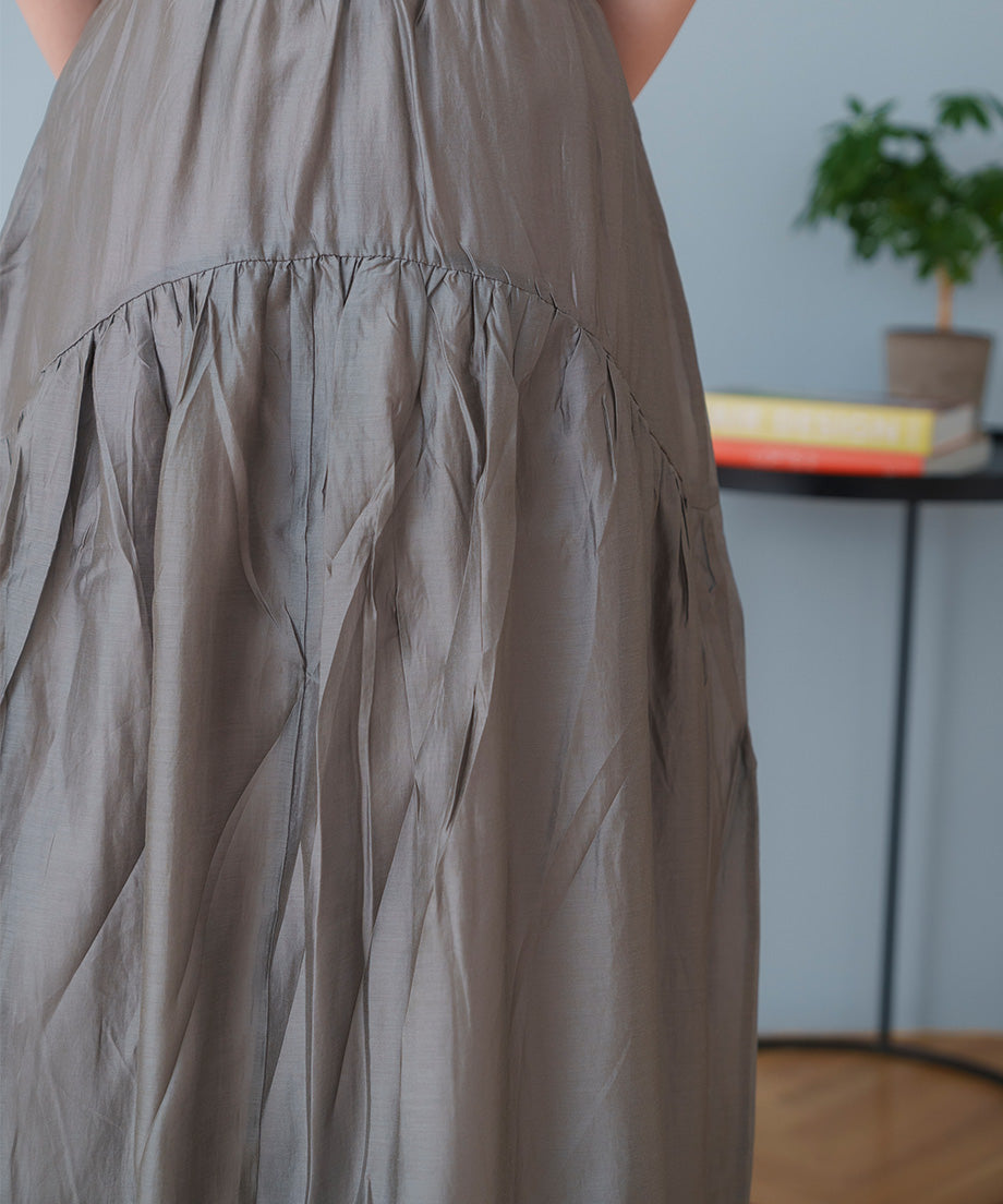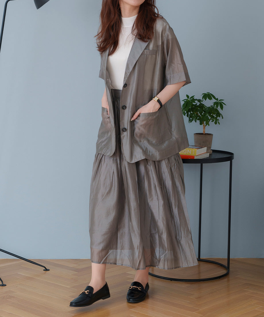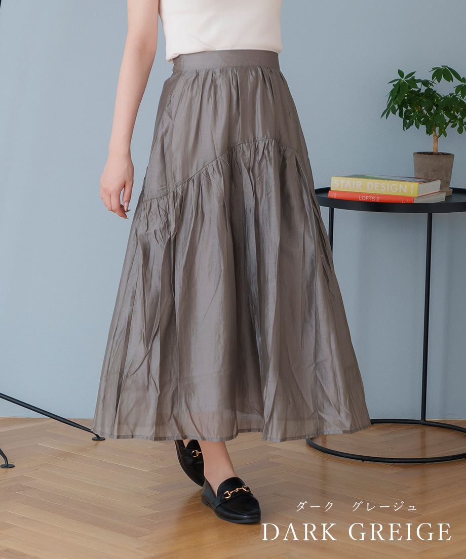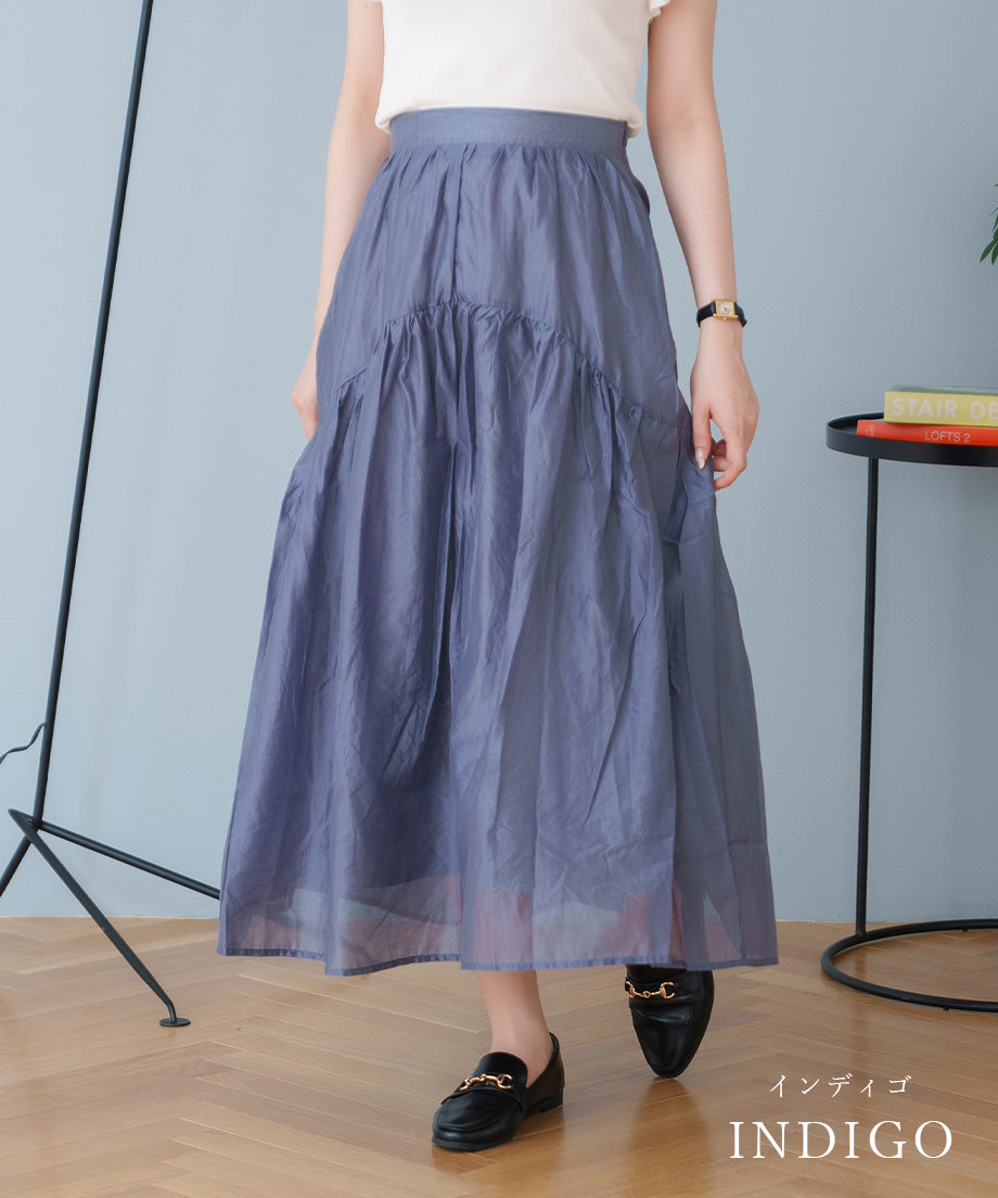 The sheer gathered skirt is a piece that charms with its light transparency and elegant design.
