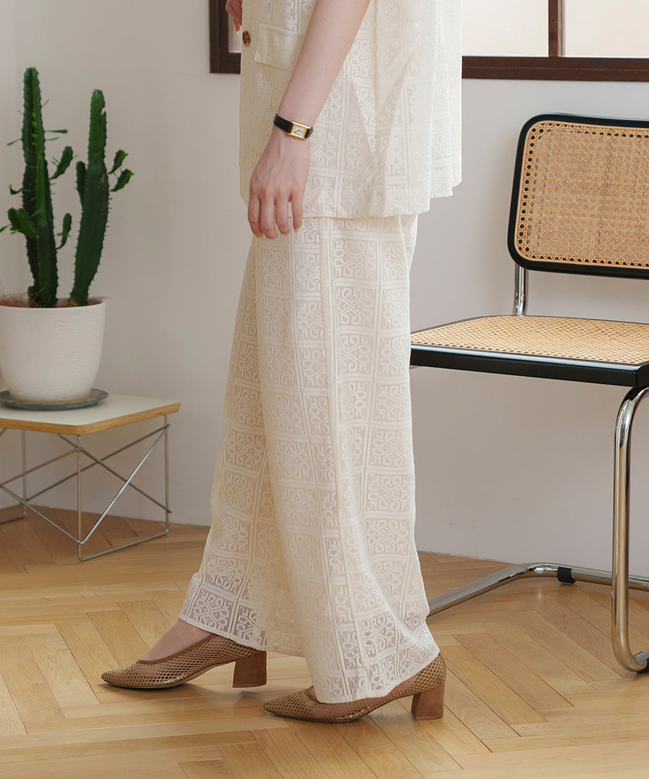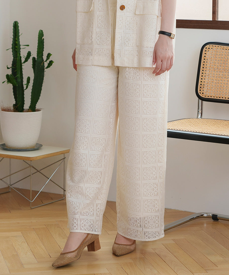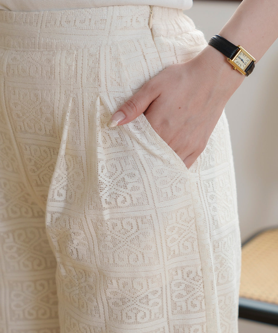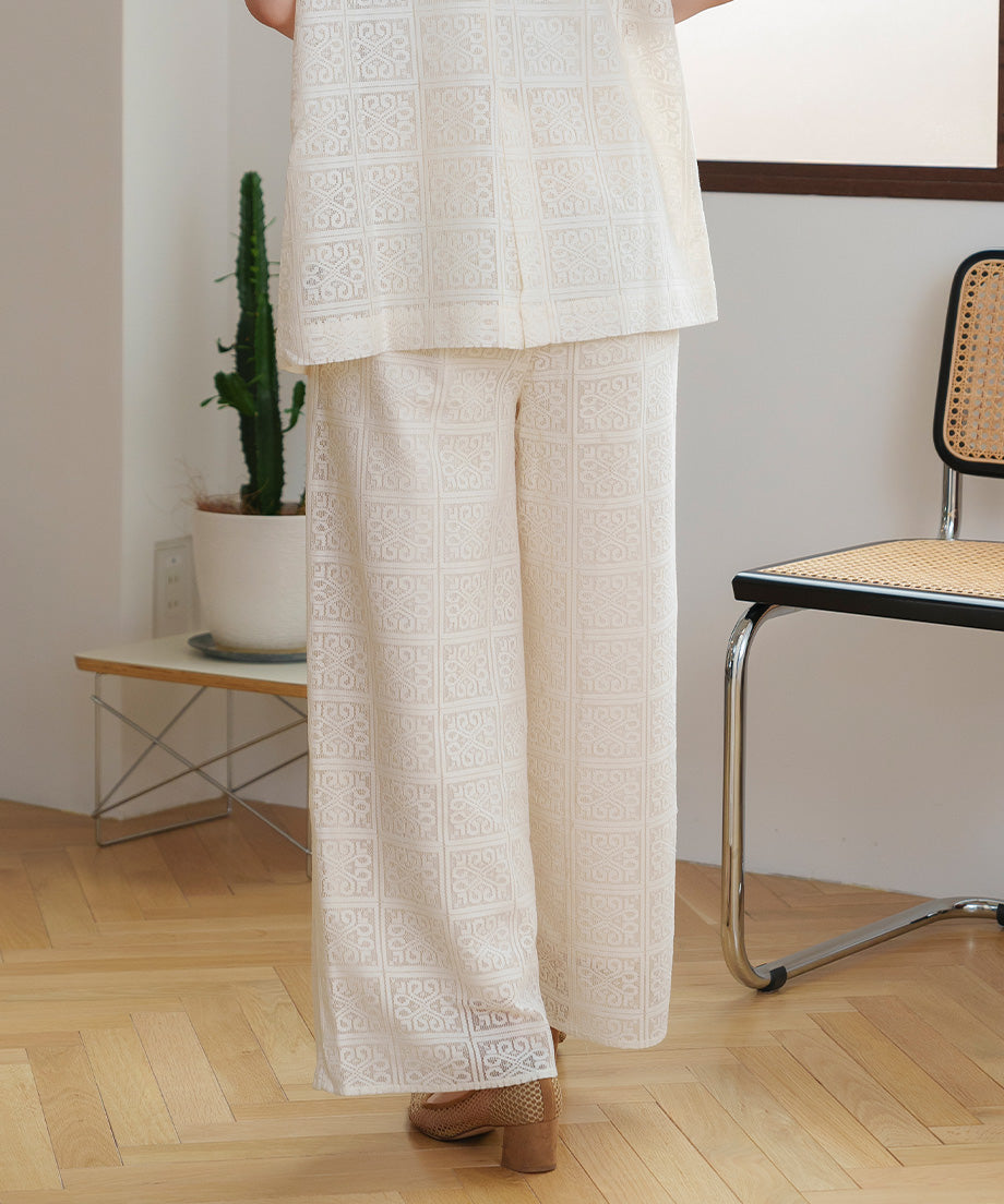 The lace wide pants, characterized by their elegant design, are an ivory color that easily matches any outfit.
