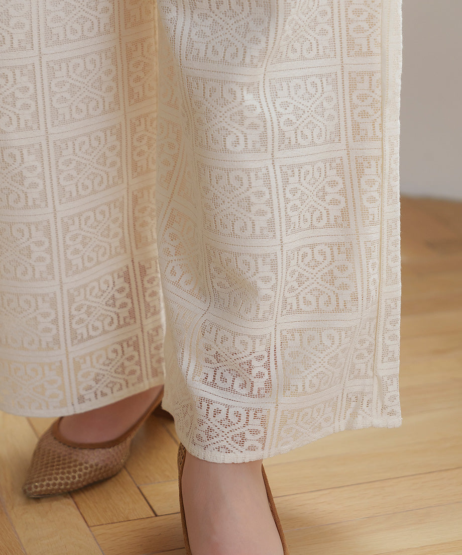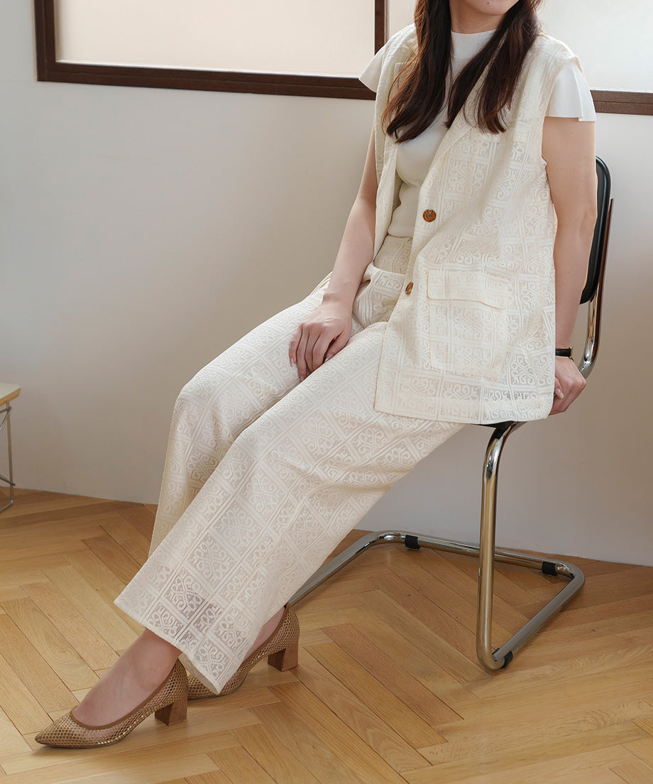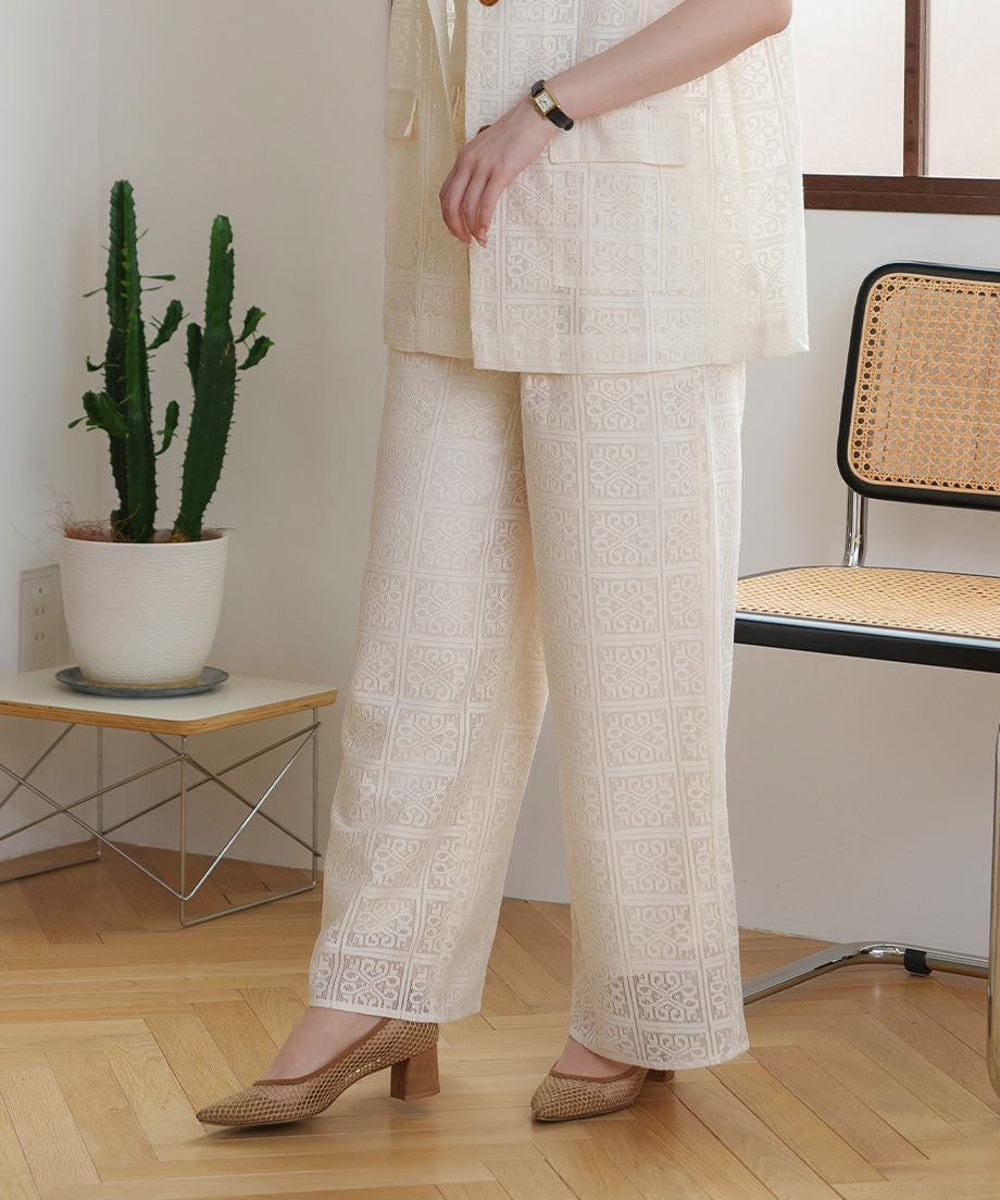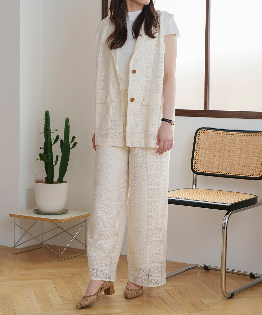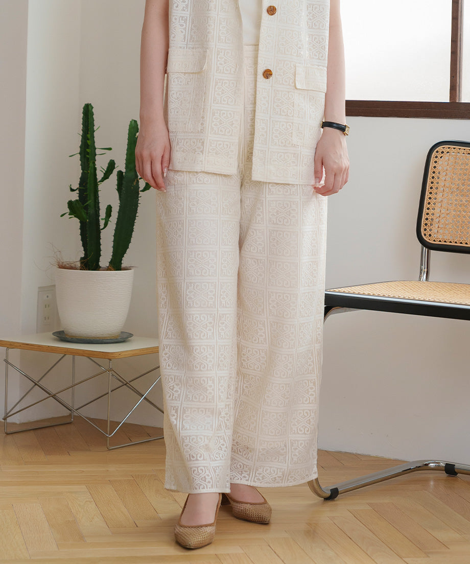 The lace wide pants, characterized by their elegant design, are an ivory color that easily matches any outfit.