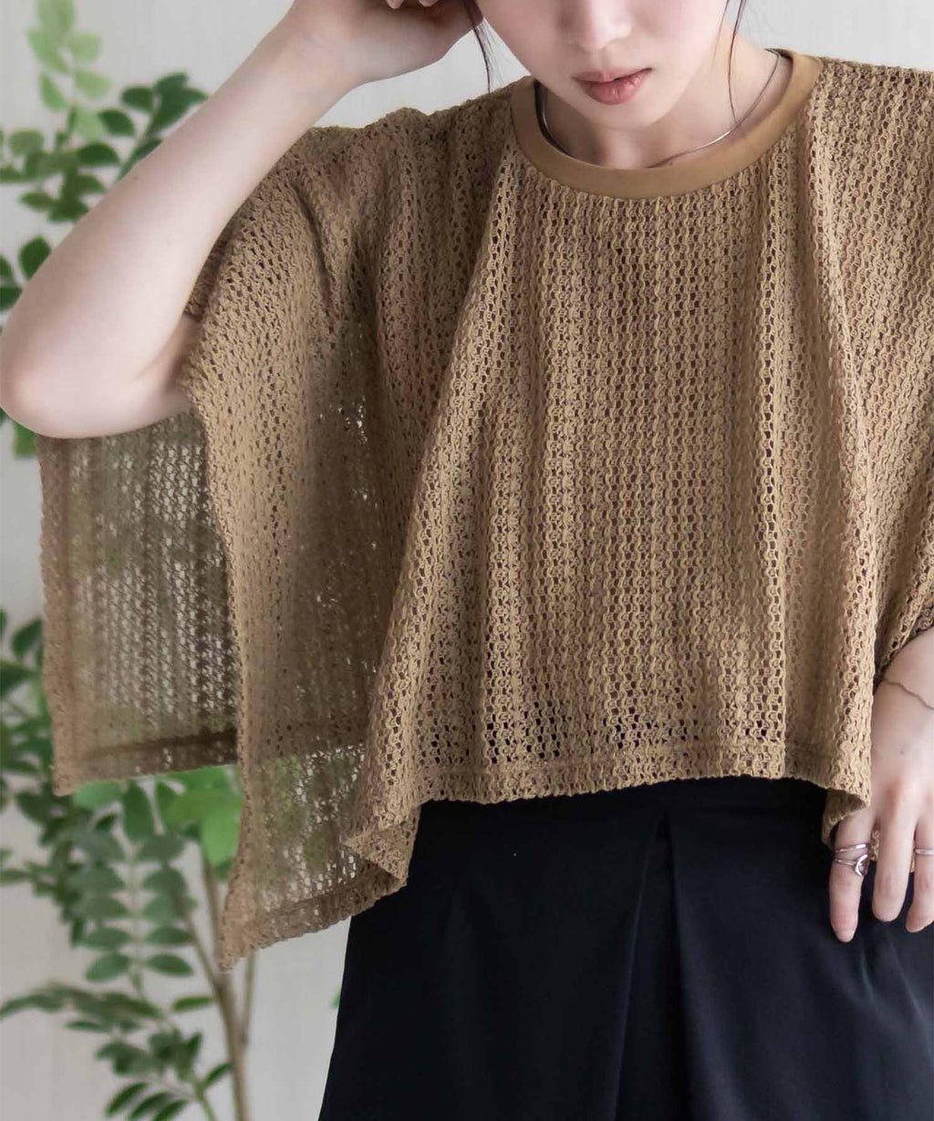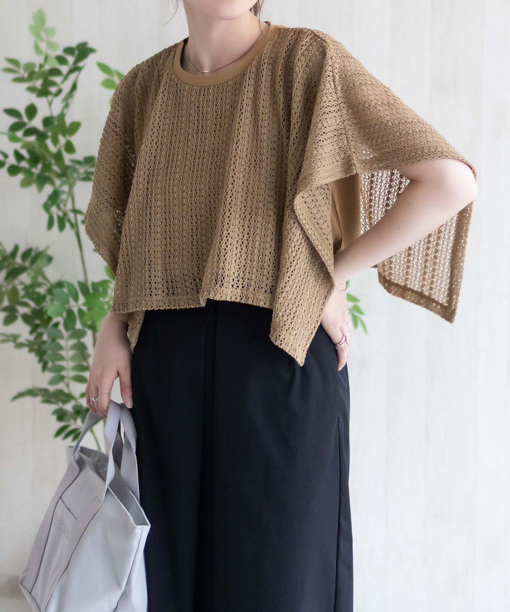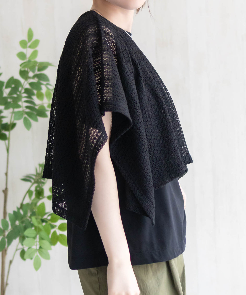 A design featuring a smooth lace fabric with a geometric pattern combined in a cape style.