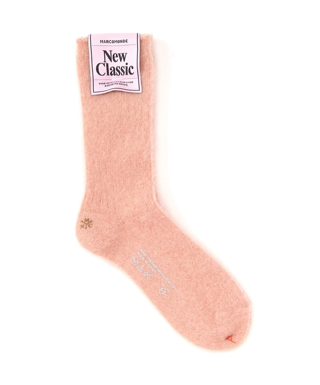 These are mohair socks made from mohair yarn with a brushed finish. The knitting pattern is intentionally ribbed, giving not only a fluffy texture but also a sharp impression. The yarn is fine and thinner than it looks, making it suitable to pair with Pumps. Ideal for adding a point of interest to your feet during the dark winter days.