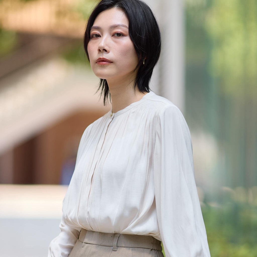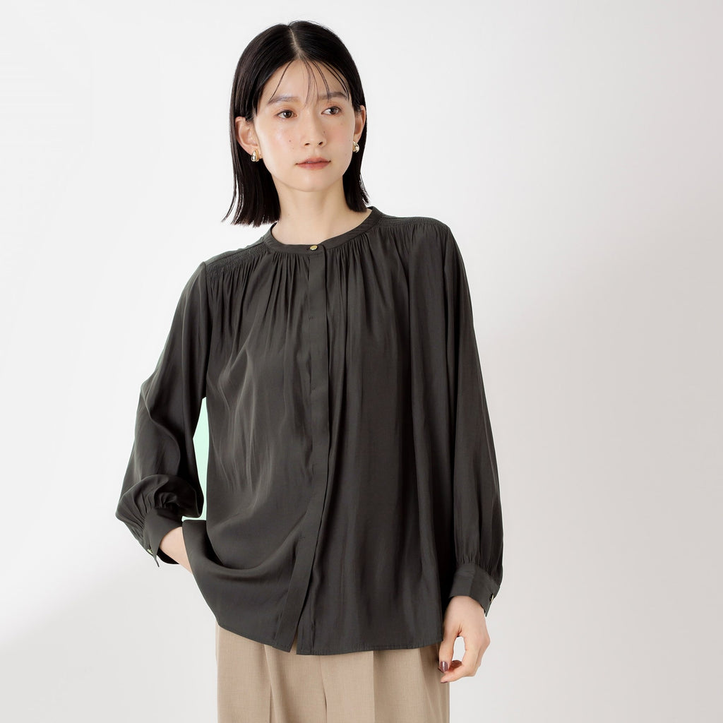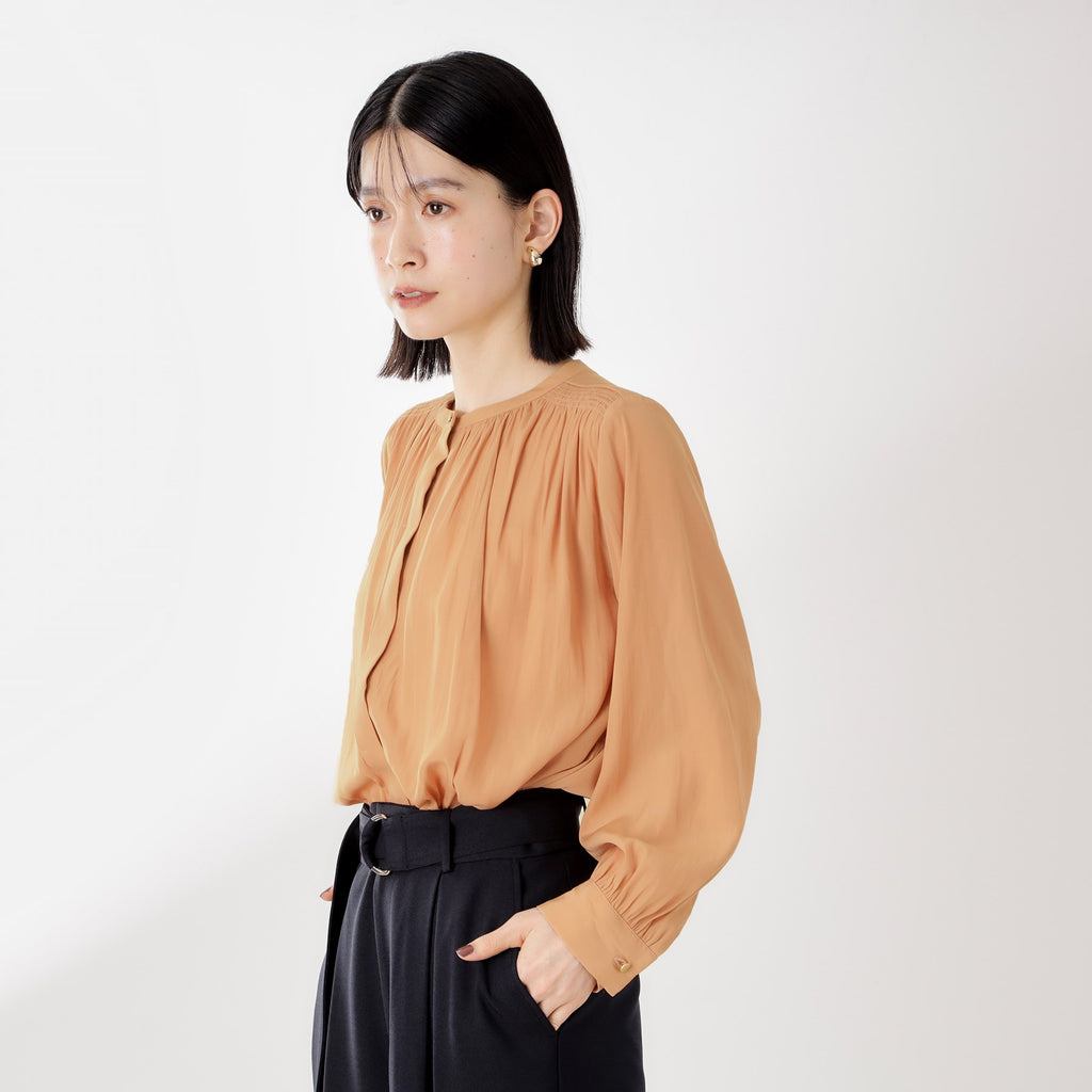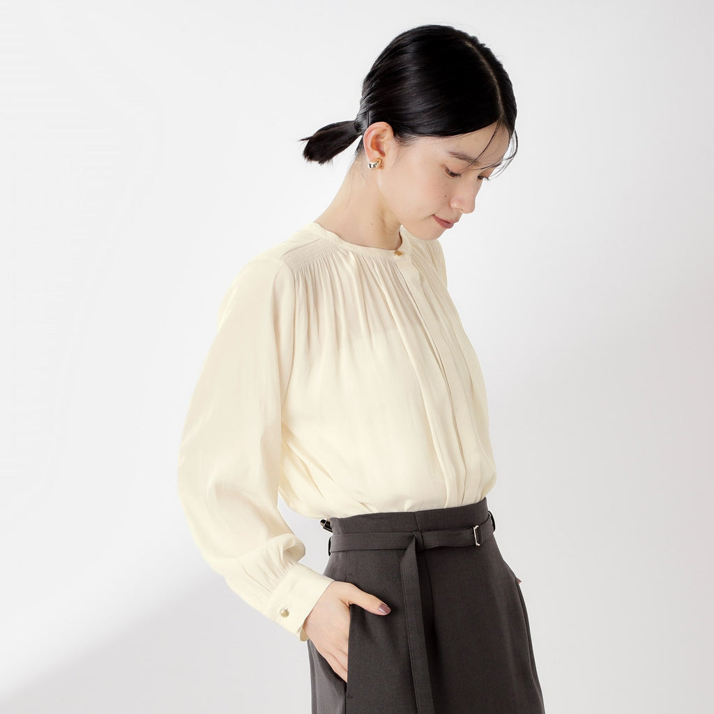 The satin blouse with finely gathered shirring stands out, blending a classic design with elegance.