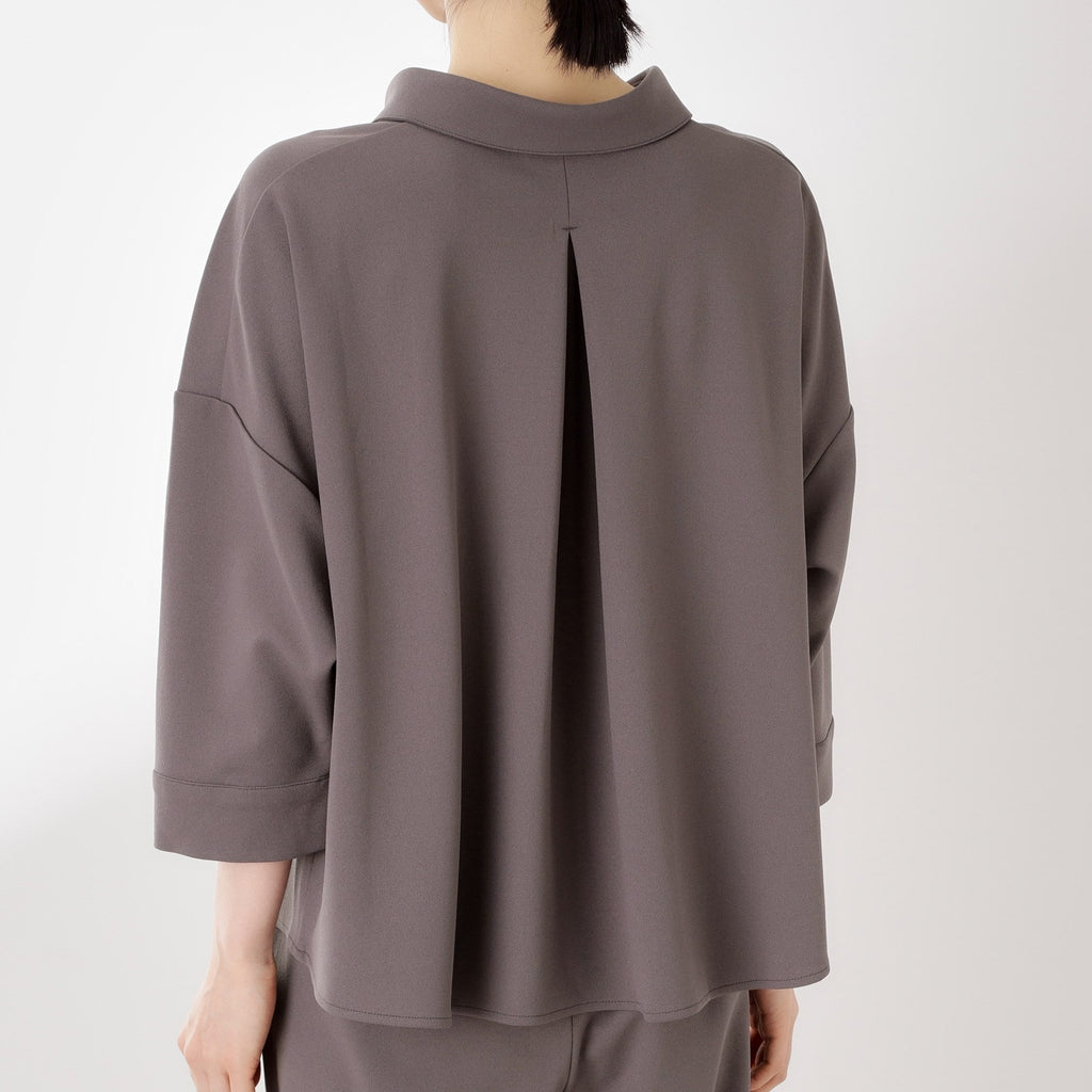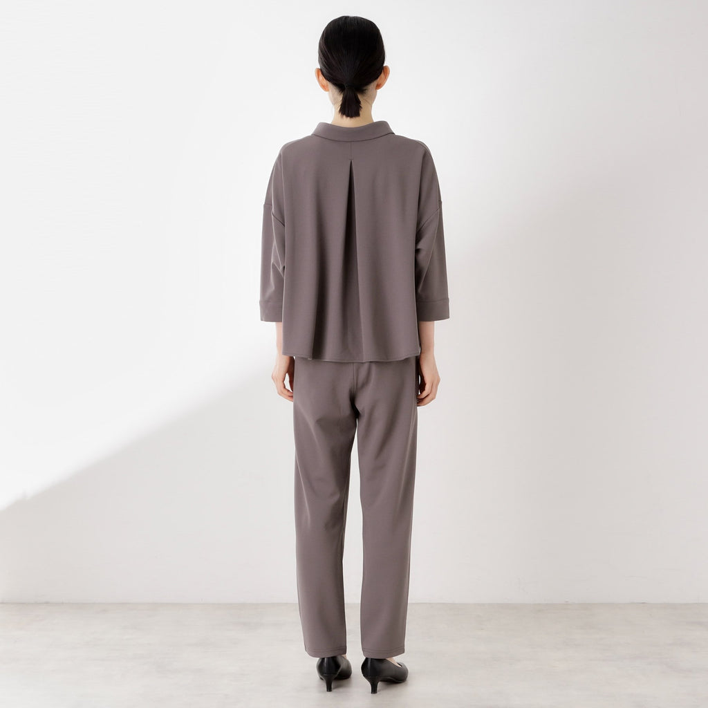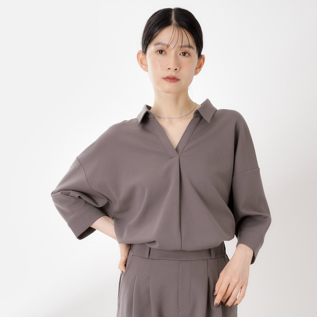 The top features a collarless design that creates a relaxed and feminine look.