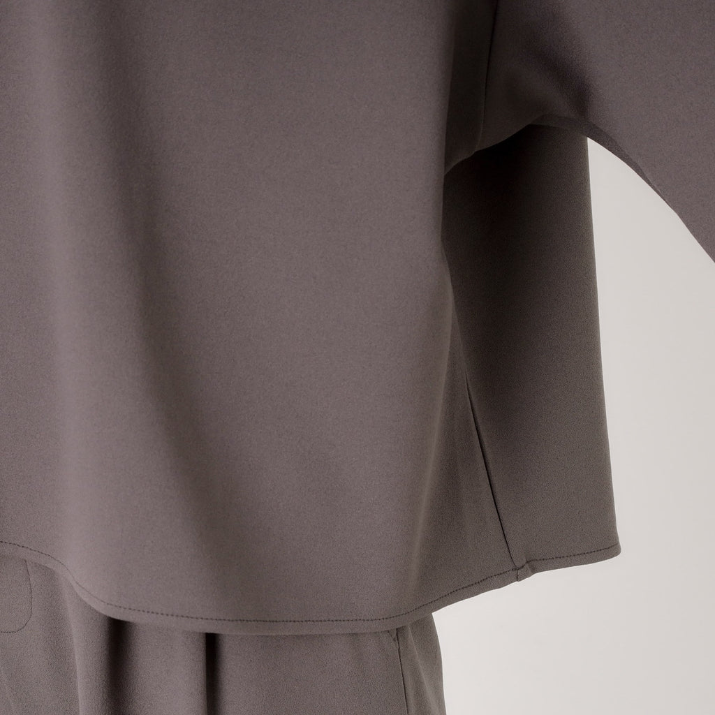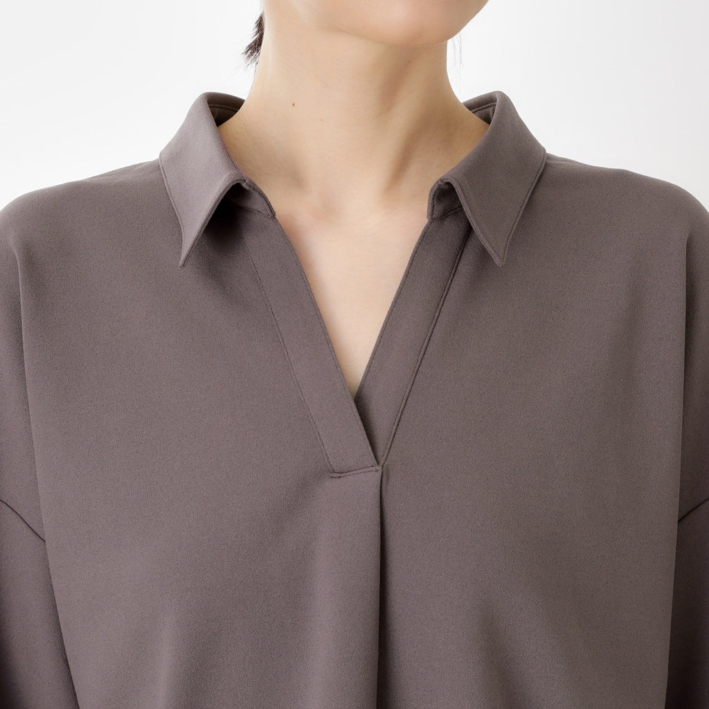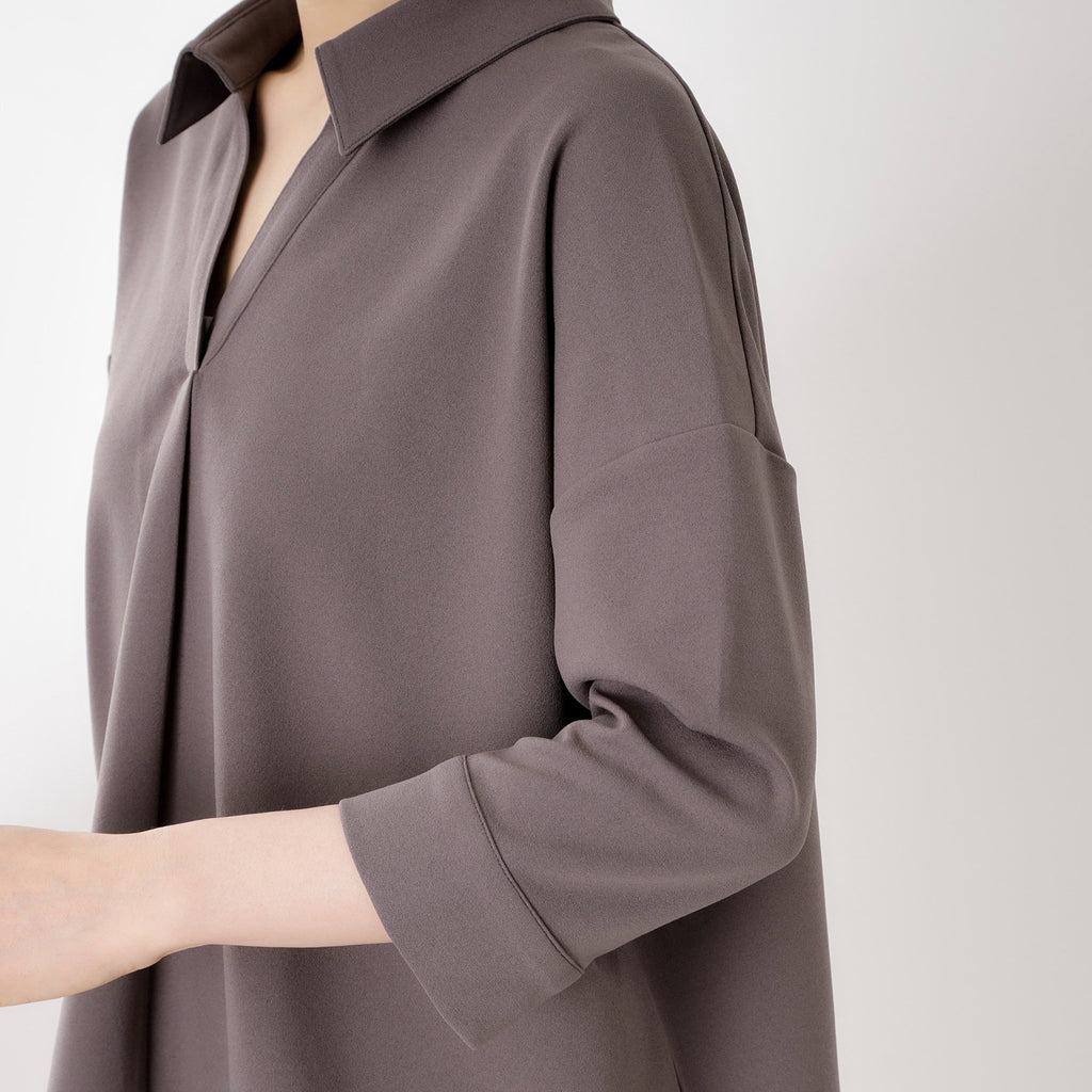 The top features a collarless design that creates a relaxed and feminine look.