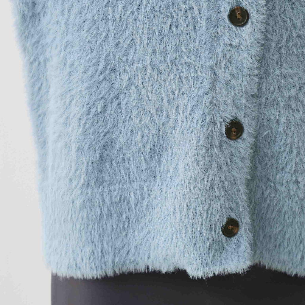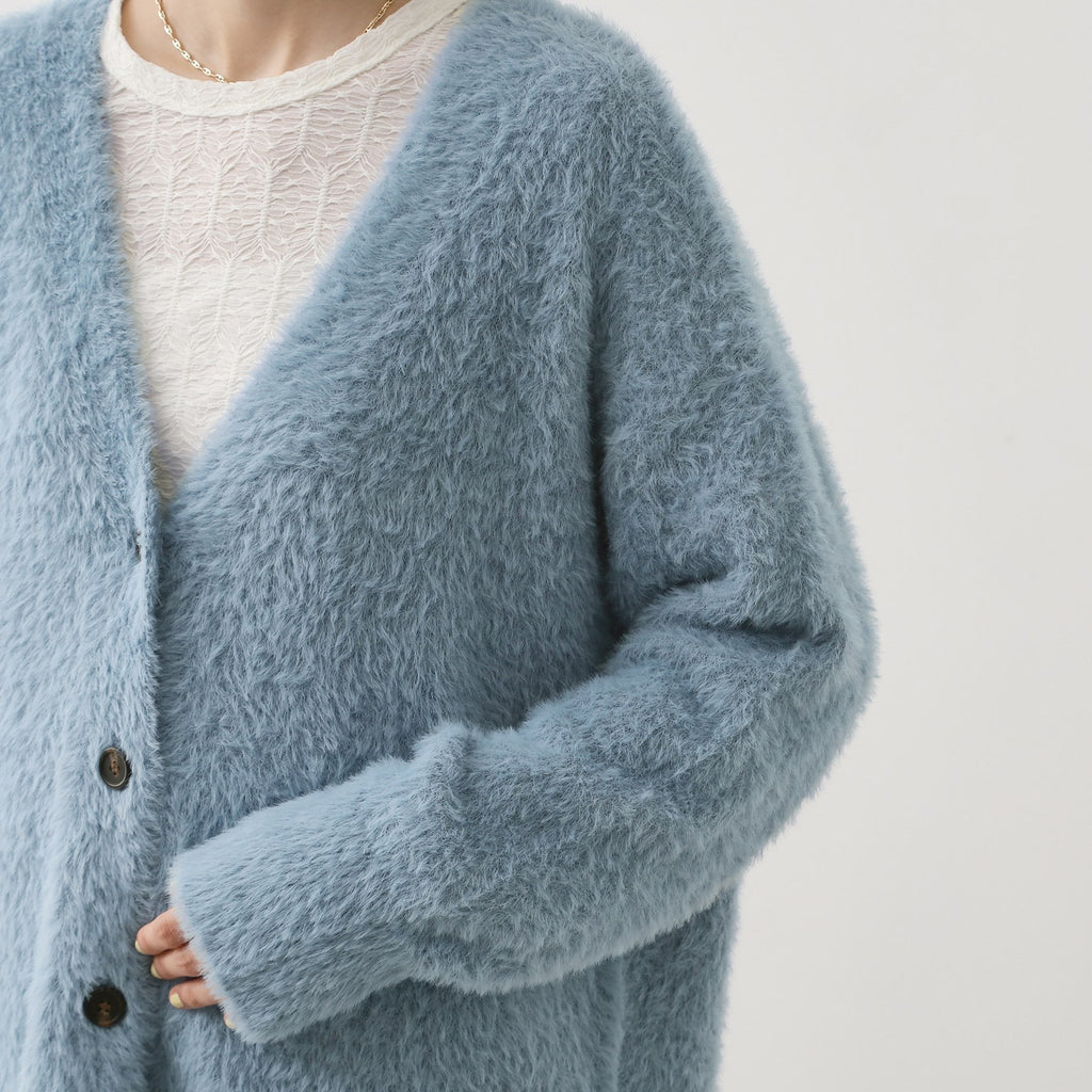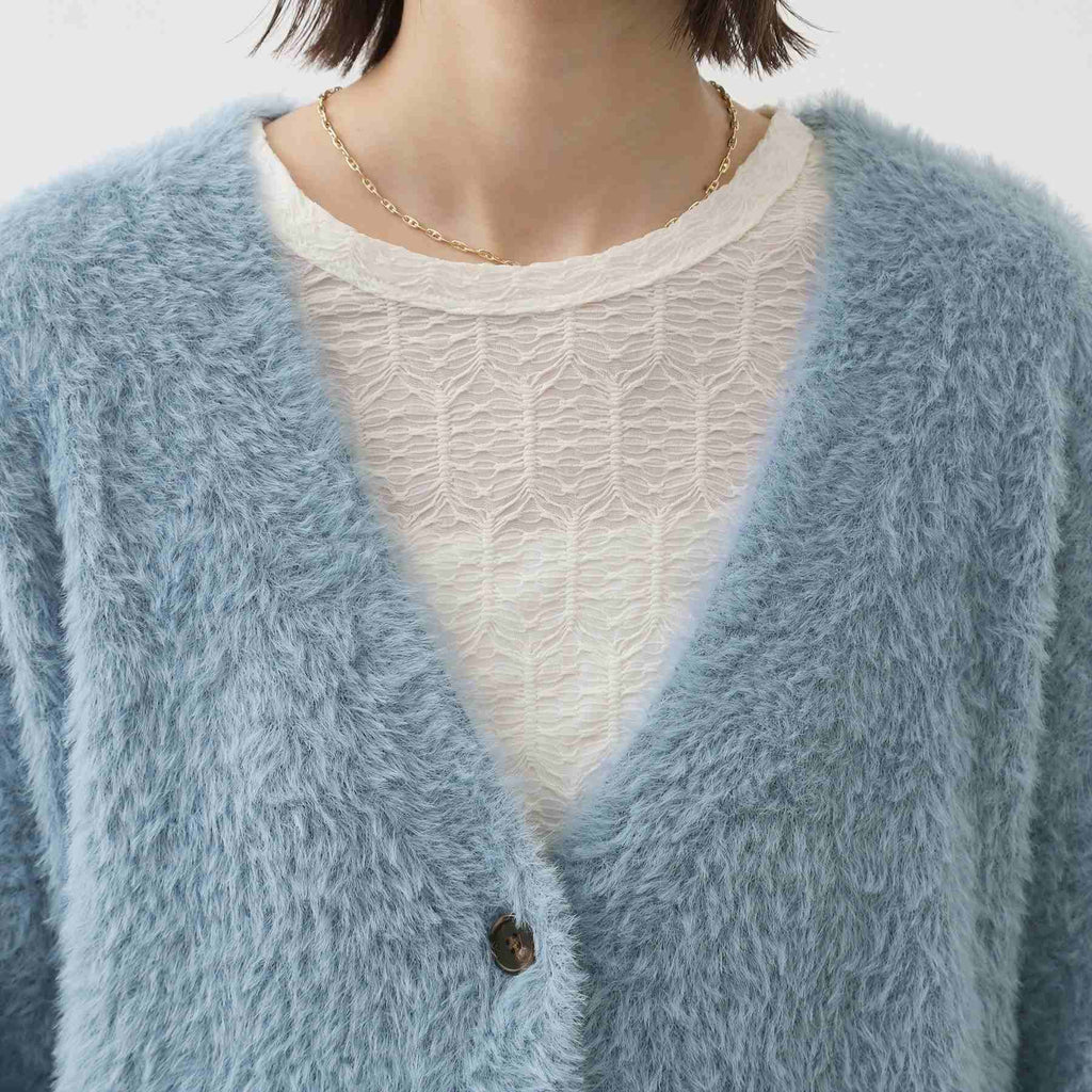 V-neck cardigan made from soft and supple feather knit, with a light and airy texture.