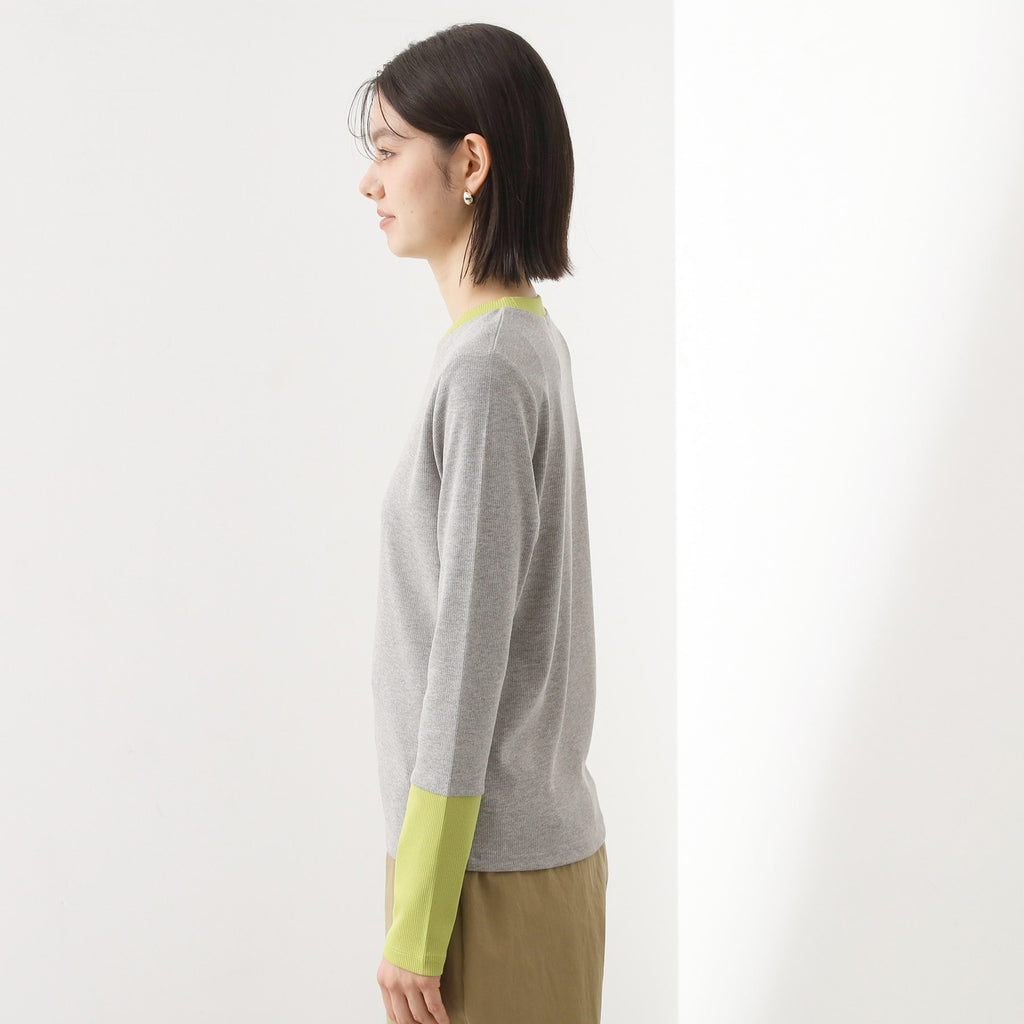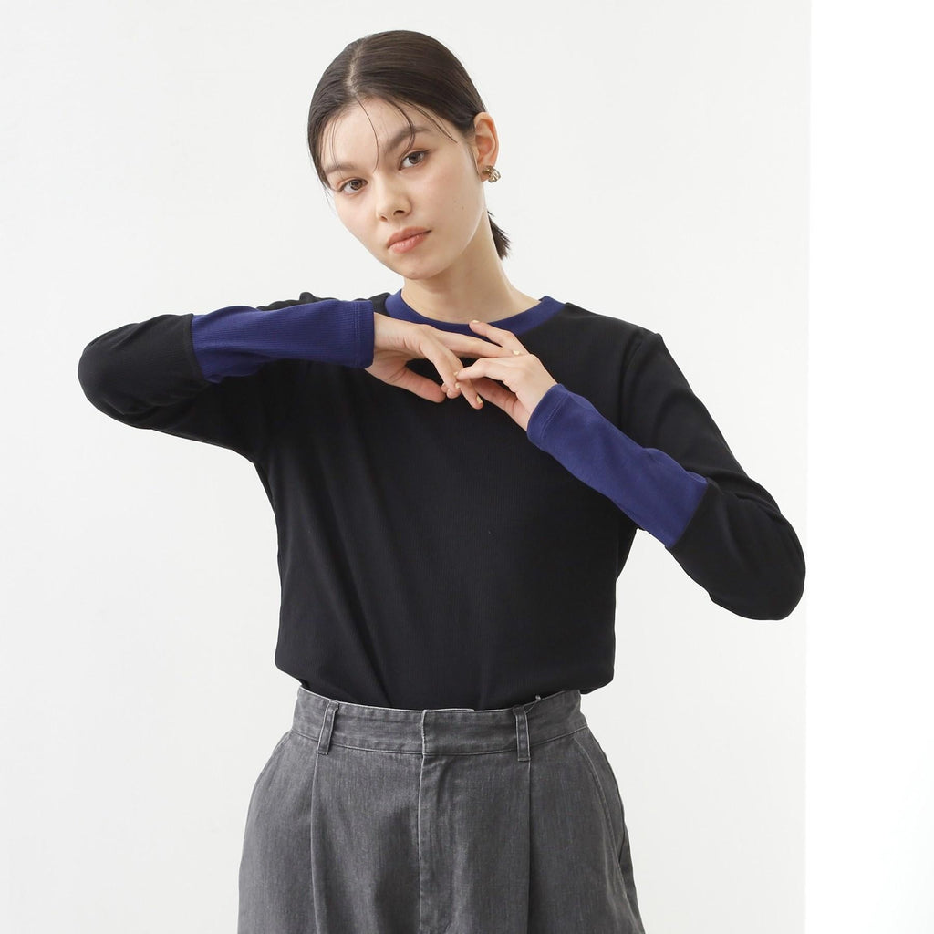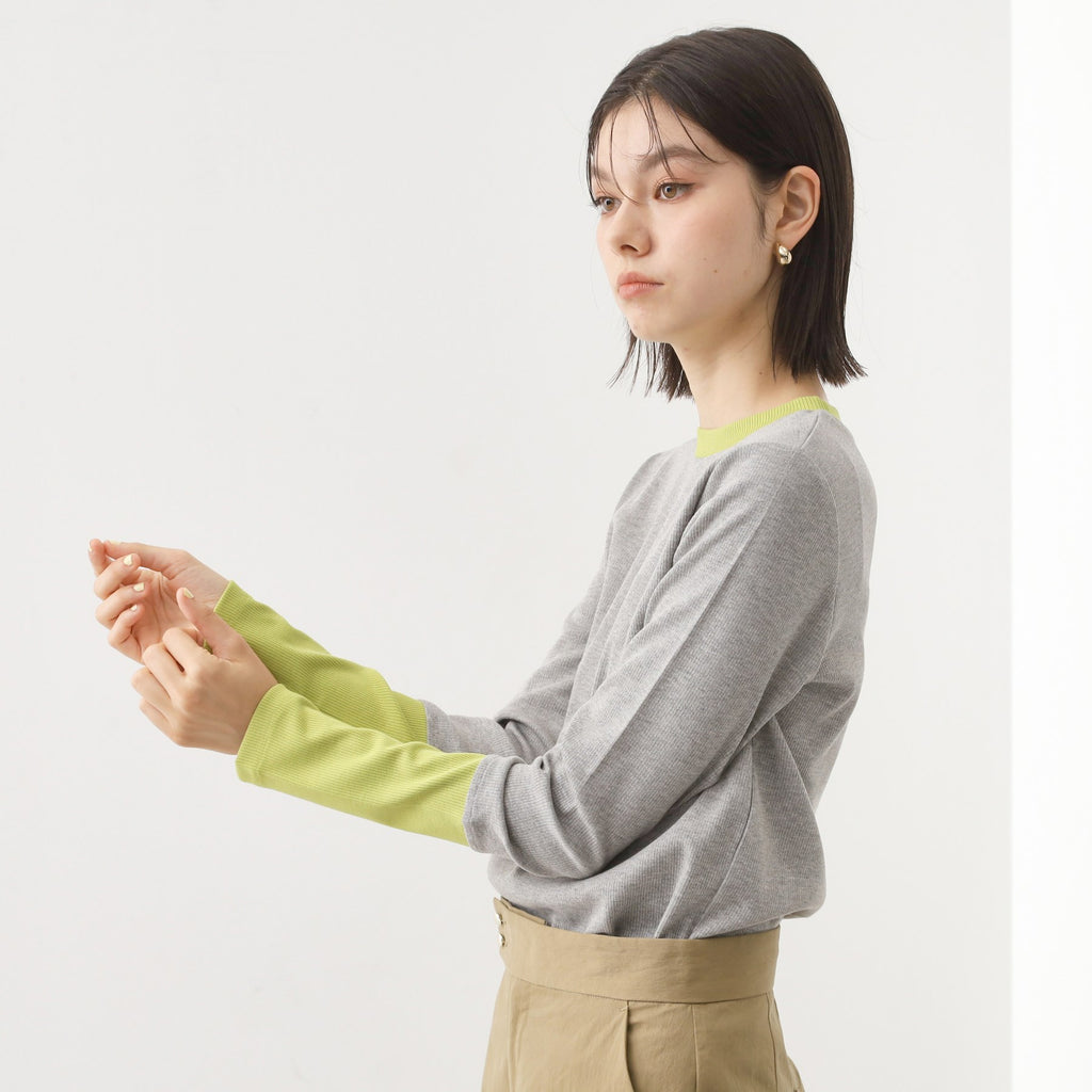 The terry cut-and-sew with a clear bi-color at the cuffs has a round neck design with a close-fitting neck, making it simple yet impactful.
