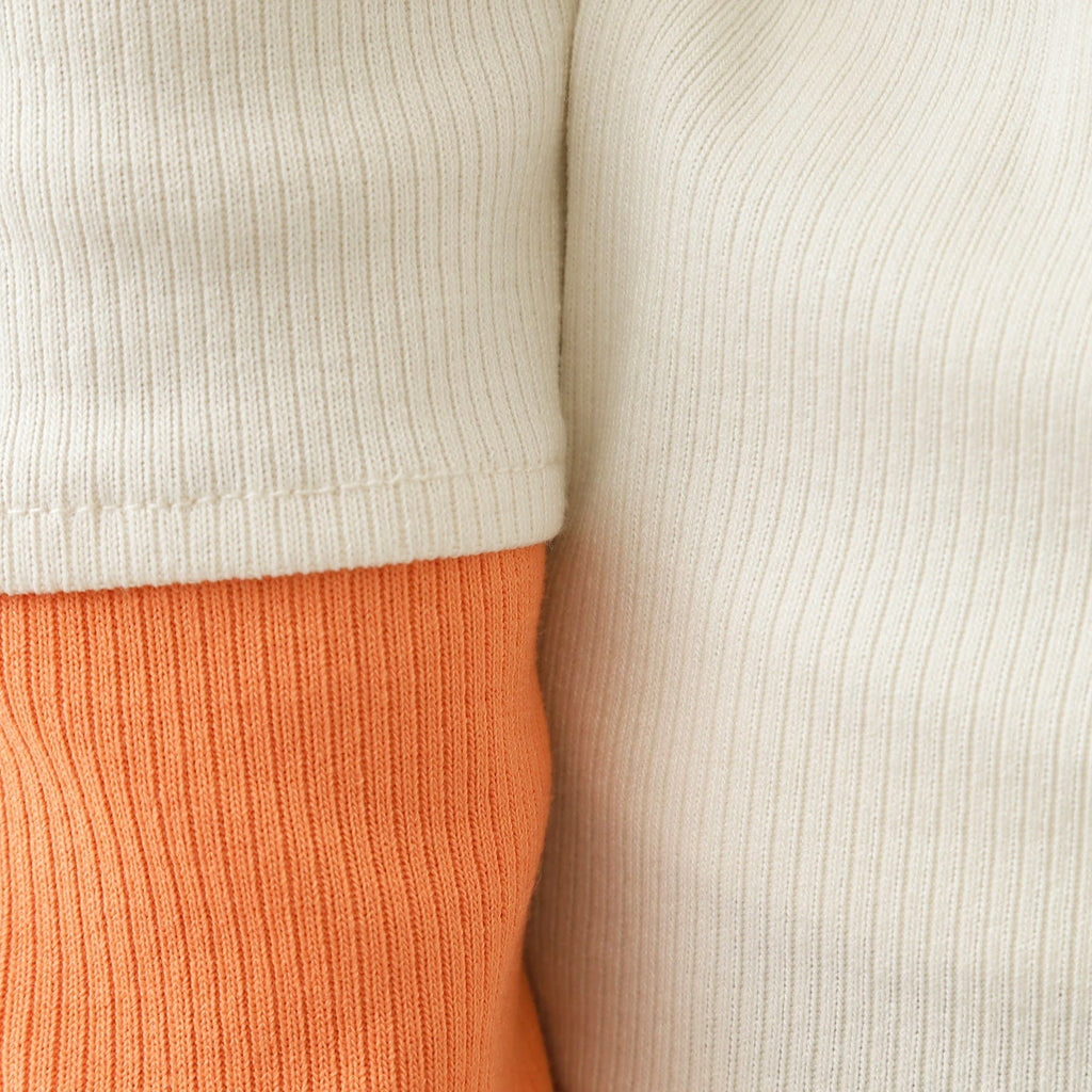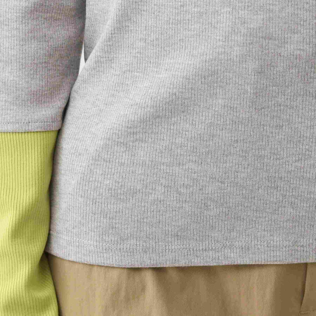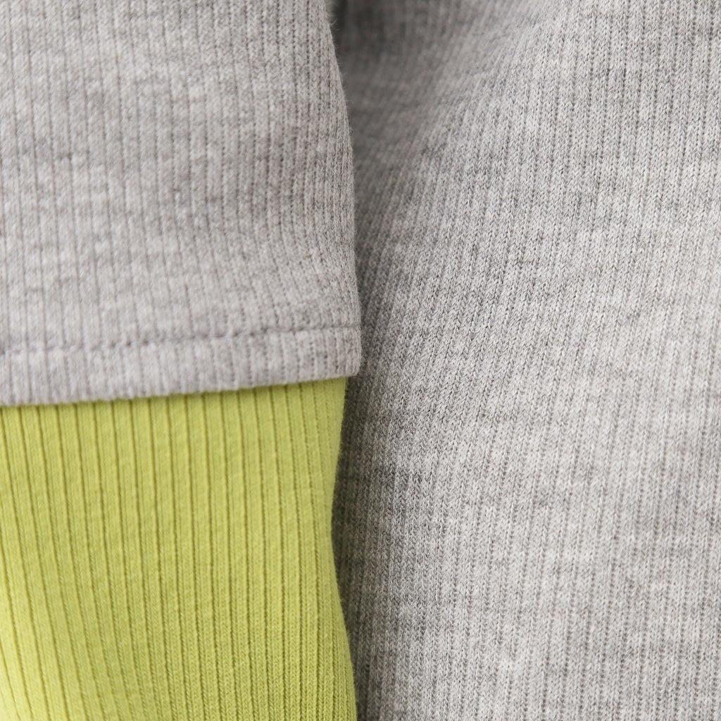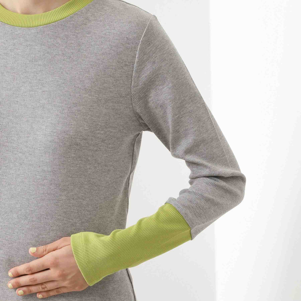The terry cut-and-sew with a clear bi-color at the cuffs has a round neck design with a close-fitting neck, making it simple yet impactful.