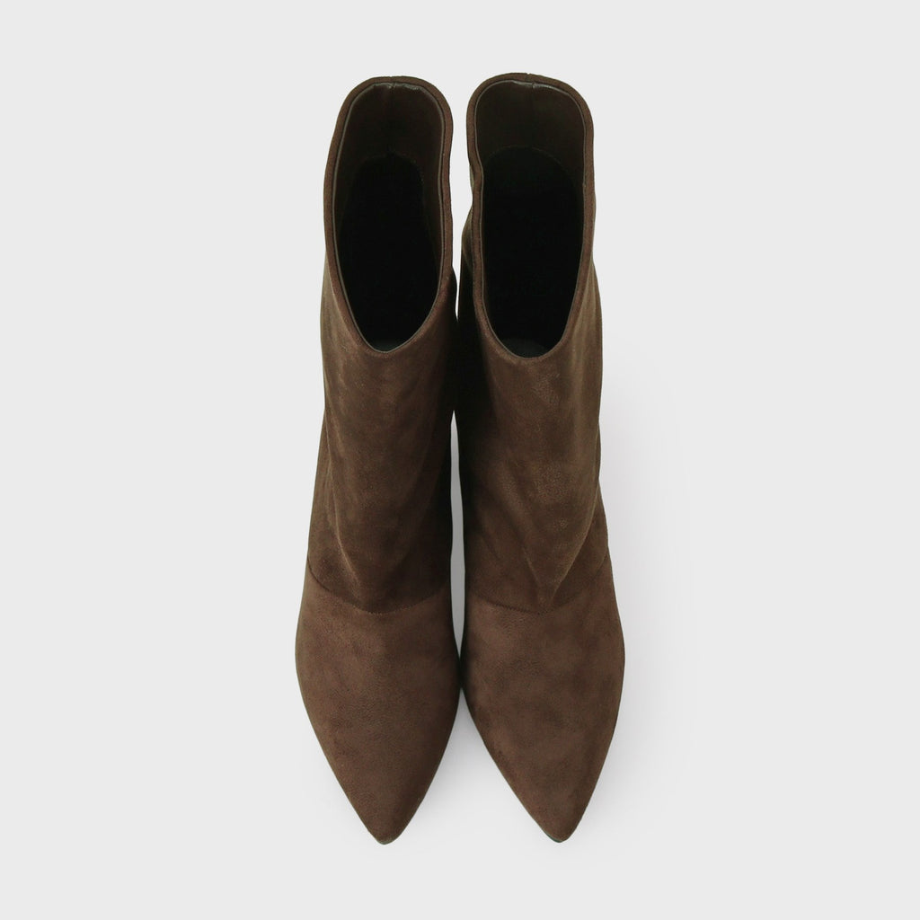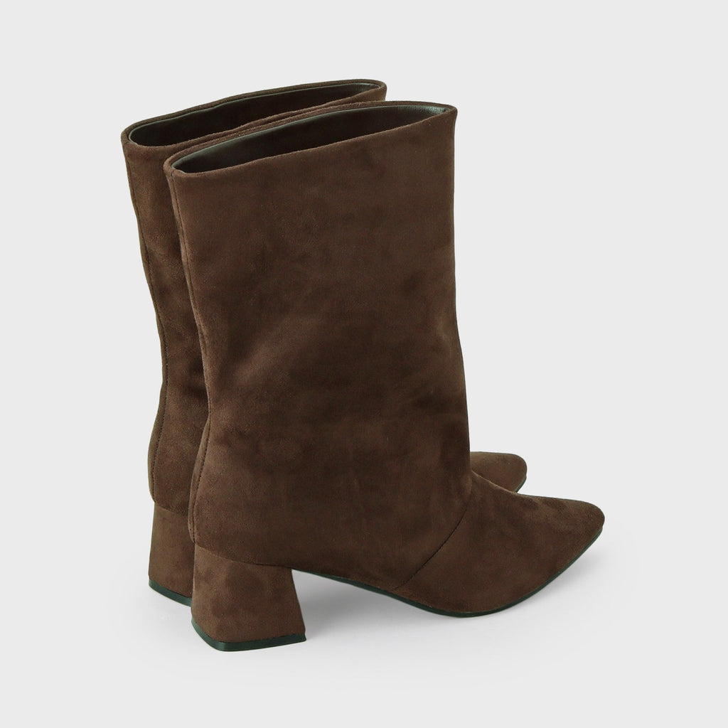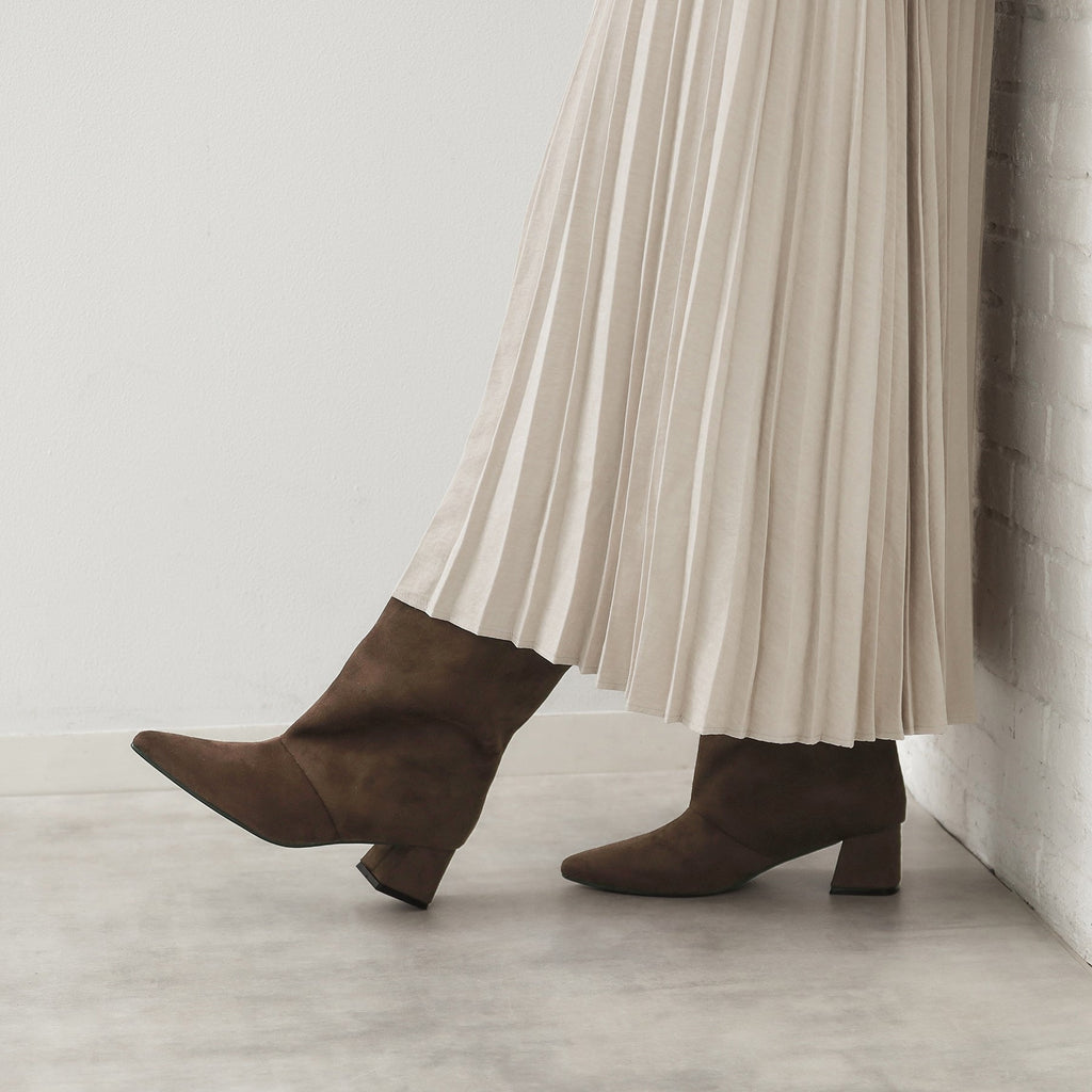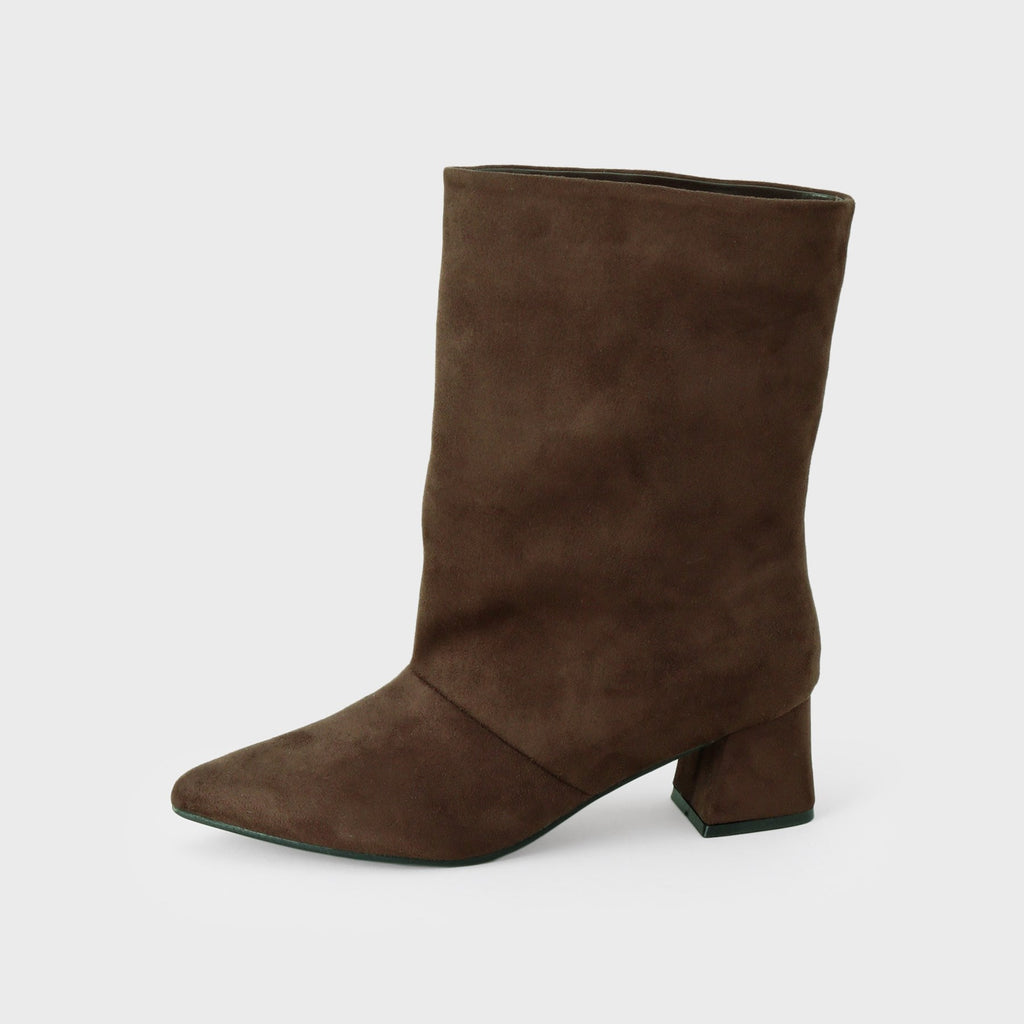 Wide shaft boots made of fake suede, characterized by a thick and relaxed design from the ankle to the tubular part.