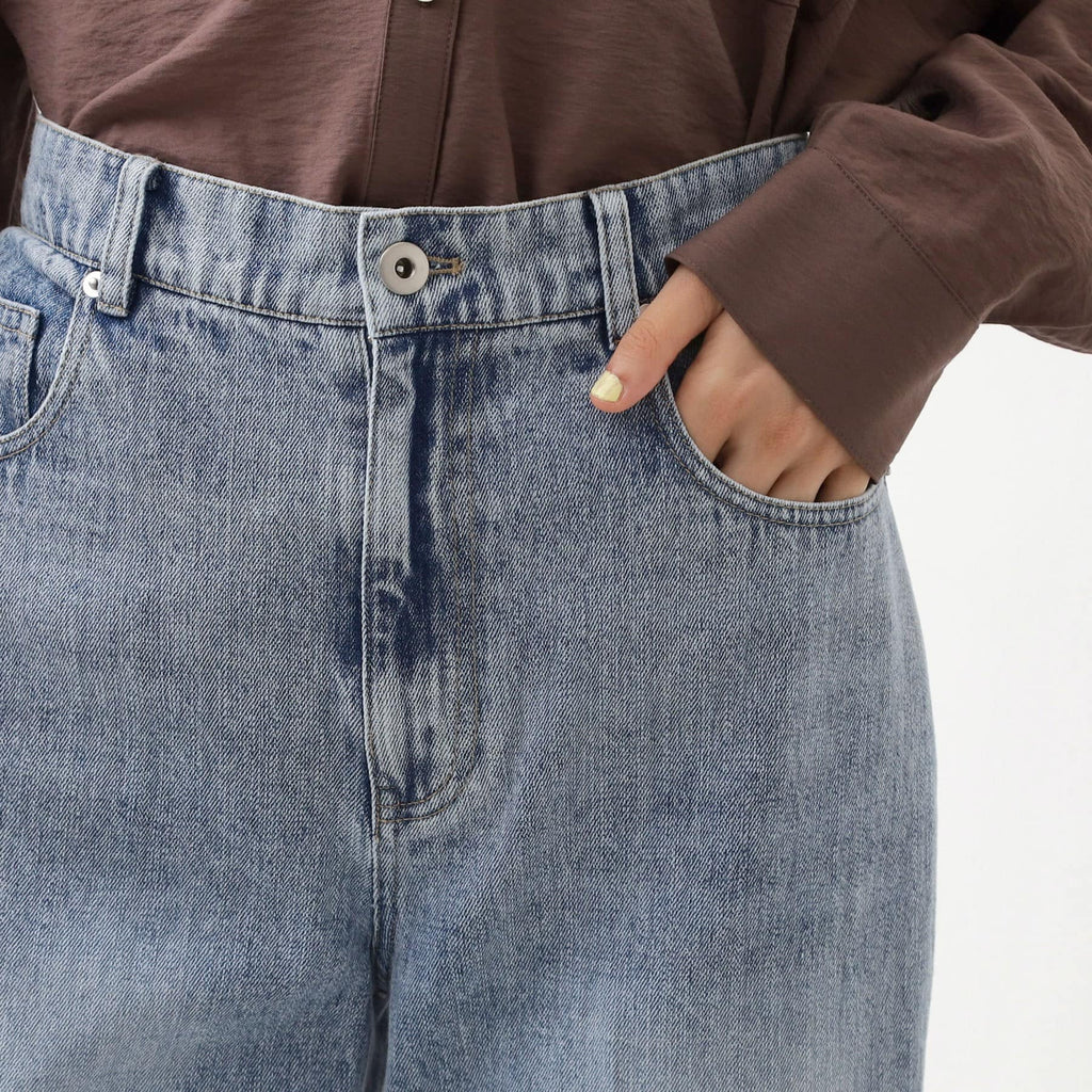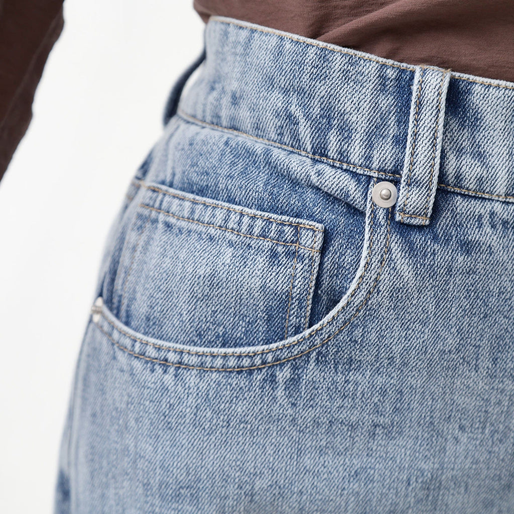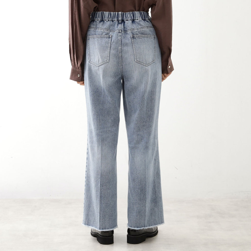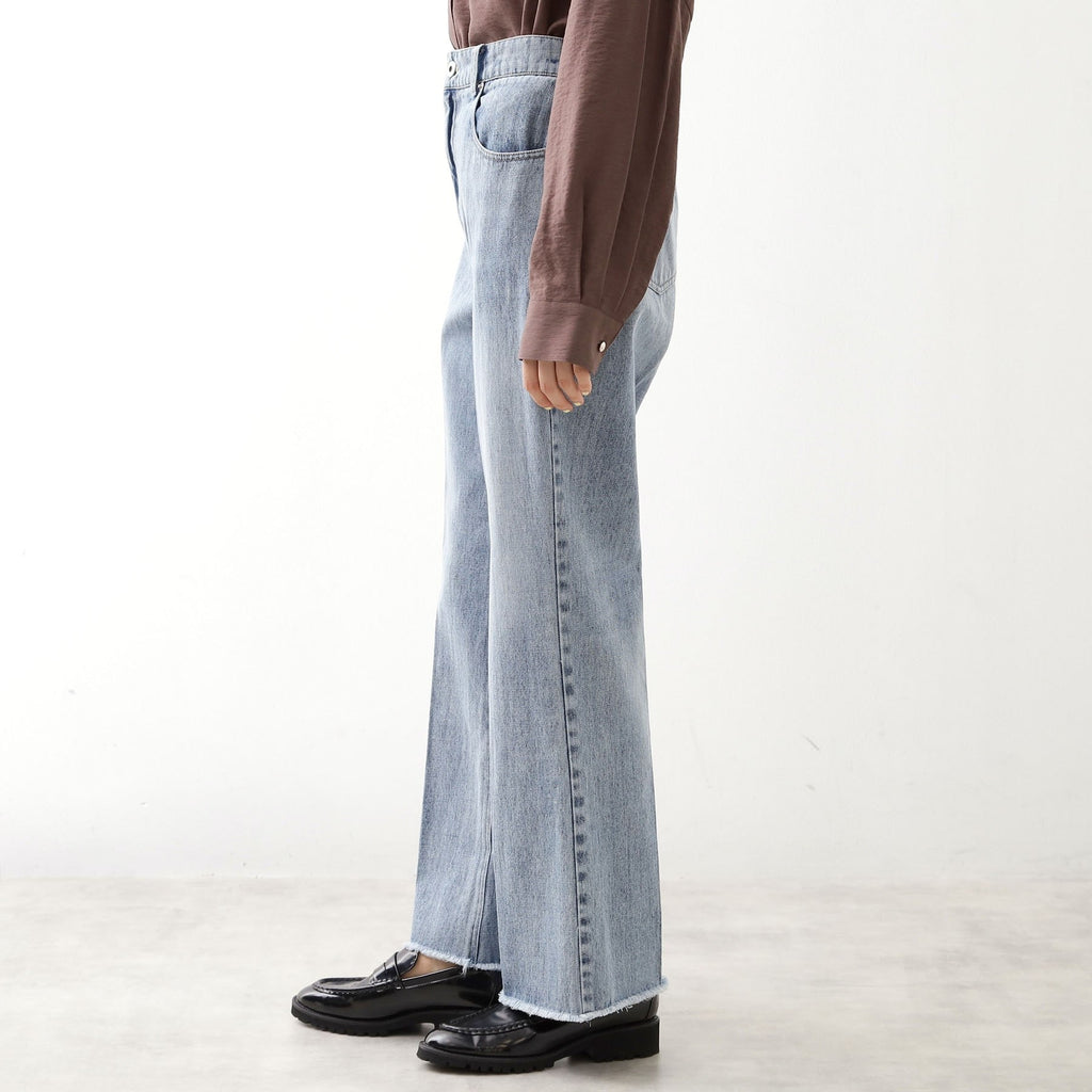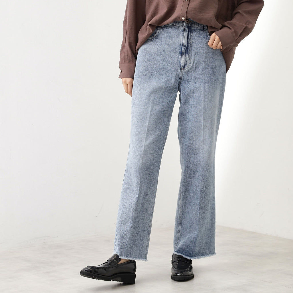 Flare silhouette denim pants are characterized by their clean appearance, thanks to the center press.