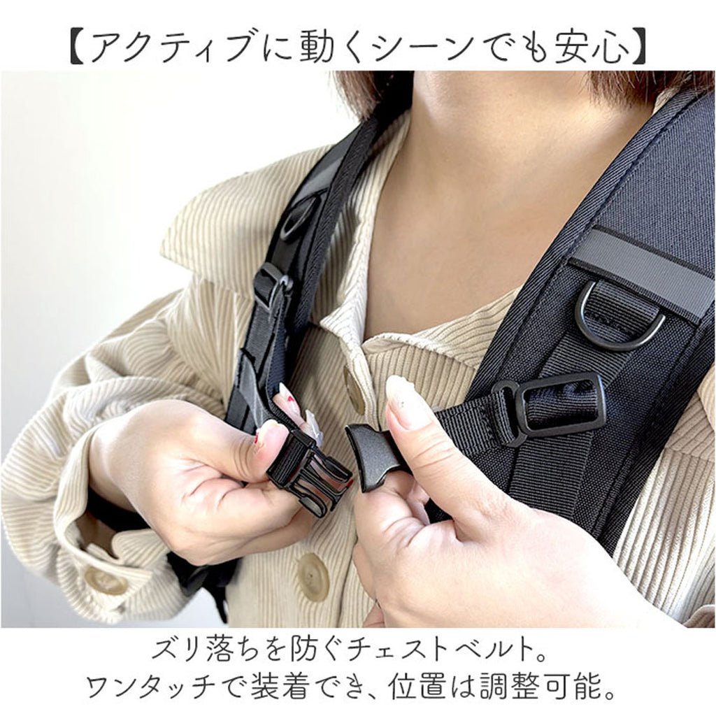 ・Chest belt prevents slipping. It can be easily attached with one touch and is adjustable.