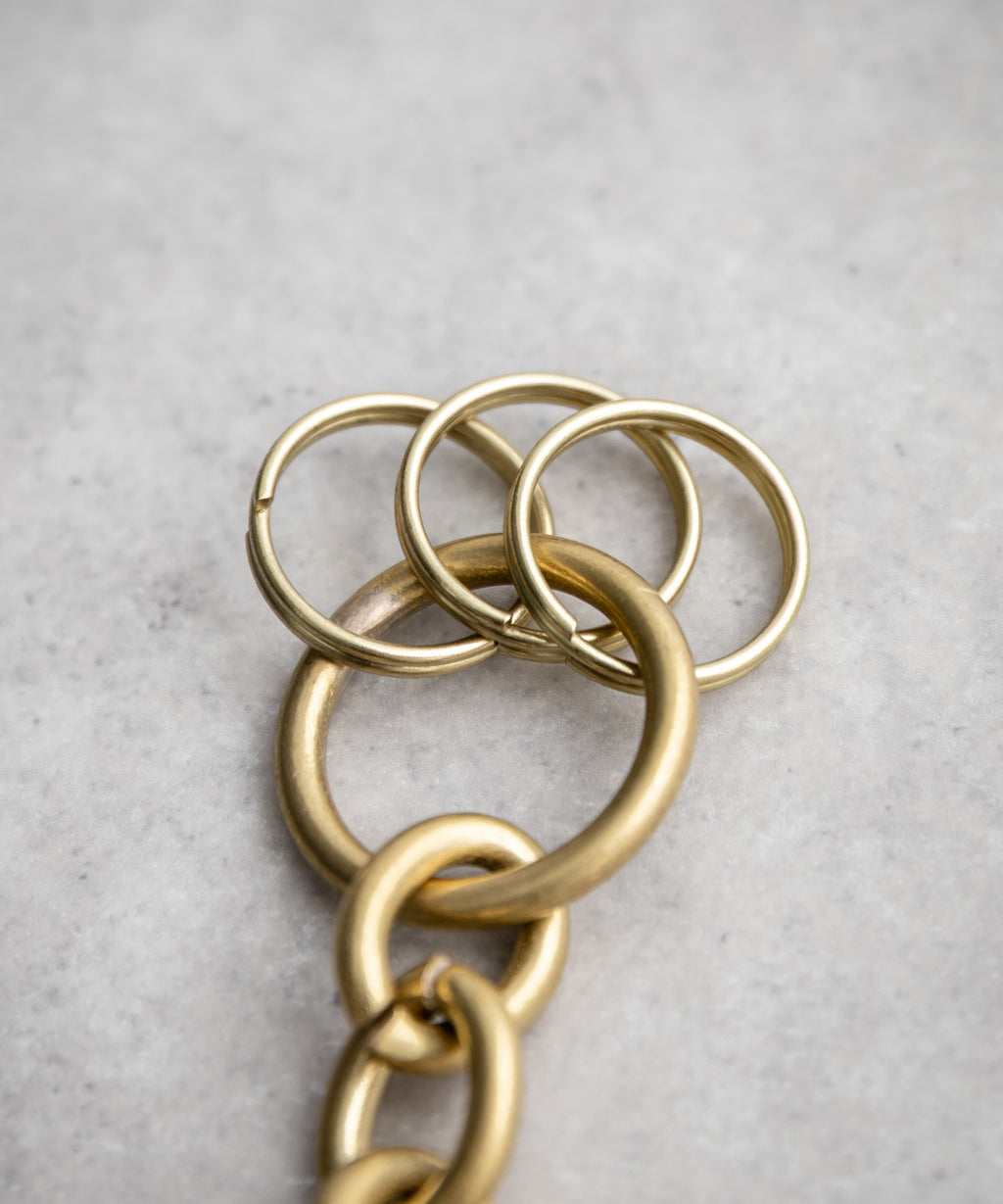 Only the small double ring at the top is made of an alloy (brass-plated). All other parts are made entirely of brass. A 2mm thick brass plate is cut out, printed, and then subjected to a baking process, followed by barrel polishing to add a slightly aged texture. With use, the unique aging of brass will appear, enhancing its flavor.