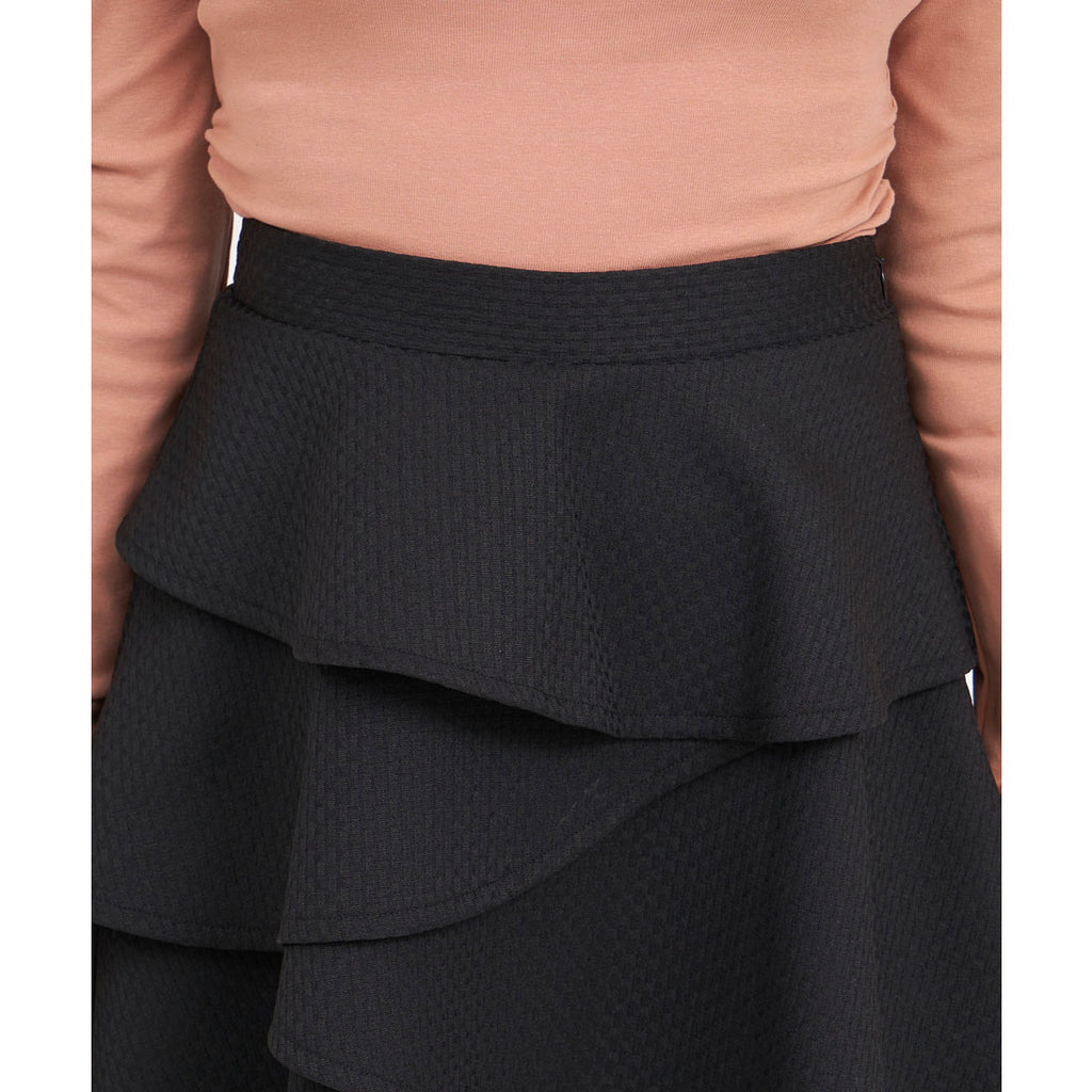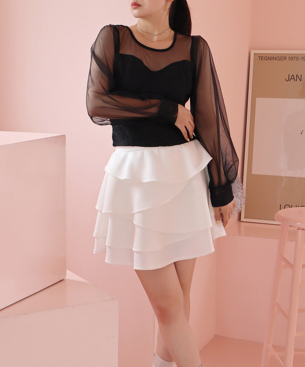 The tiered mini skirt, generously adorned with ruffles, comes with inner shorts for added security.