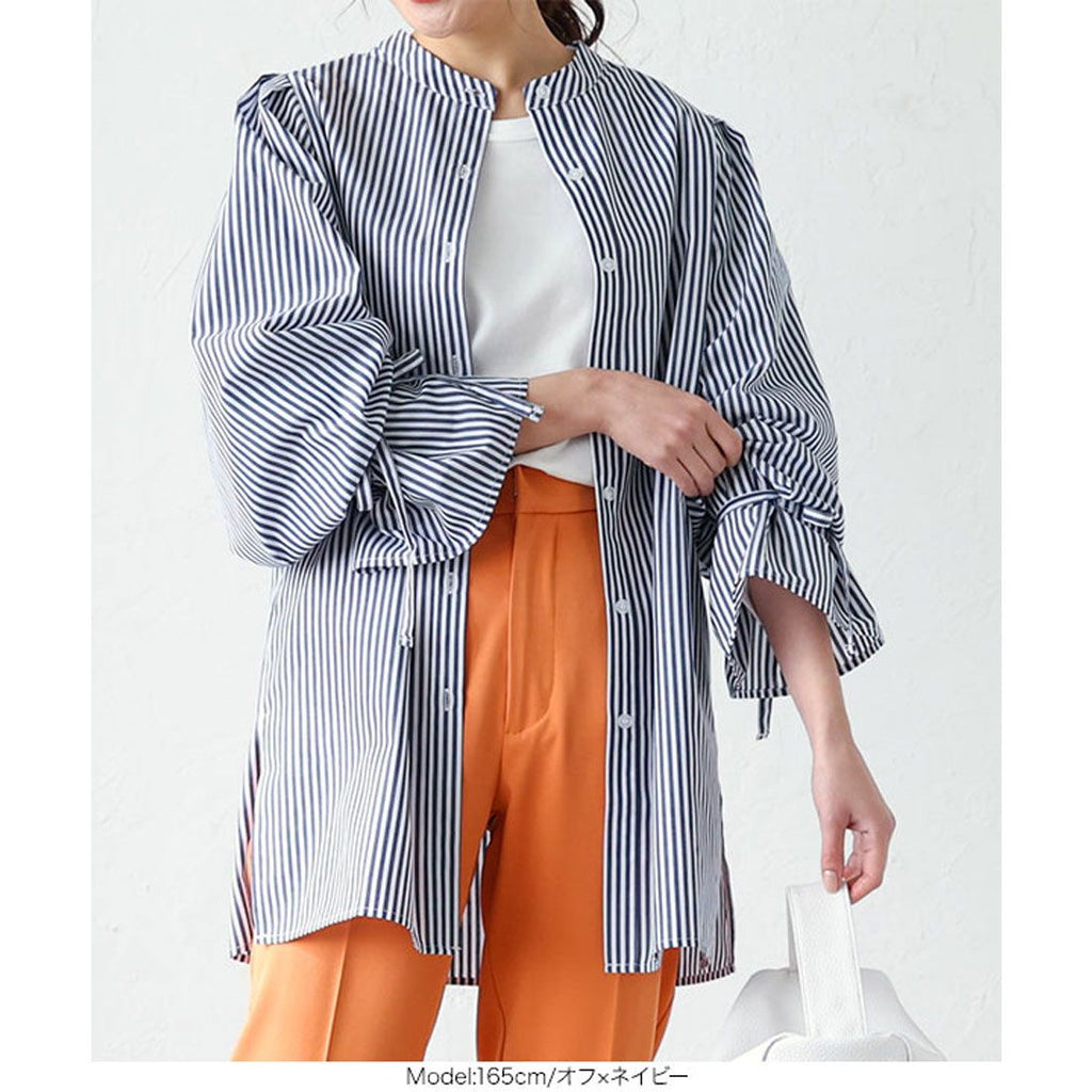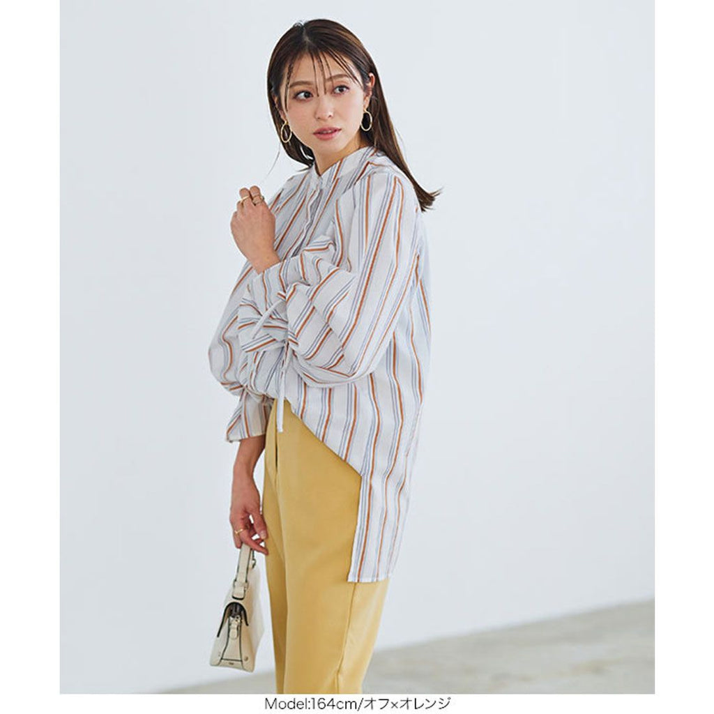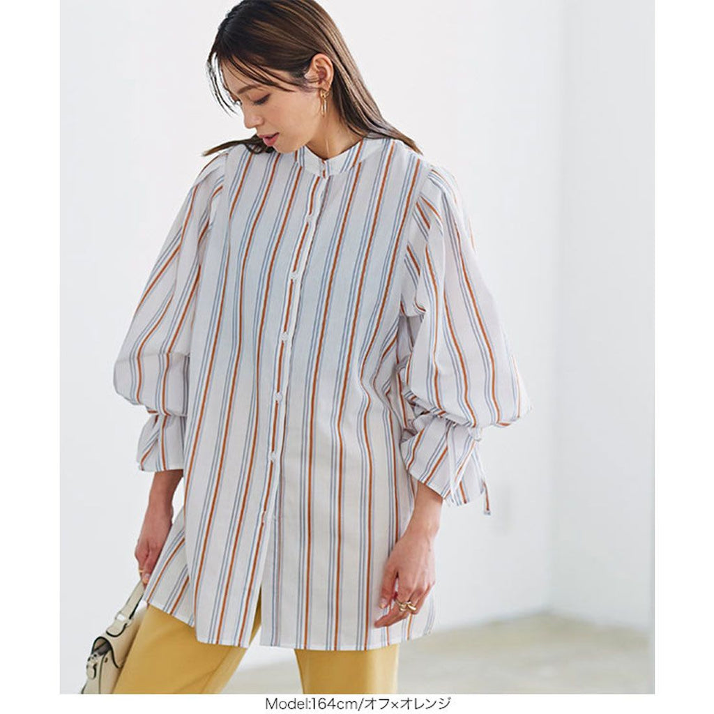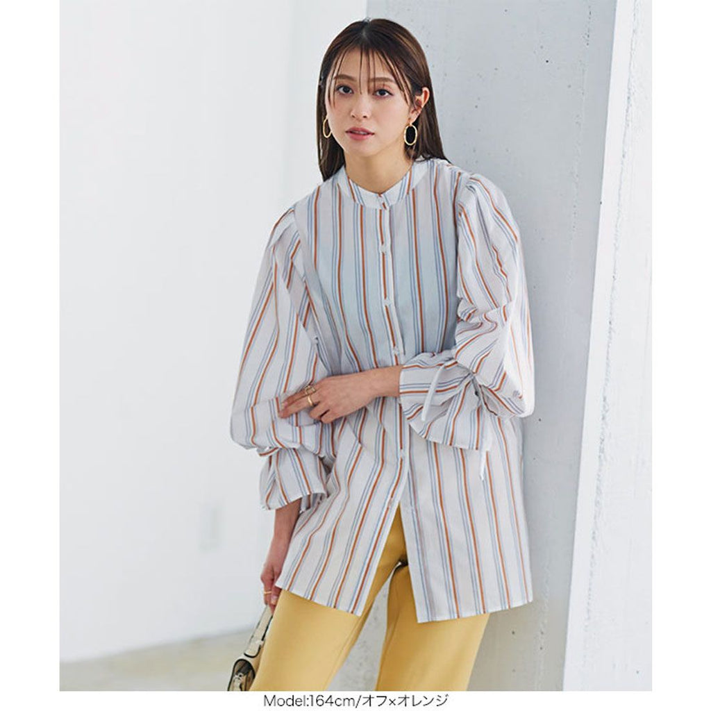 | Material | 80% polyester, 20% cotton *[Stretch] None/[Light color transparency] Slightly transparent/[Dark color transparency] Slightly transparent/[Lining] None [Country of origin] China ★ Striped sleeve ribbon blouse [C5896] Women's tops, outerwear, long sleeves, loose, casual, spring, band collar, candy sleeves, neat, casual, adult, figure-concealing |