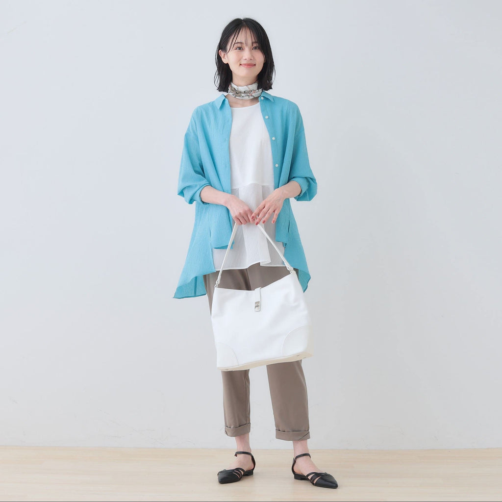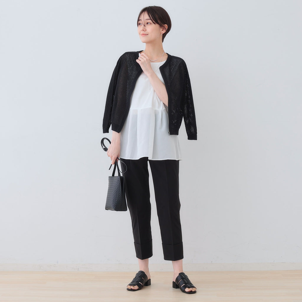 While pairing with pants is recommended, combining it with a long I-line skirt also creates a long and lean style that feels trendy and is recommended.