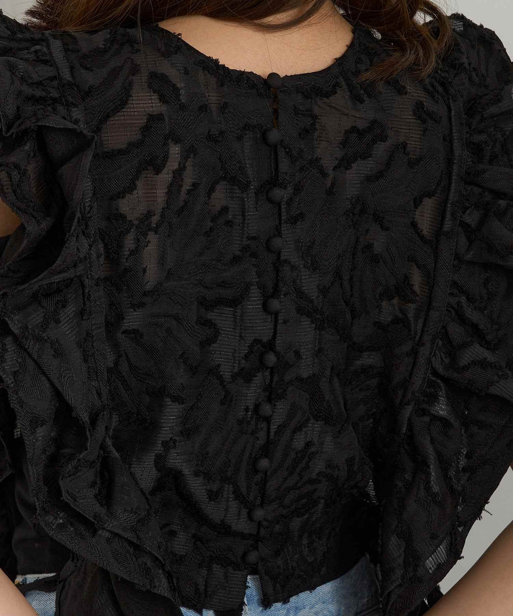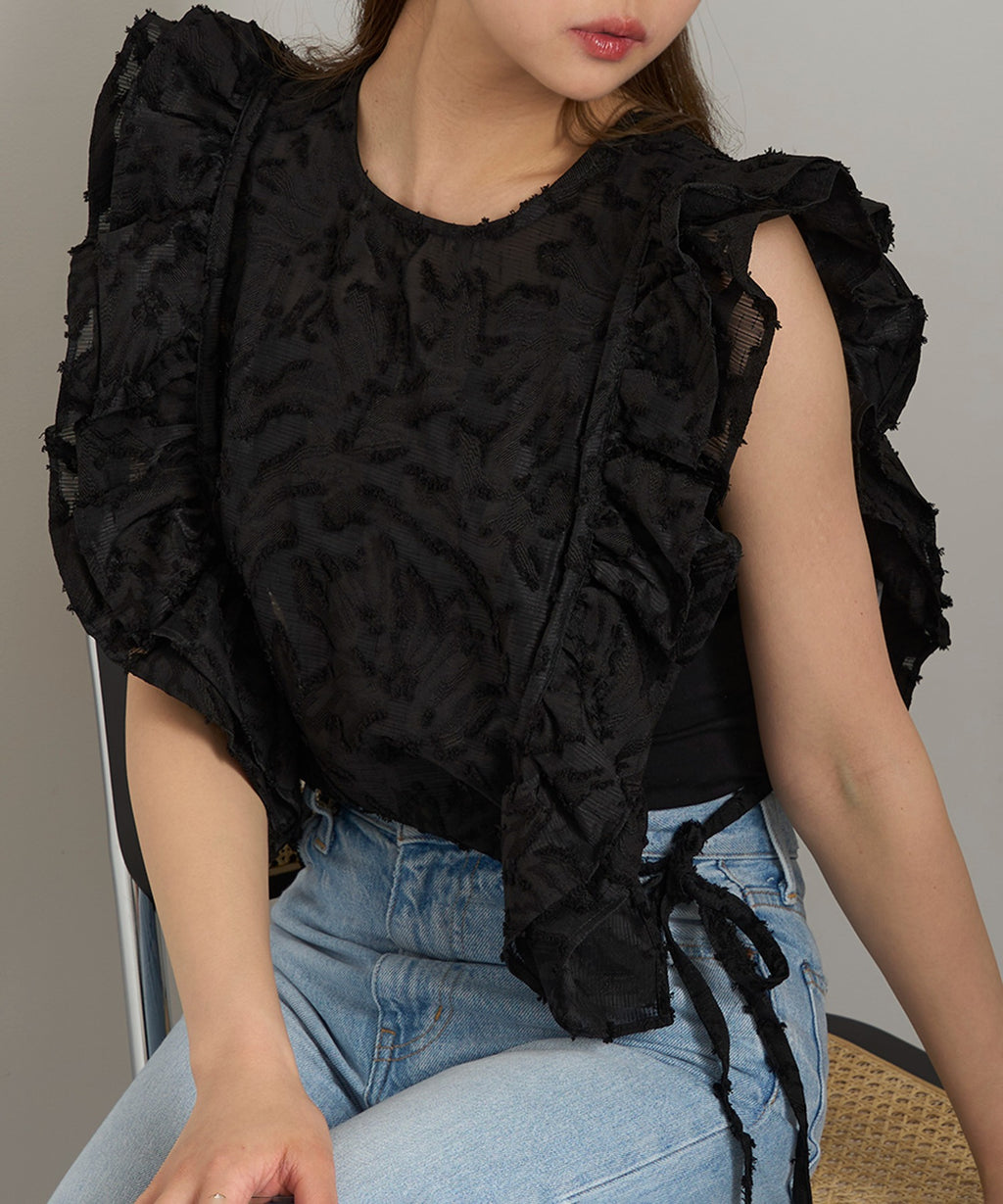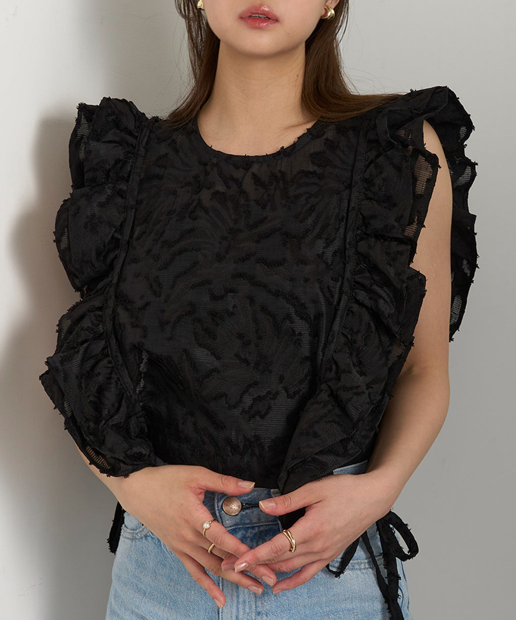 A gilet with a sophisticated fringe jacquard texture and charming frill details.