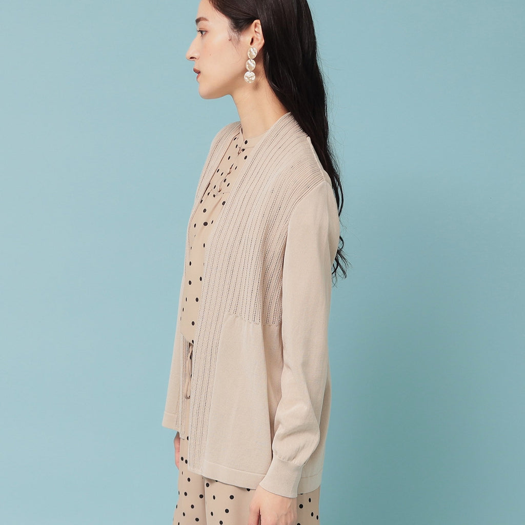 This is a light knit cardigan typical of Suna, featuring a combination of fine ribbing with a watermark pattern and jersey knit, designed in a peplum silhouette.