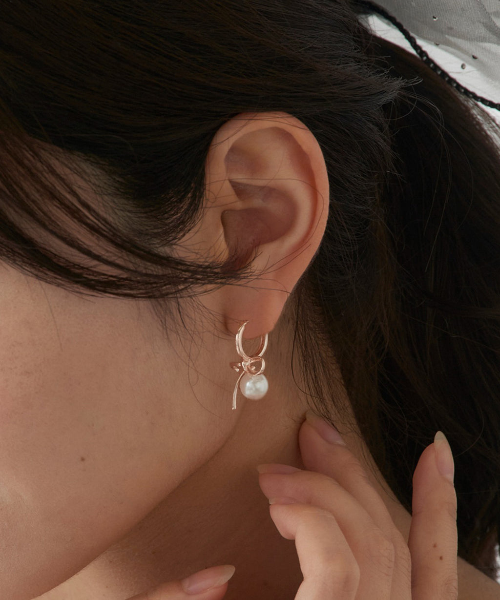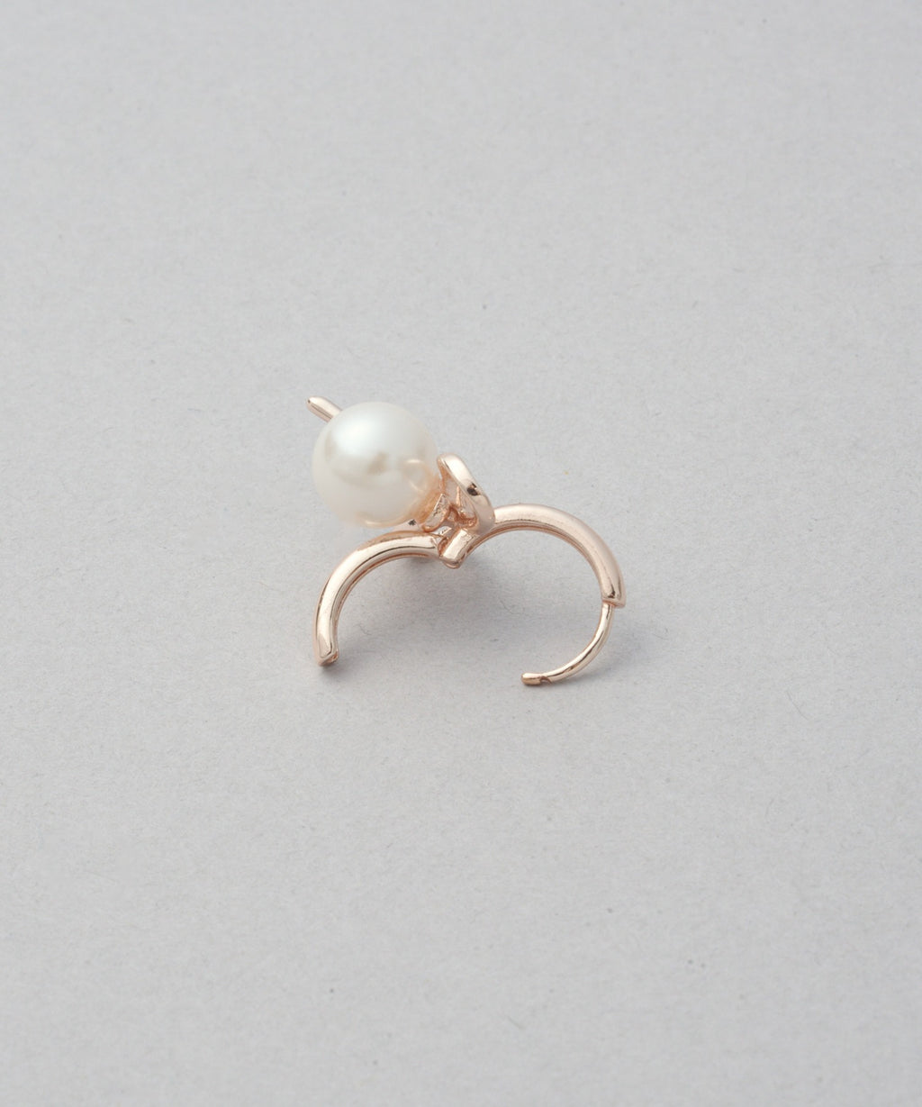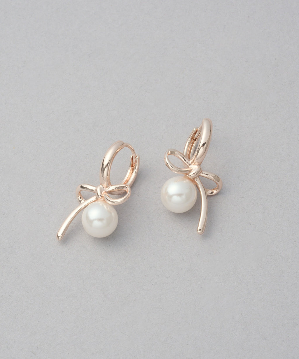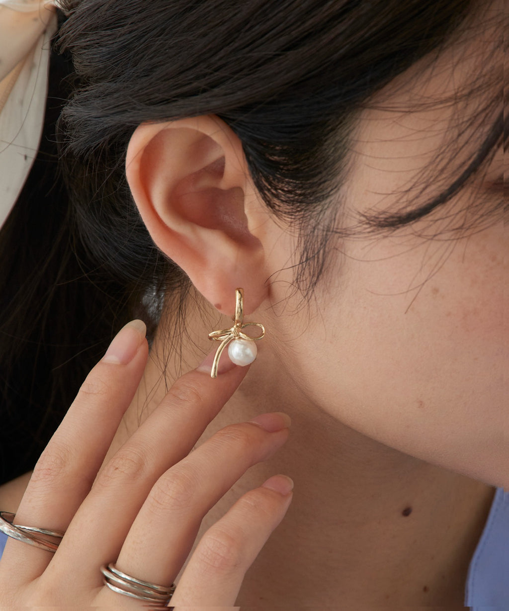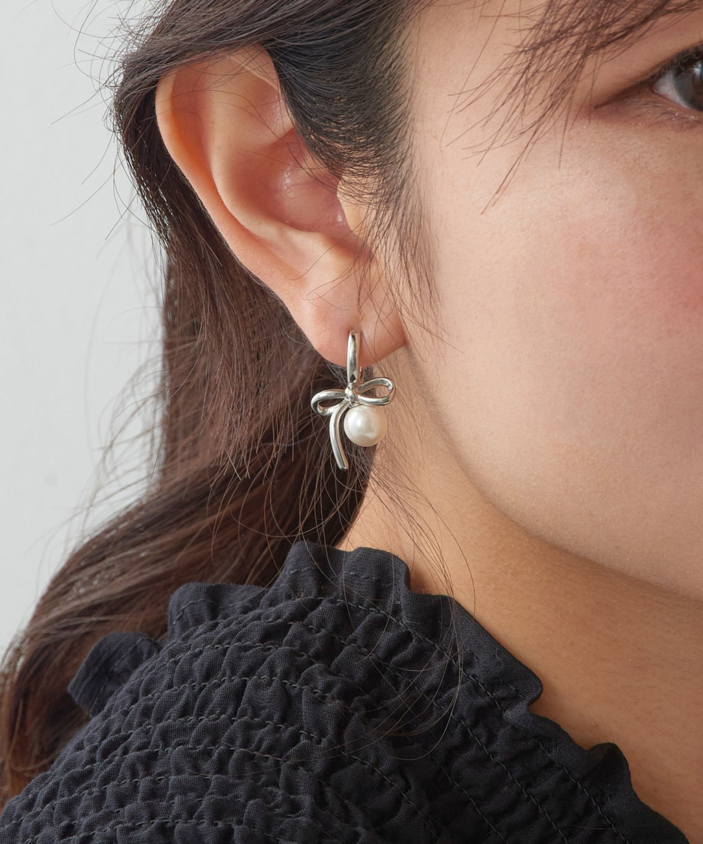 Earrings with a ribbon pearl motif that achieve elegance and cuteness with a restrained sweetness.