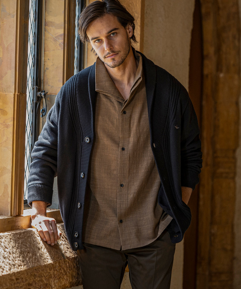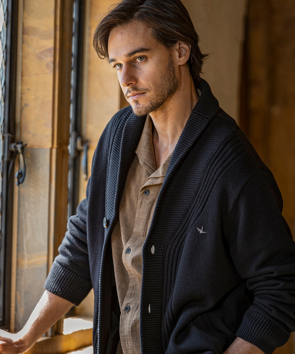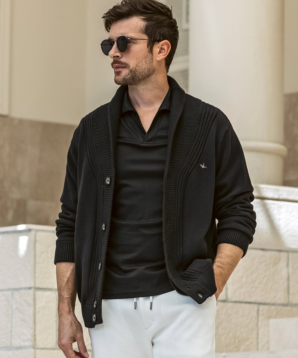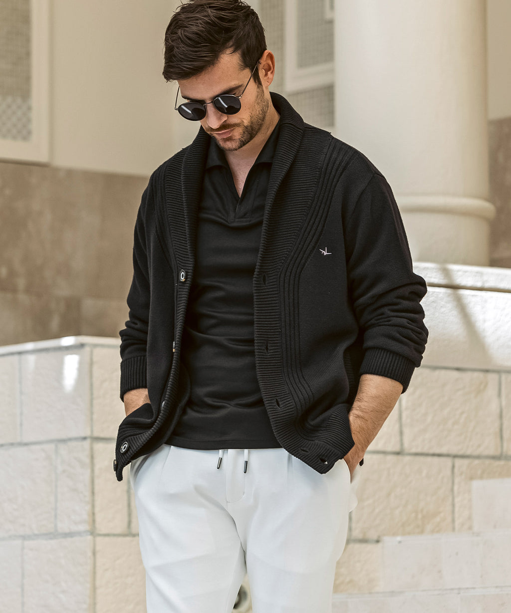 The flowing shawl collar line creates a three-dimensional effect on the chest, elevating the outfit with elegance.