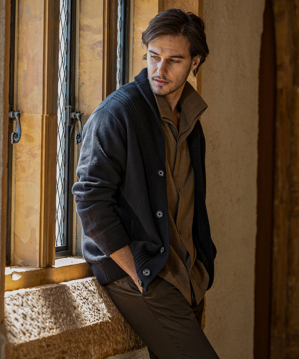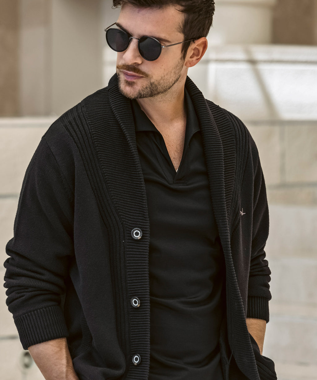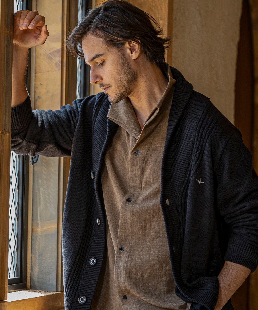 The flowing shawl collar line creates a three-dimensional effect on the chest, elevating the outfit with elegance.